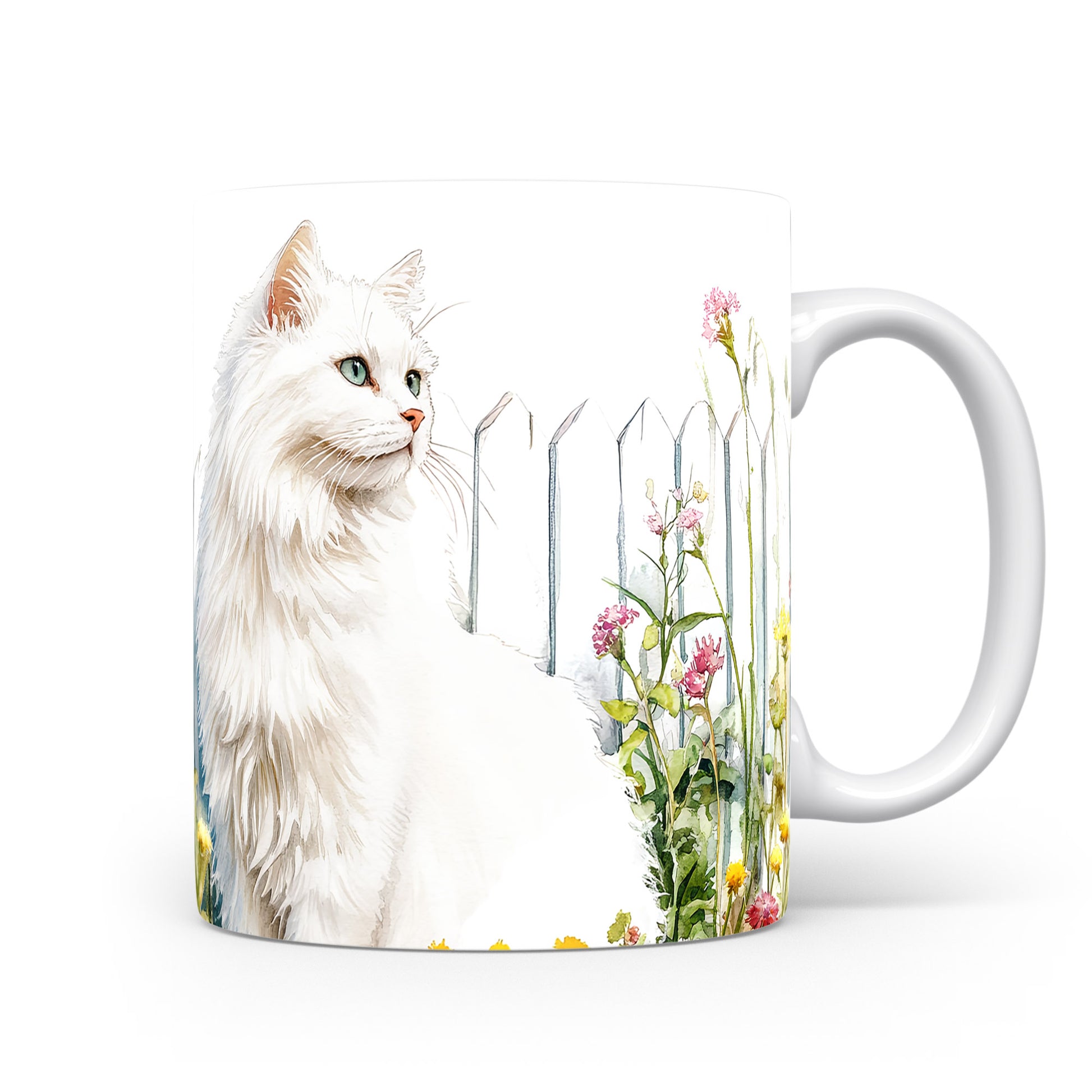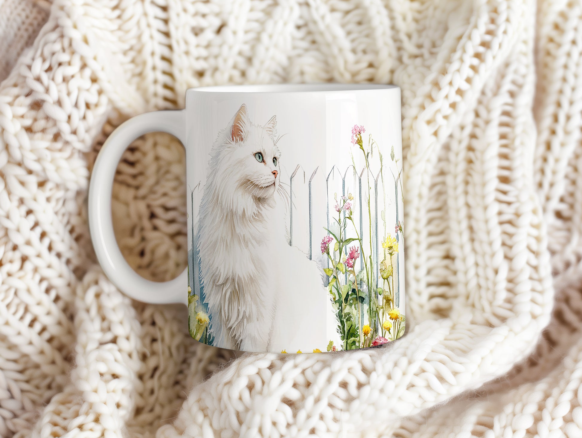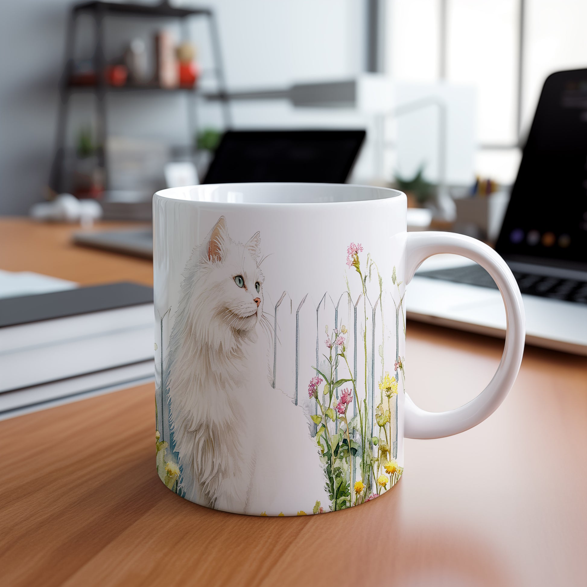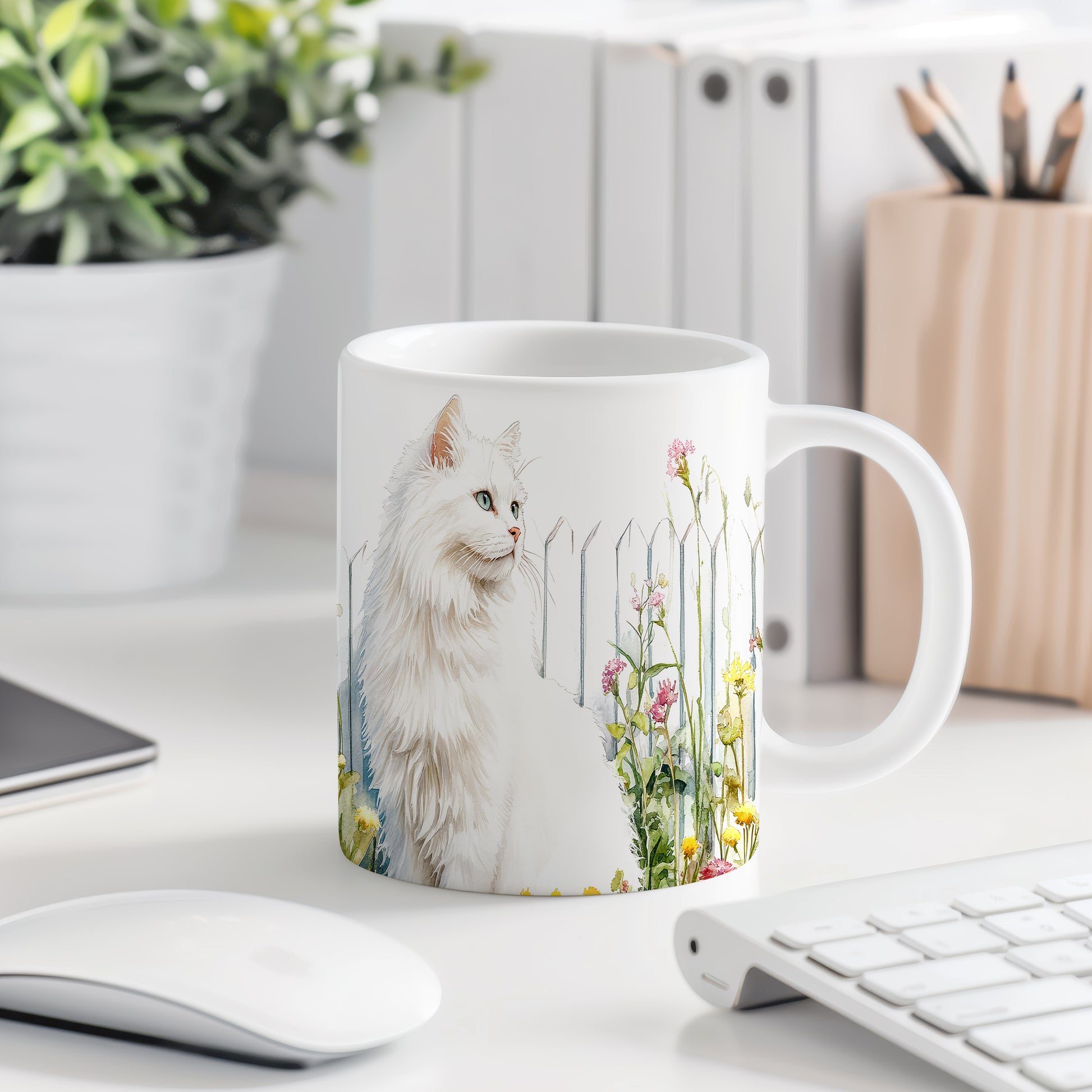 Elegantní hrnek s motivem bílé kočky sedící mezi květinami. Tento hrnek je ideální pro milovníky zvířat a skvělým dárkem pro každého, kdo má rád kočky. Materiál: keramika. Objem: 330 ml. Vhodné do myčky i mikrovlnky. Používání tohoto hrnku přináší radost a útulnost do každého dne.
