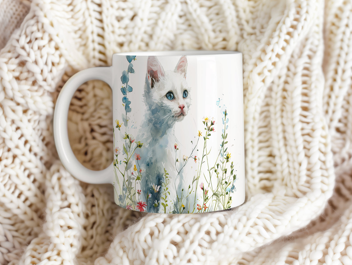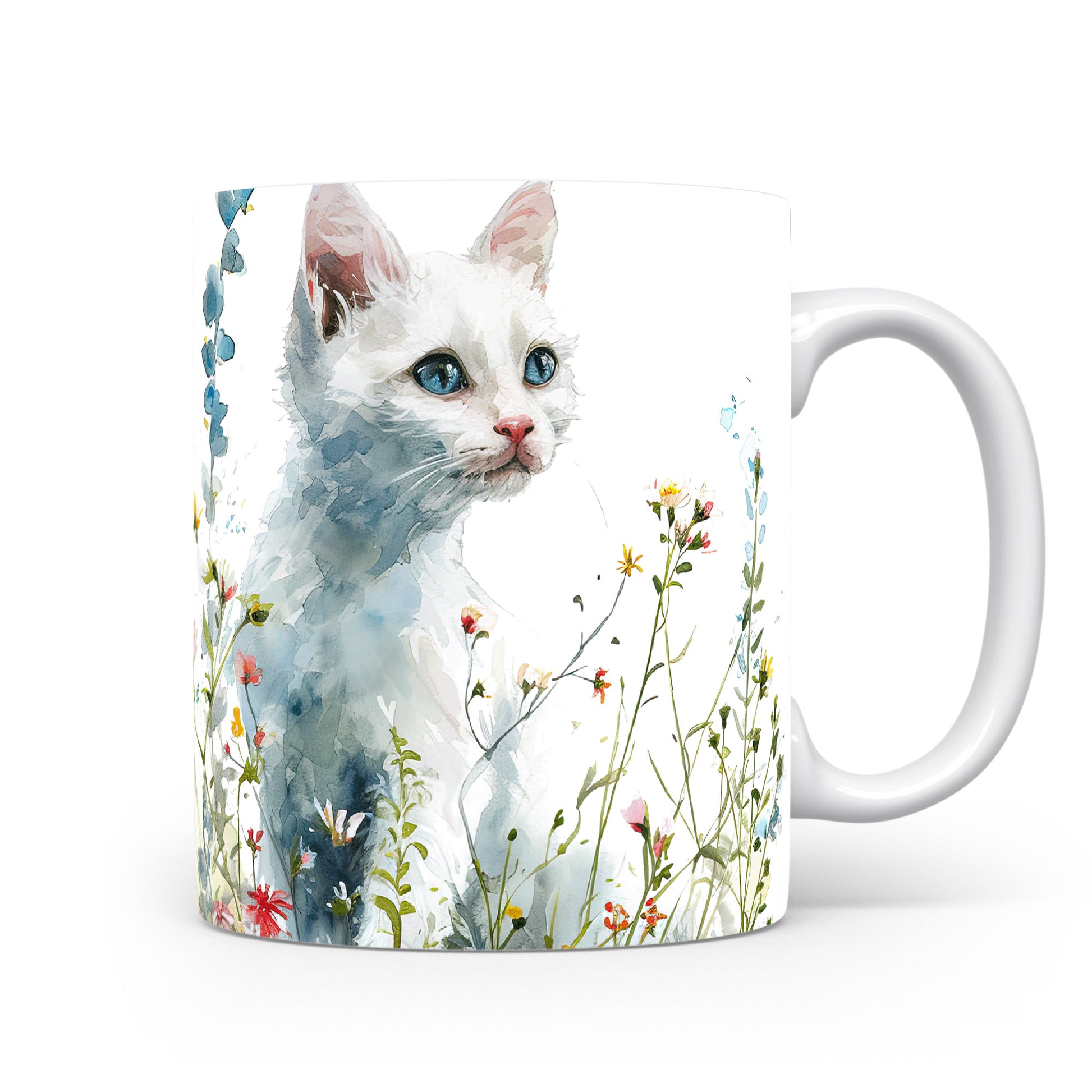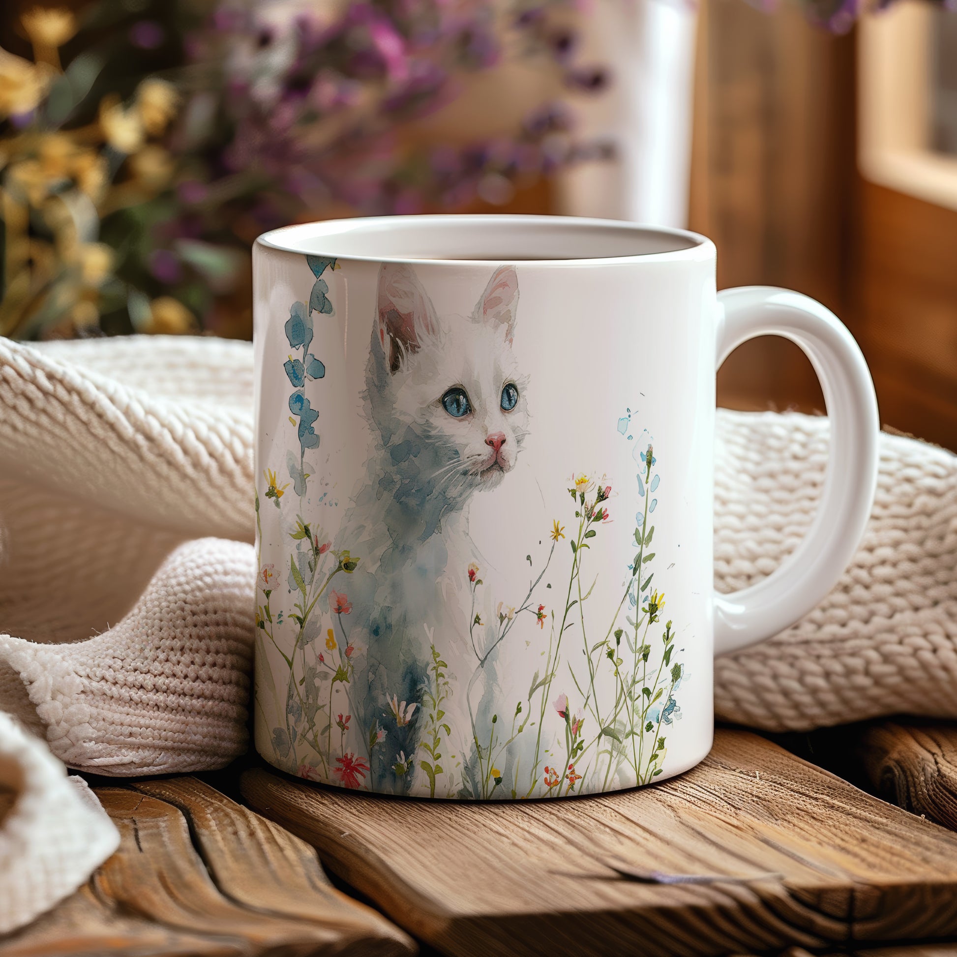 Tento hrnek zobrazuje jemnou akvarelovou ilustraci bílé kočky obklopené barevnými květinami. Je ideální pro milovníky koček a přírody, skvělý tip na dárek pro vaše blízké. Materiál: keramika. Objem: 330 ml. Vhodné do myčky i mikrovlnky. Díky svému designu přináší do každodenního pití radost a pohodu.