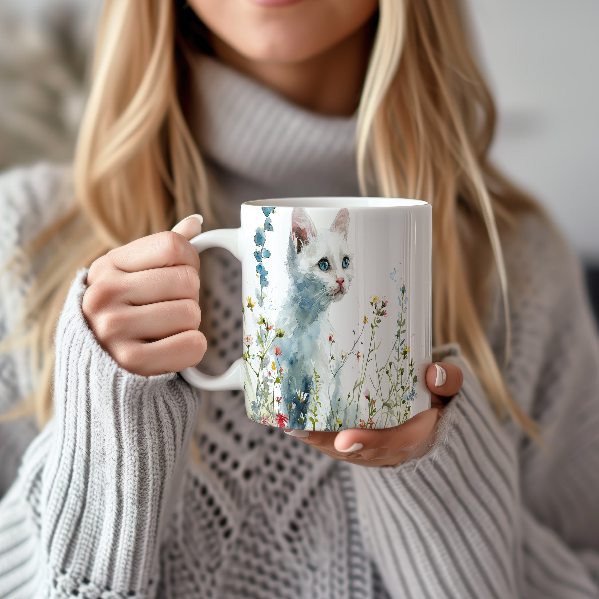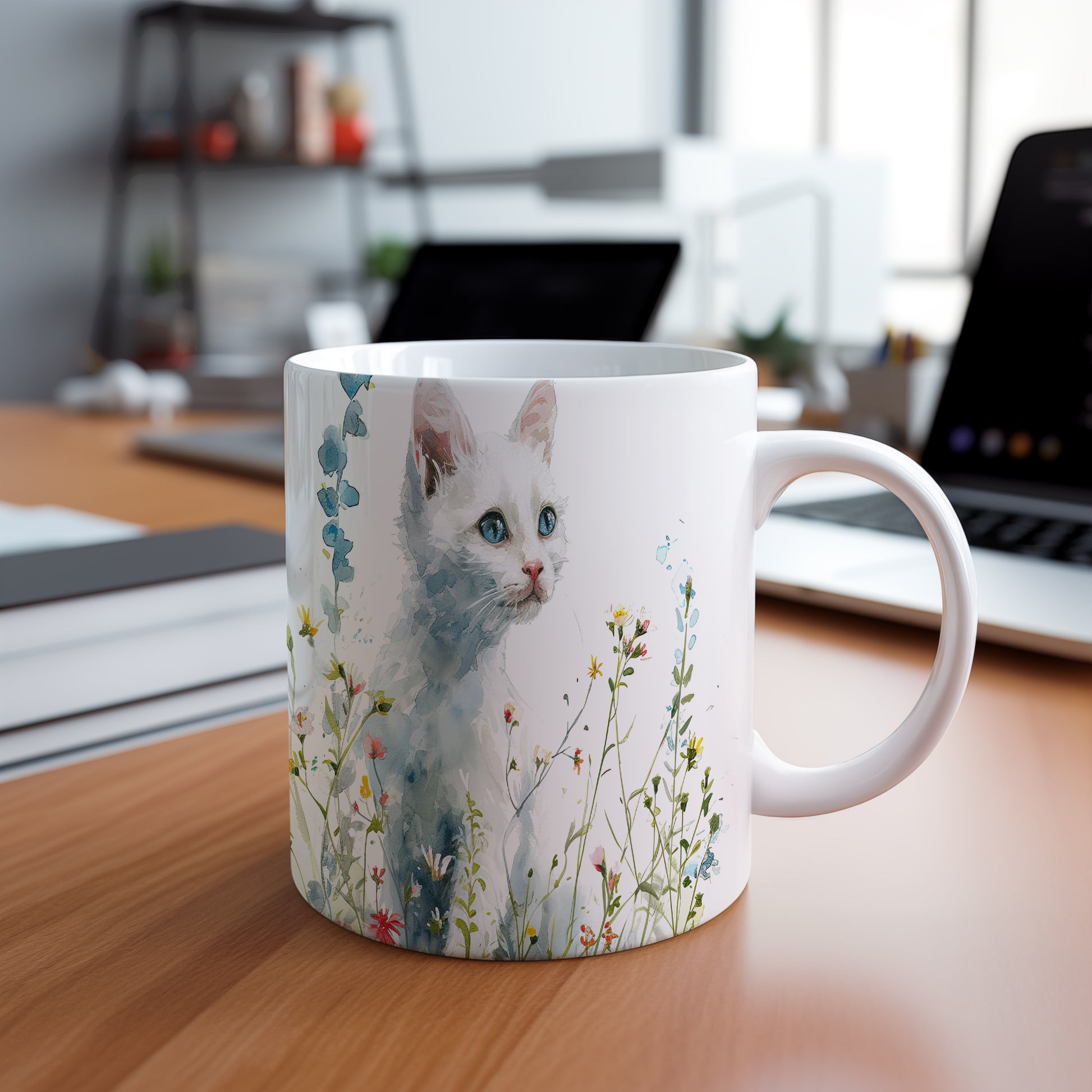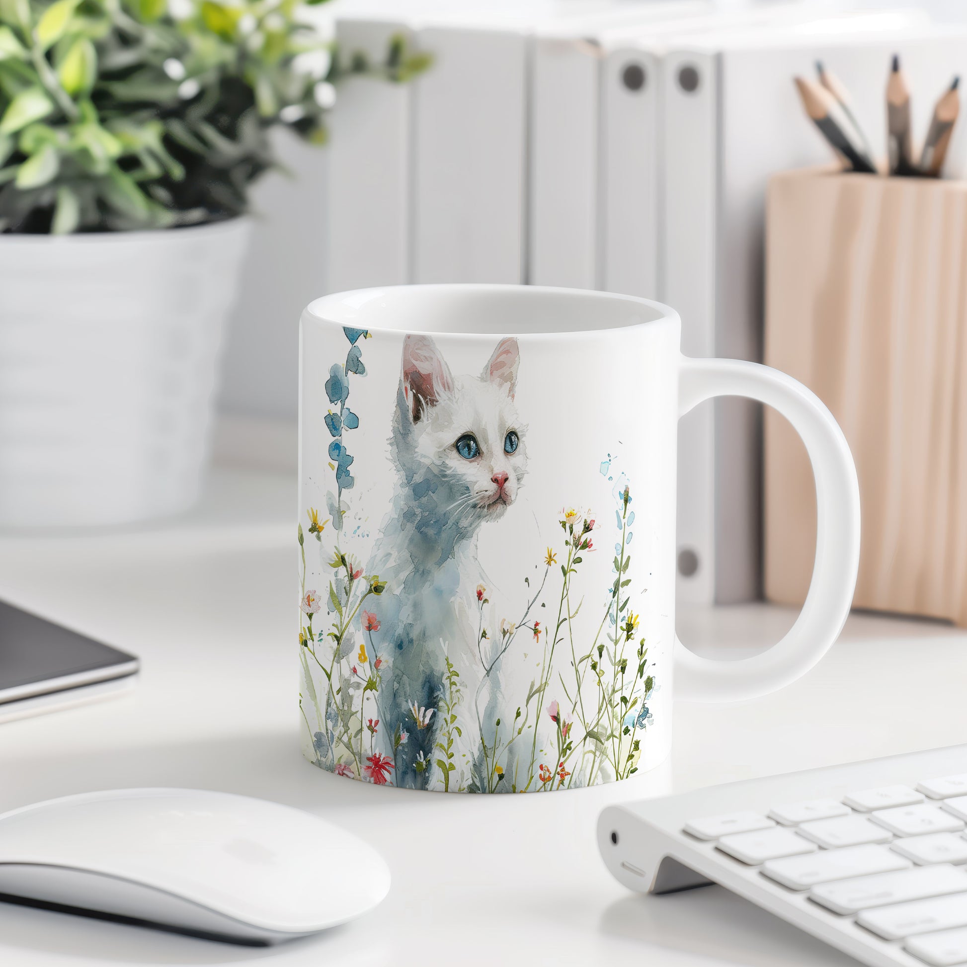 Tento hrnek zobrazuje jemnou akvarelovou ilustraci bílé kočky obklopené barevnými květinami. Je ideální pro milovníky koček a přírody, skvělý tip na dárek pro vaše blízké. Materiál: keramika. Objem: 330 ml. Vhodné do myčky i mikrovlnky. Díky svému designu přináší do každodenního pití radost a pohodu.