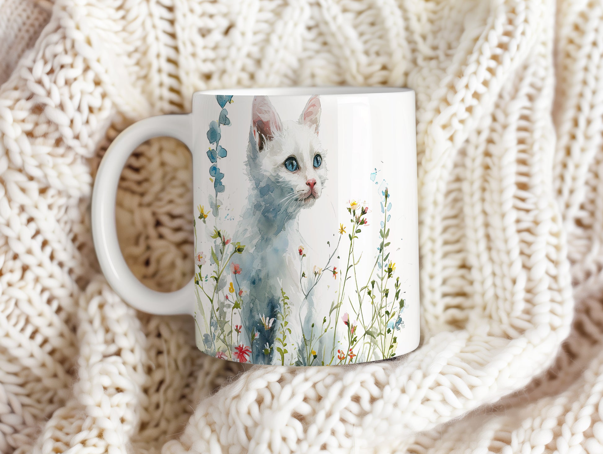 Hrnek s bílou kočkou v květinách