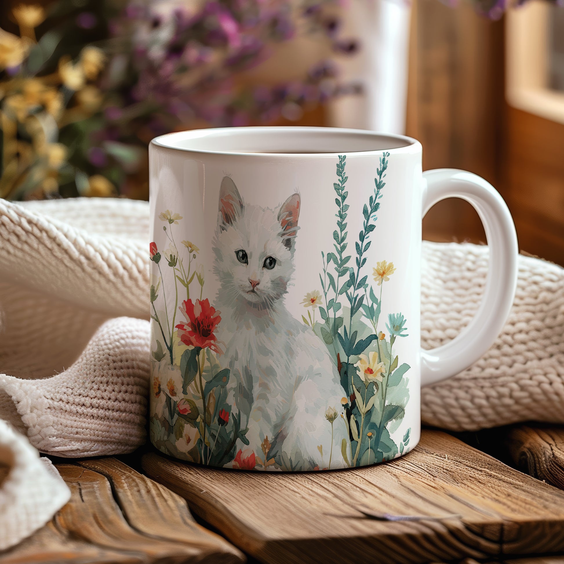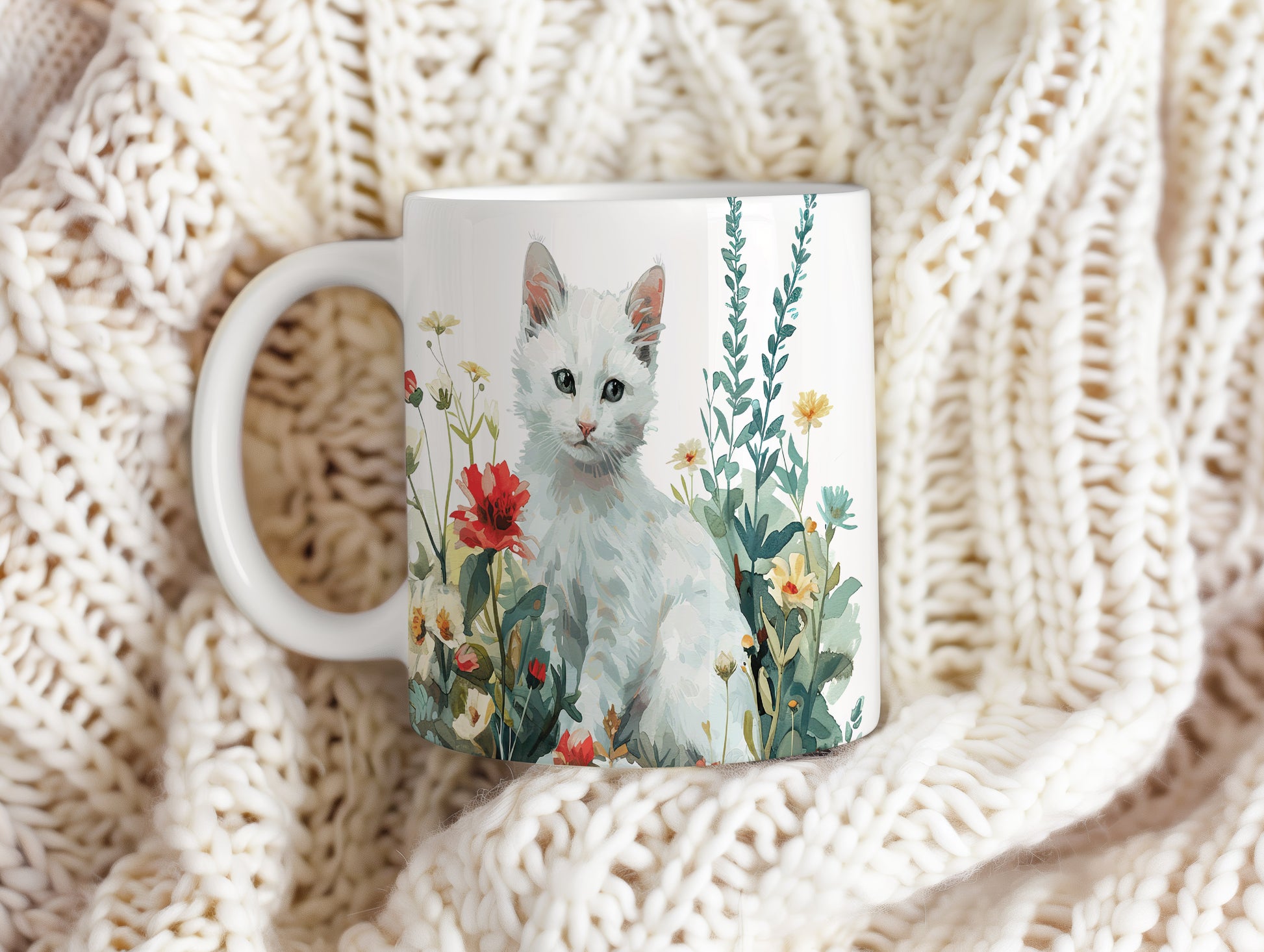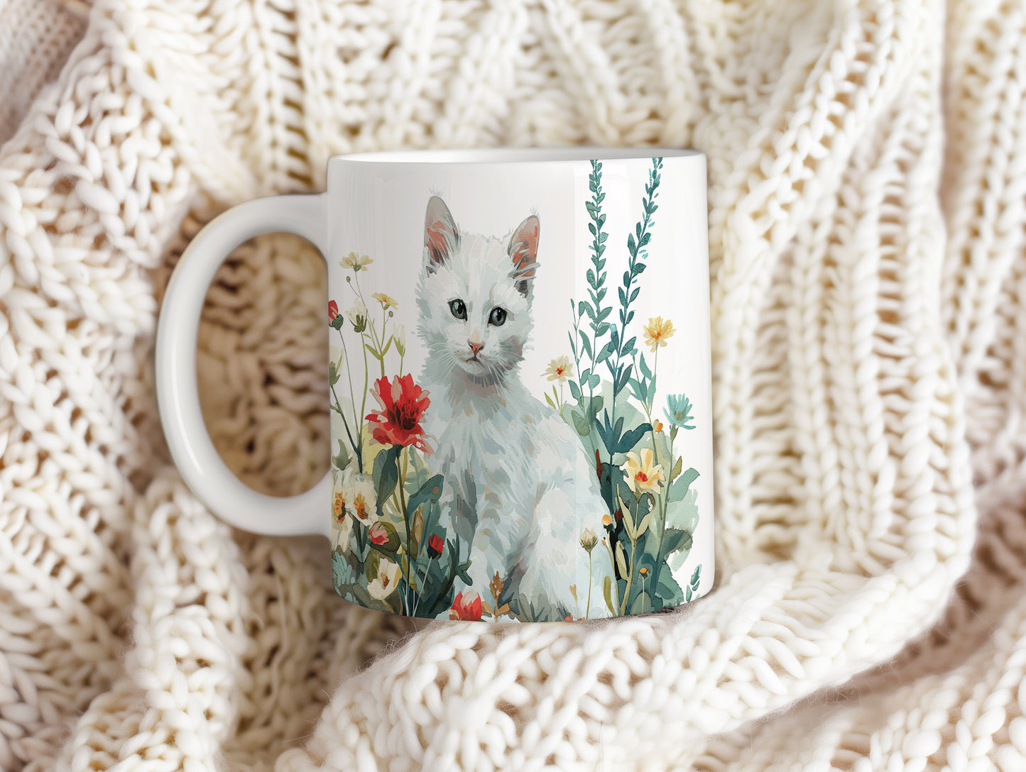 Hrnek s bílou kočkou v květinách – bílým provedením