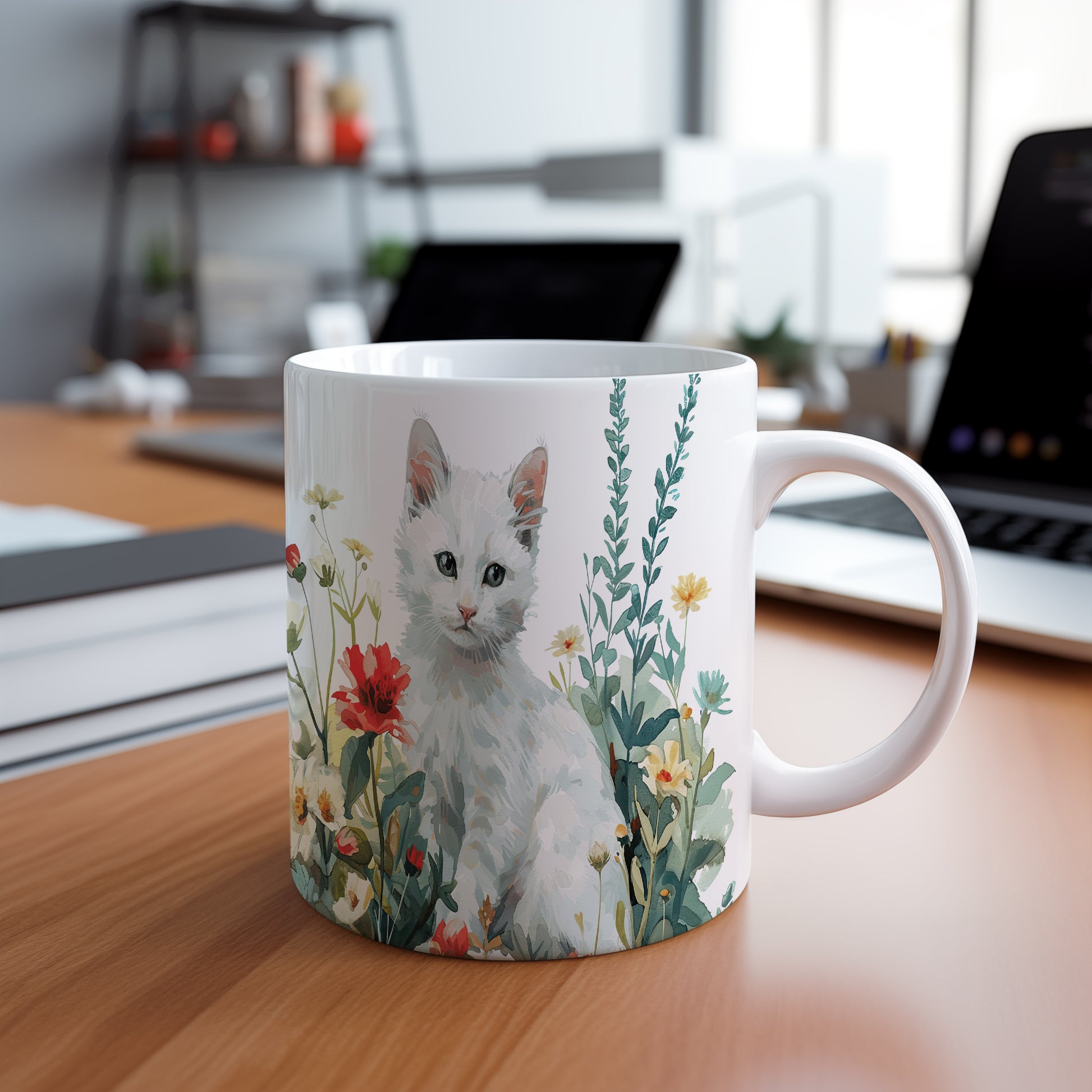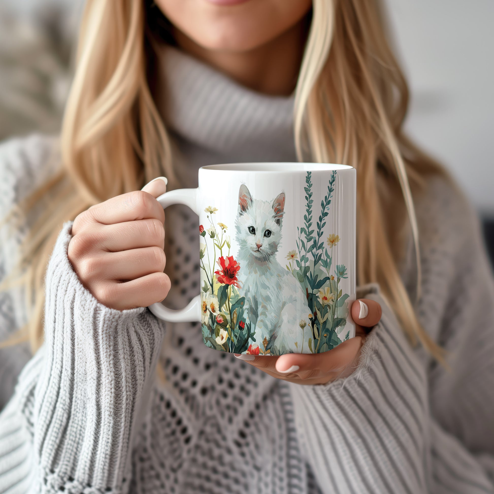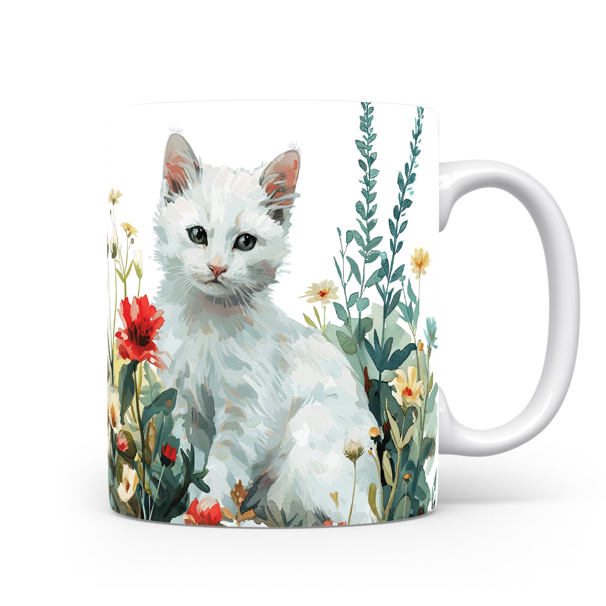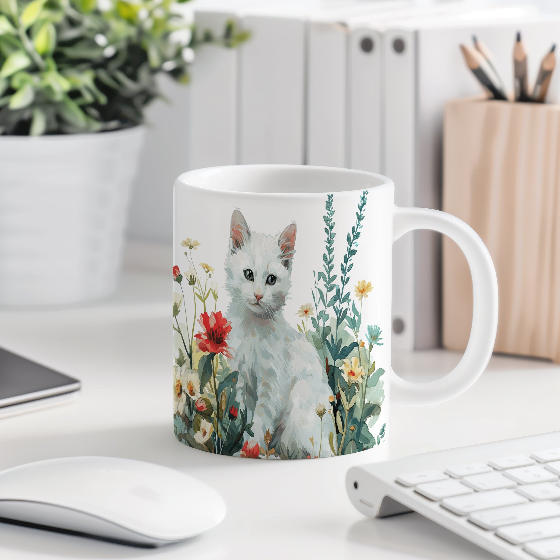 Hrnek s bílou kočkou v květinách – bílým provedením