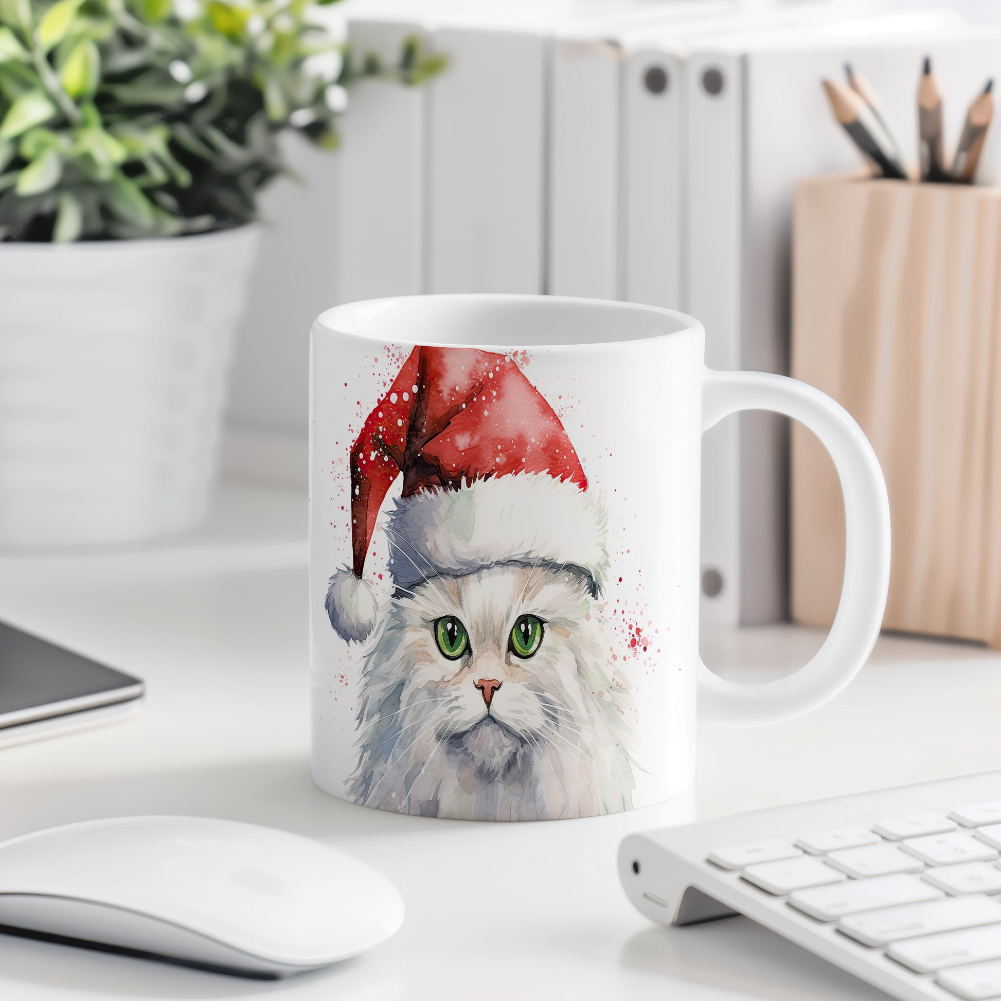 Stylový hrnek s motivem bílé kočky v čepici Santa. Tento hrnek je skvělým dárkem pro milovníky koček a vánoční atmosféry. Materiál: keramika. Objem: 330 ml. Vhodné do myčky i mikrovlnky. Užívejte si svůj oblíbený nápoj s tímto originálním kouskem.