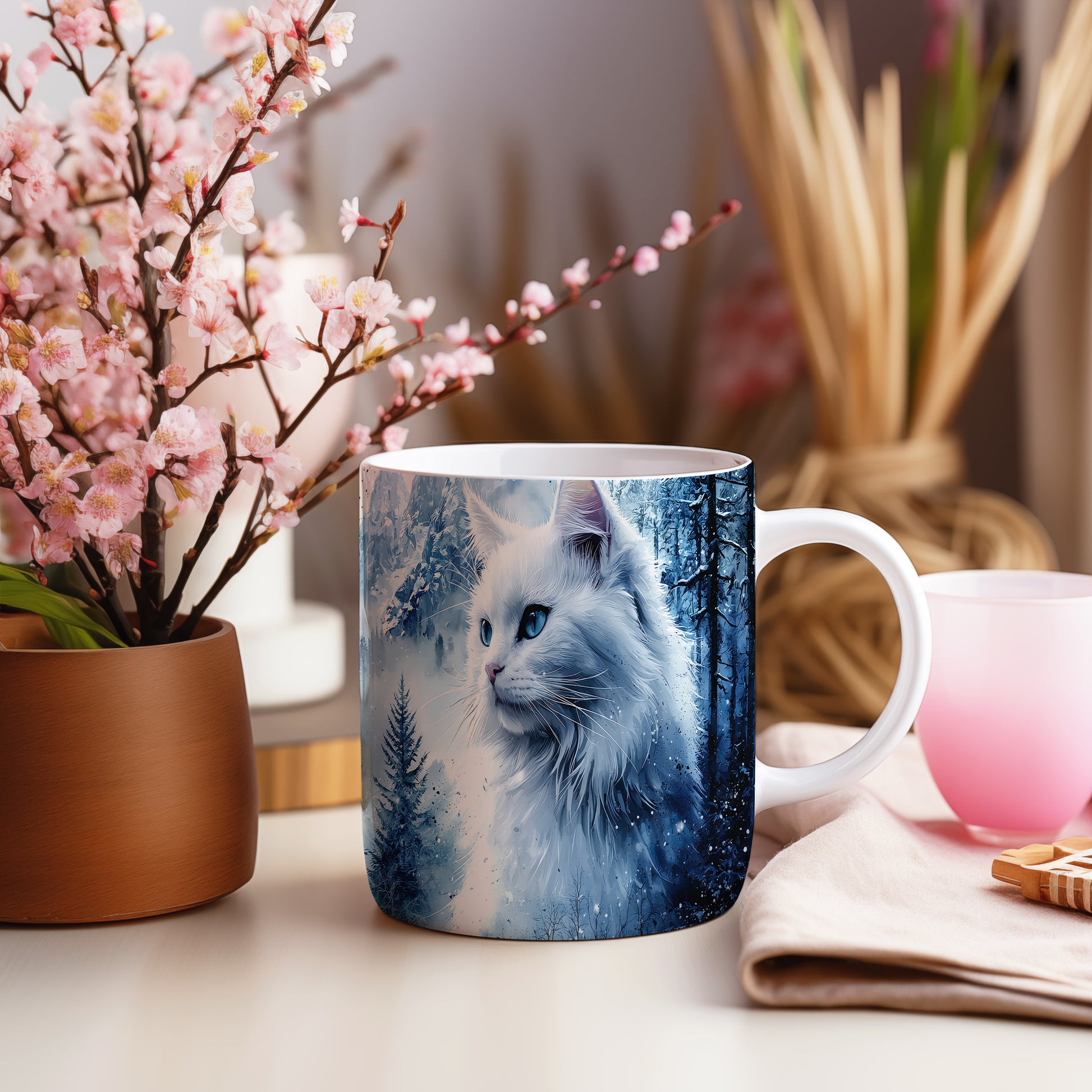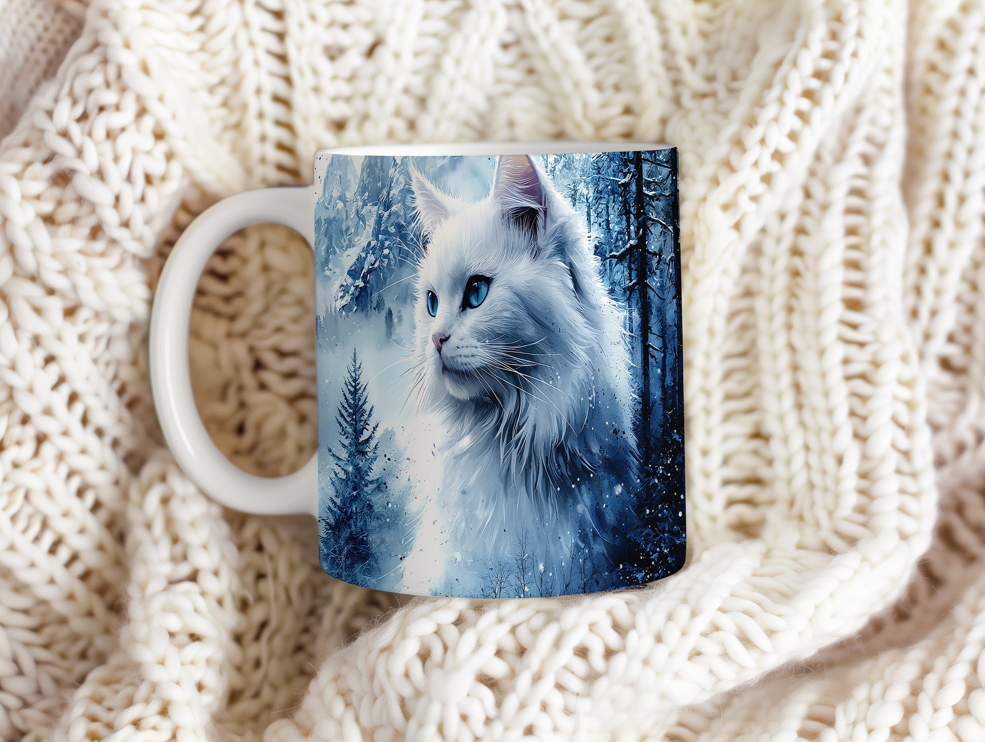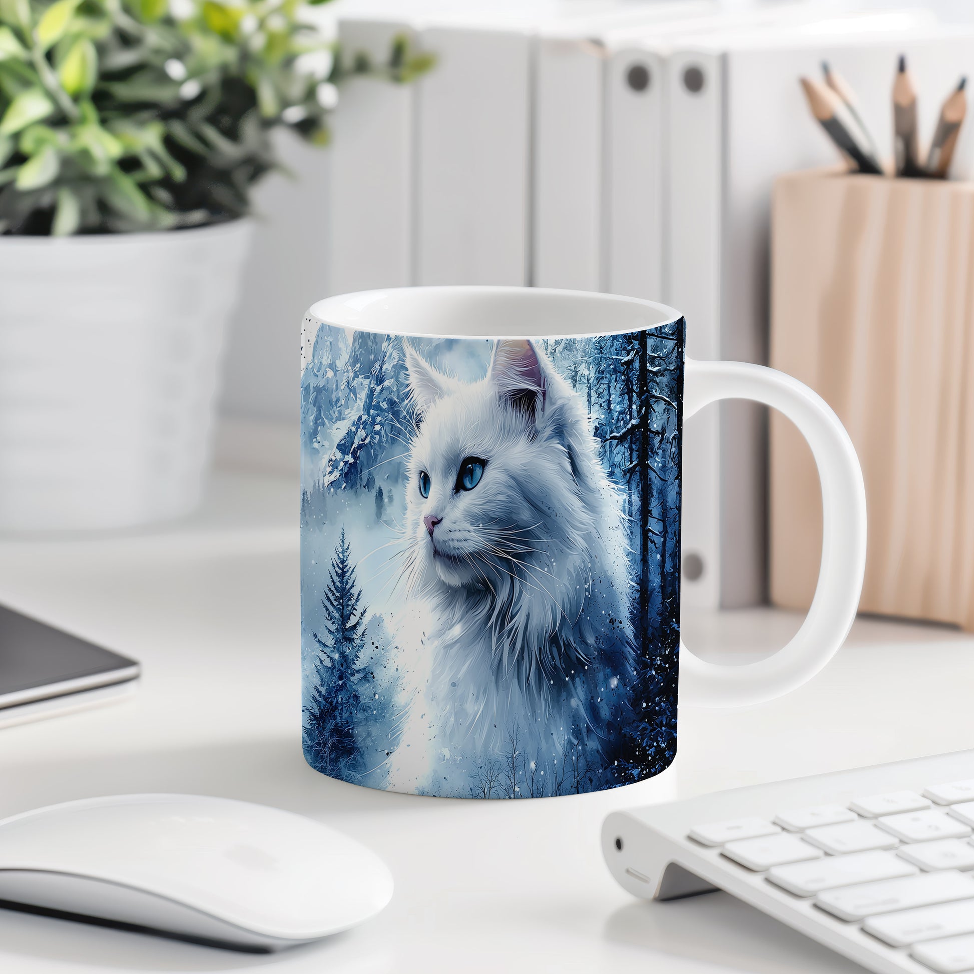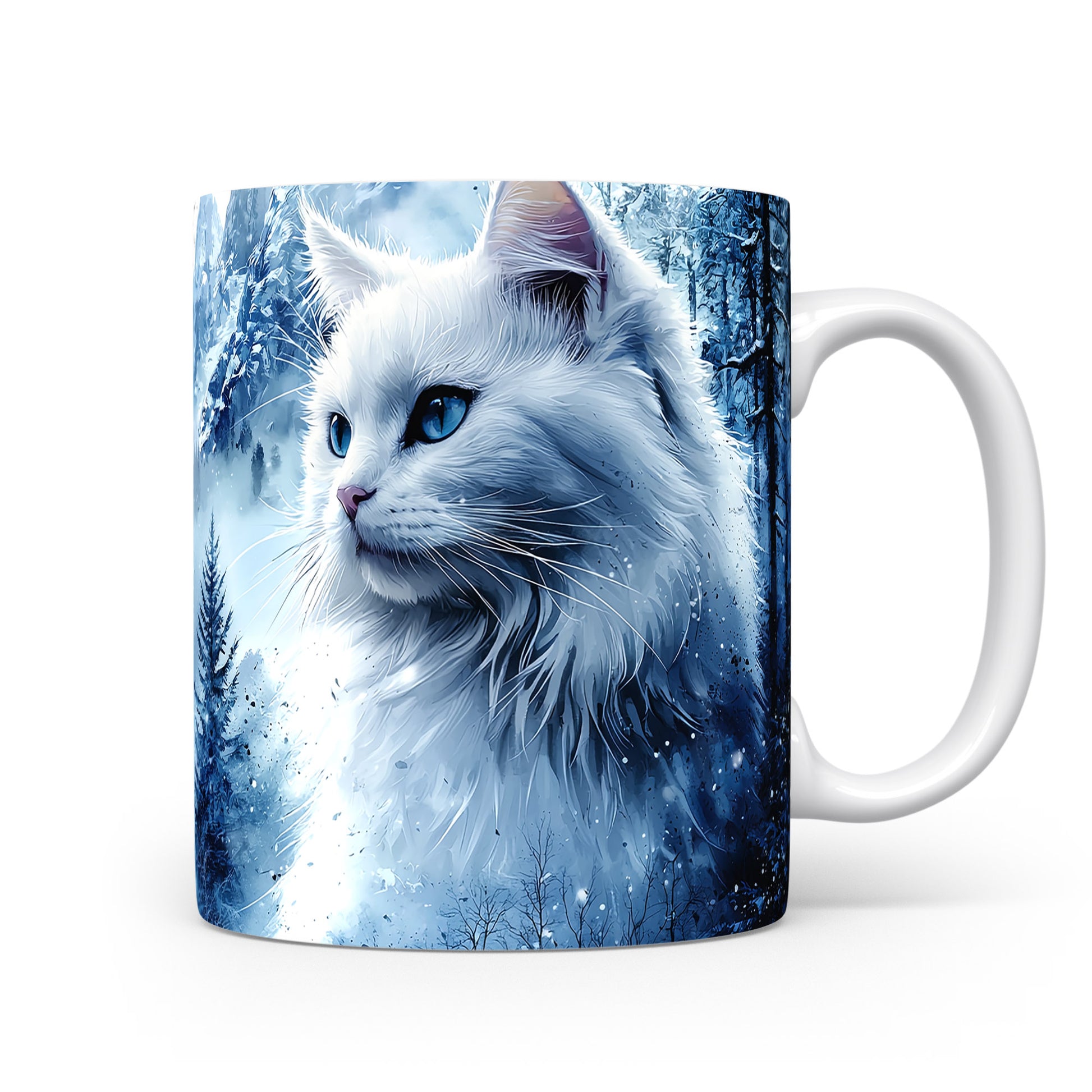 Hrnek s bílou kočkou v zimní scenérii