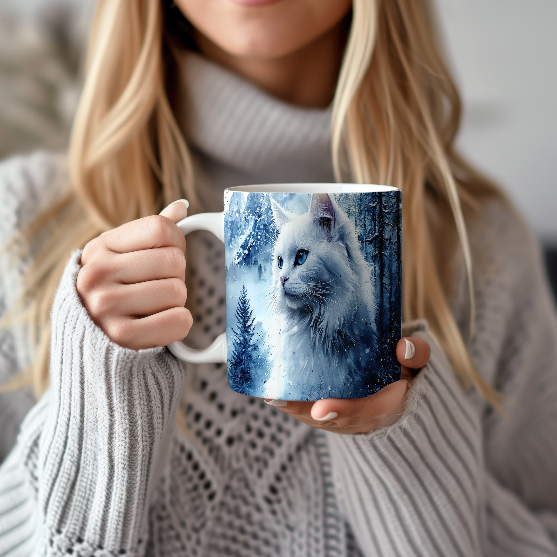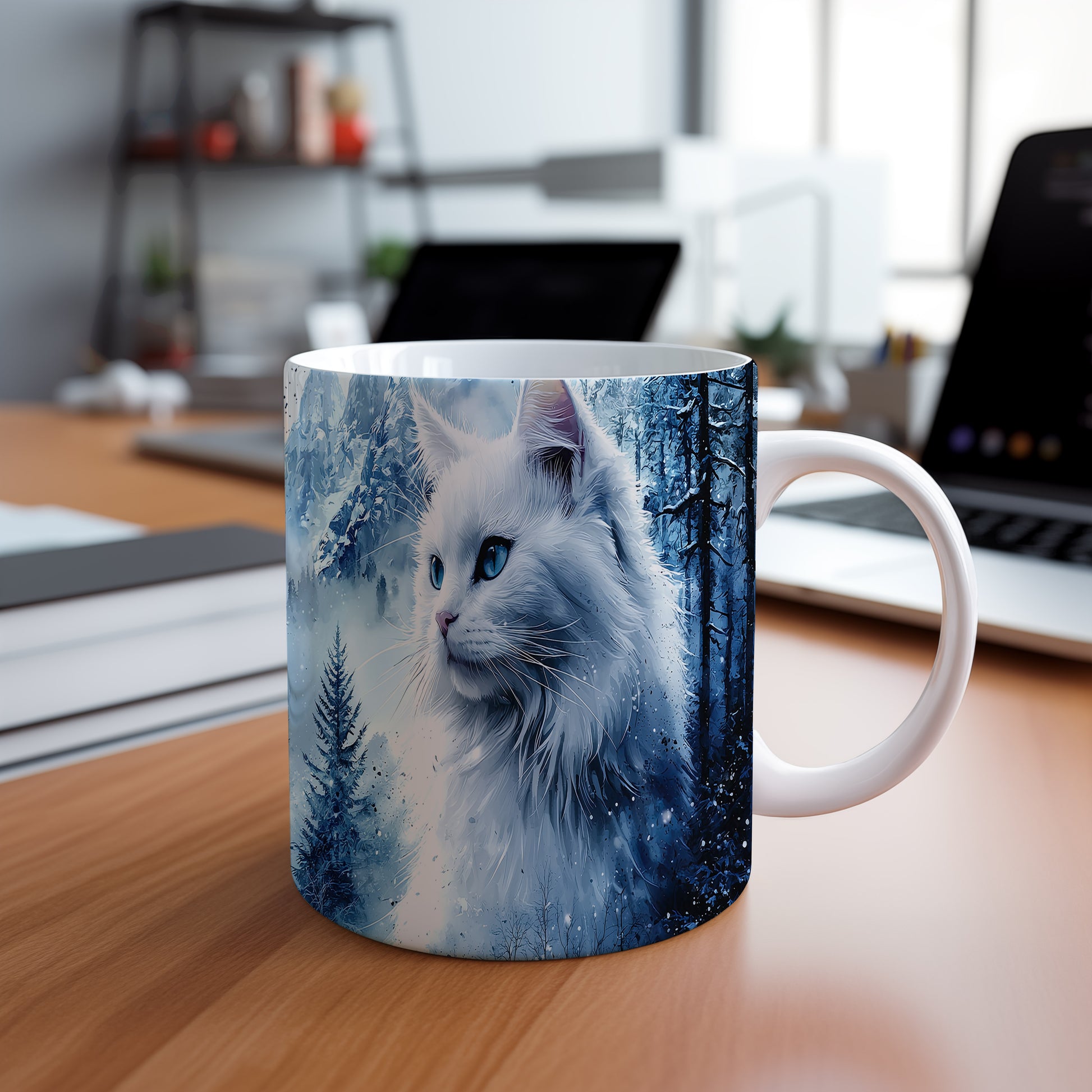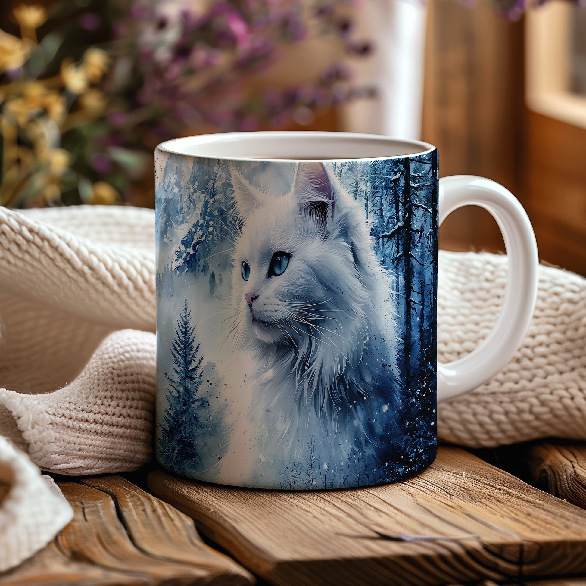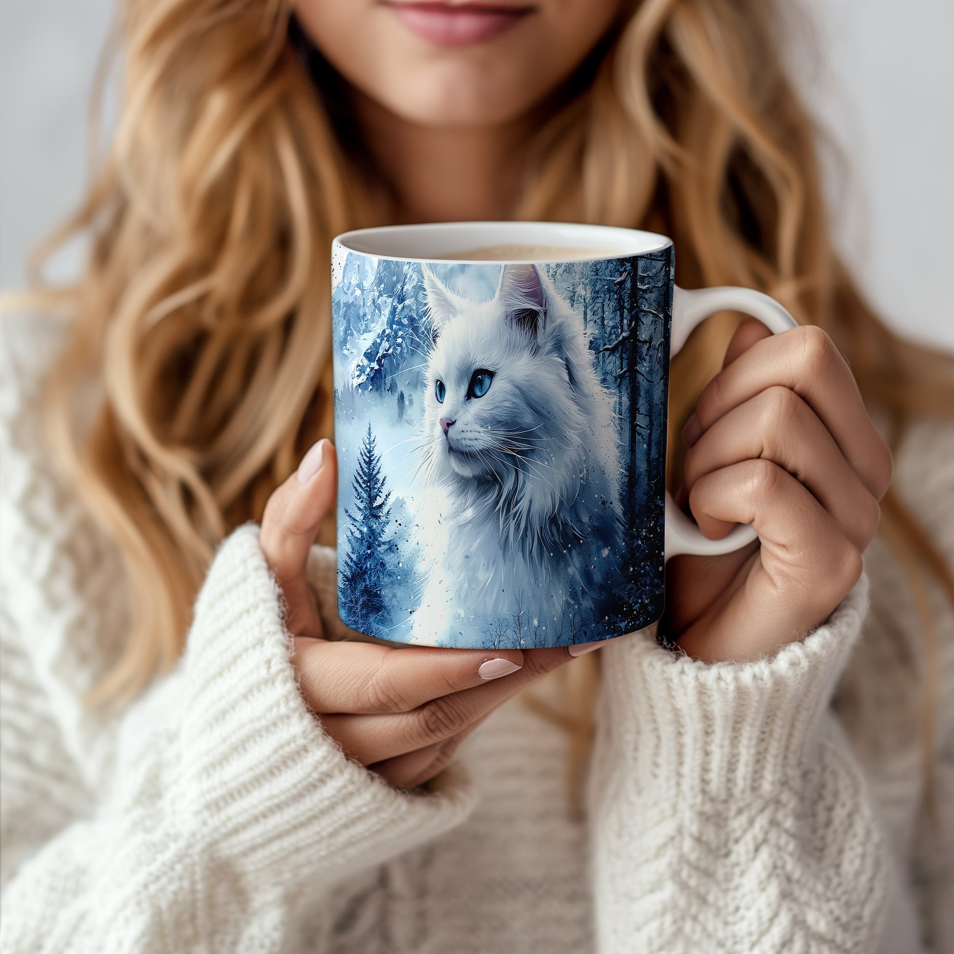 Hrnek s bílou kočkou v zimní scenérii