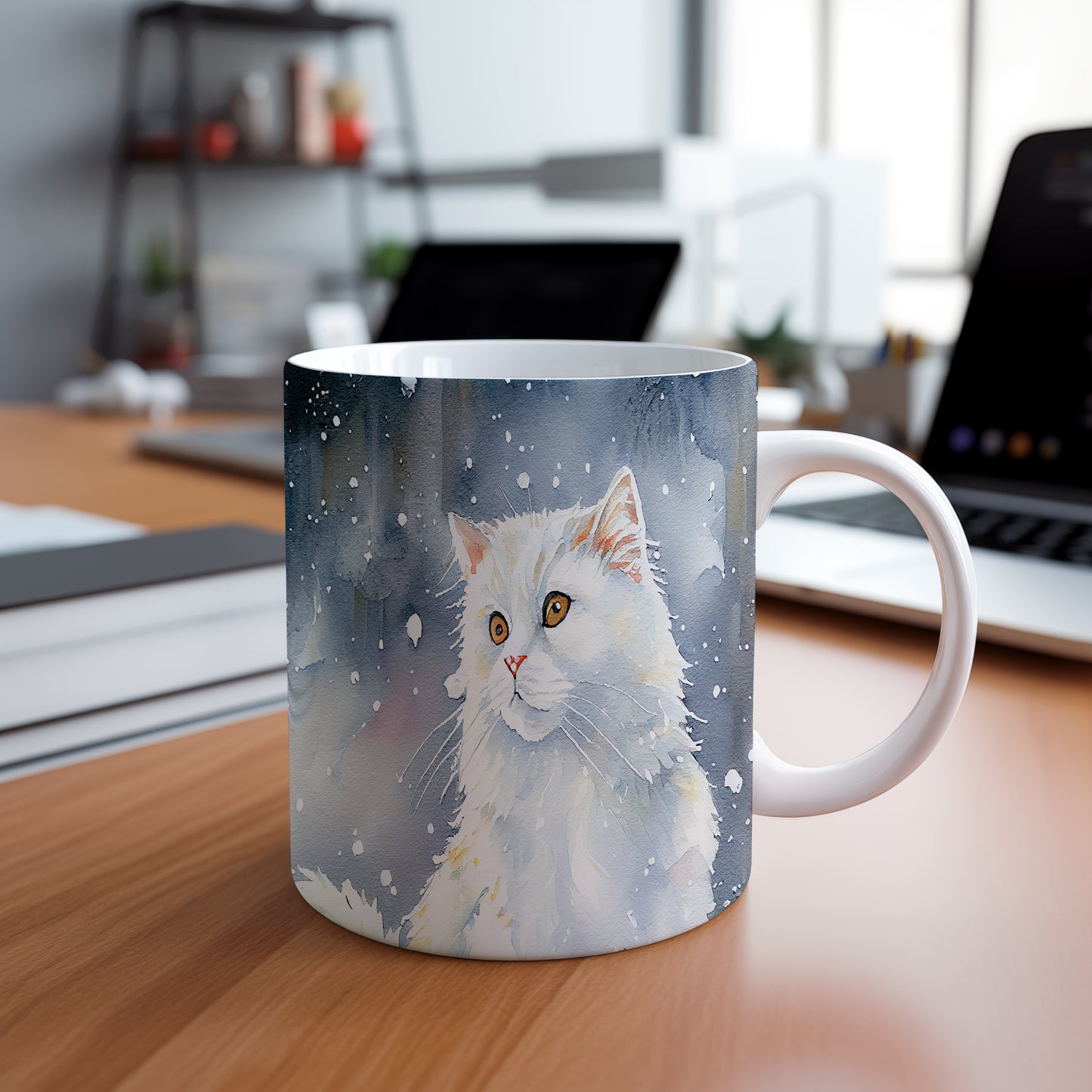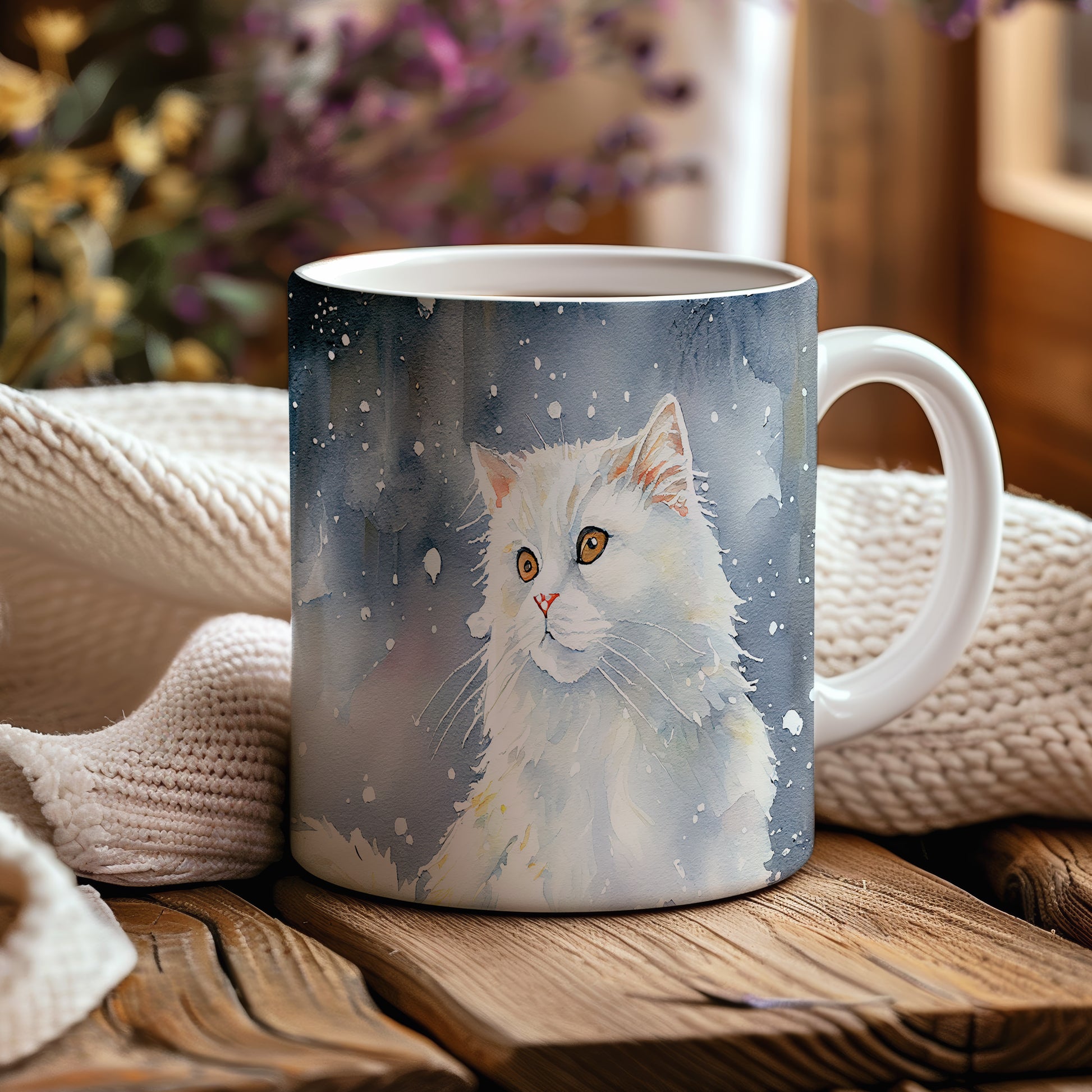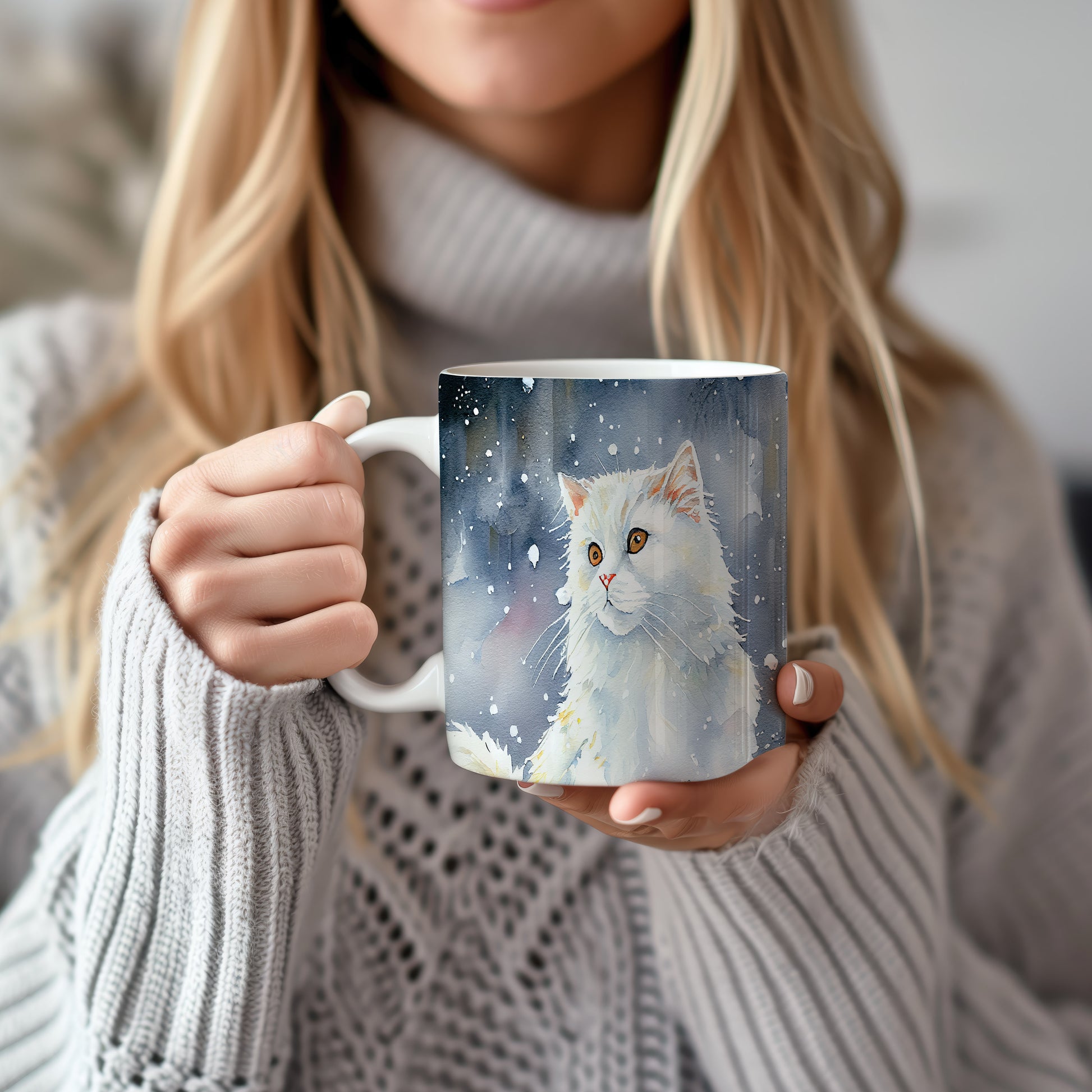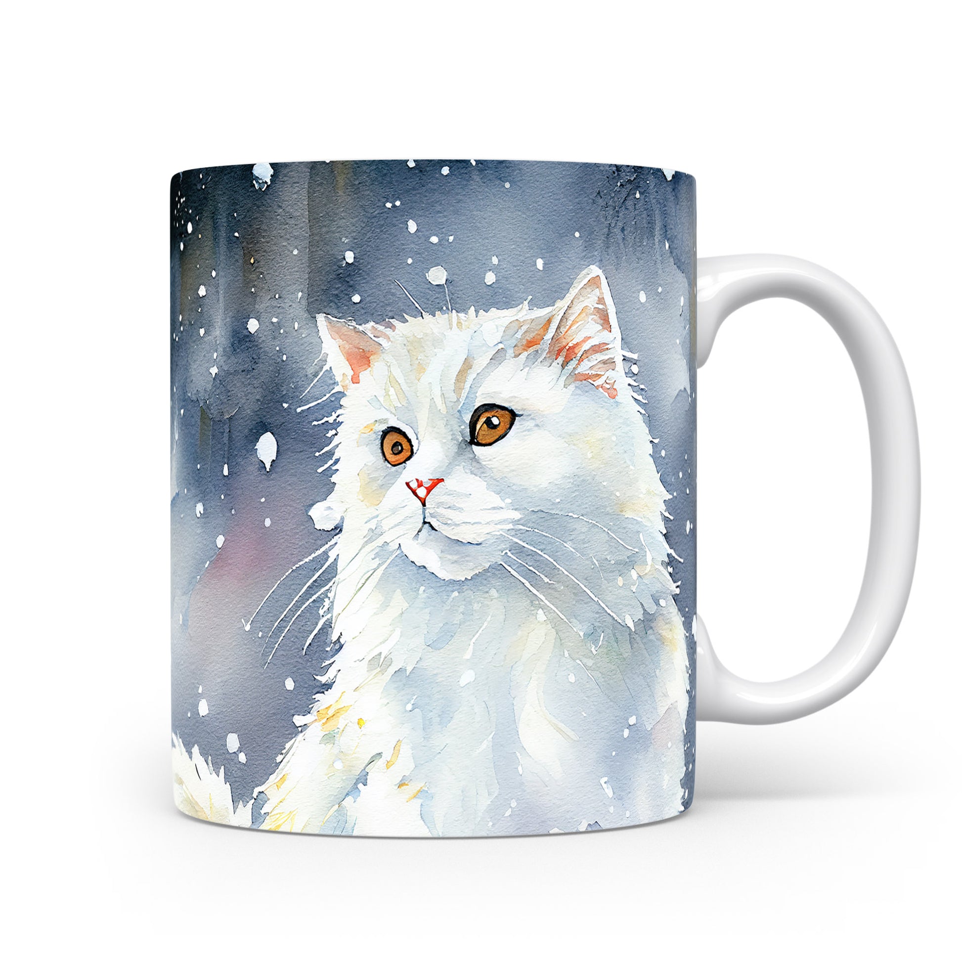 Tento keramický hrnek zobrazuje bílou kočku v zasněžené krajině. Je ideální pro milovníky koček a zimních scenérií, skvělý tip na dárek pro přátele nebo rodinu. Materiál: keramika. Objem: 330 ml. Vhodné do myčky i mikrovlnky. Užívejte si svůj oblíbený nápoj s tímto hrnkem, který přináší útulnou atmosféru zimních dnů.
