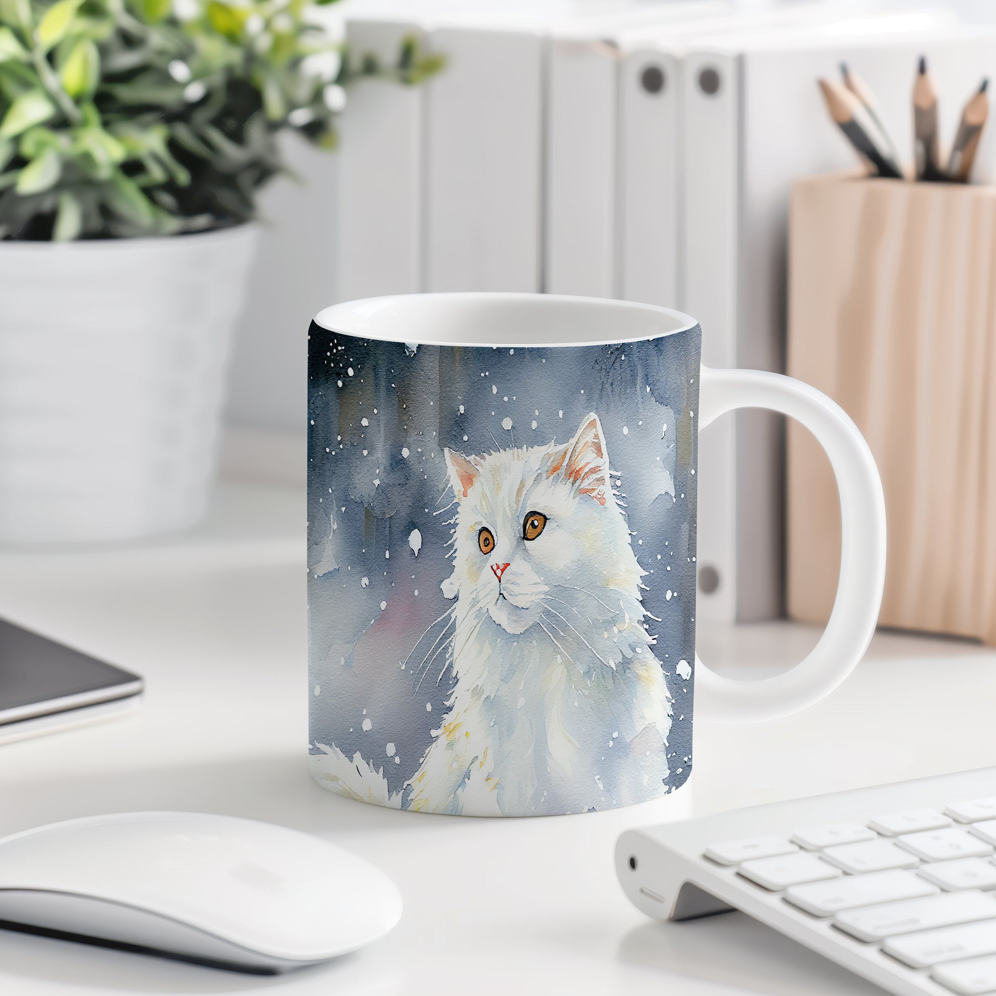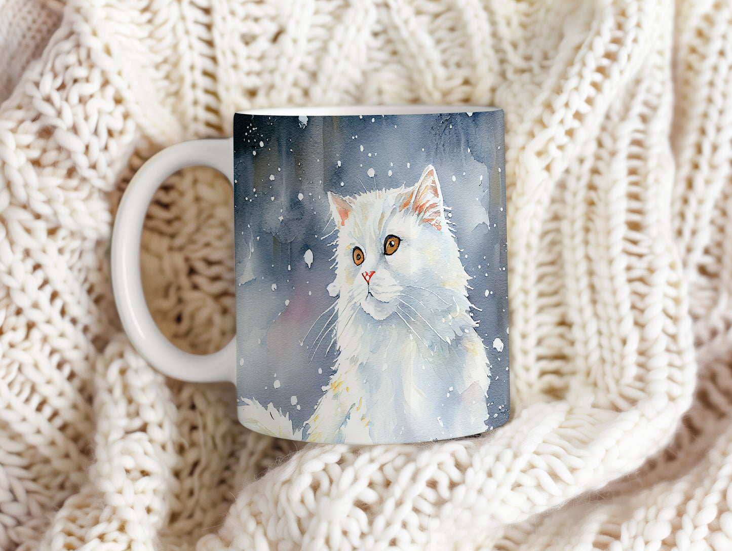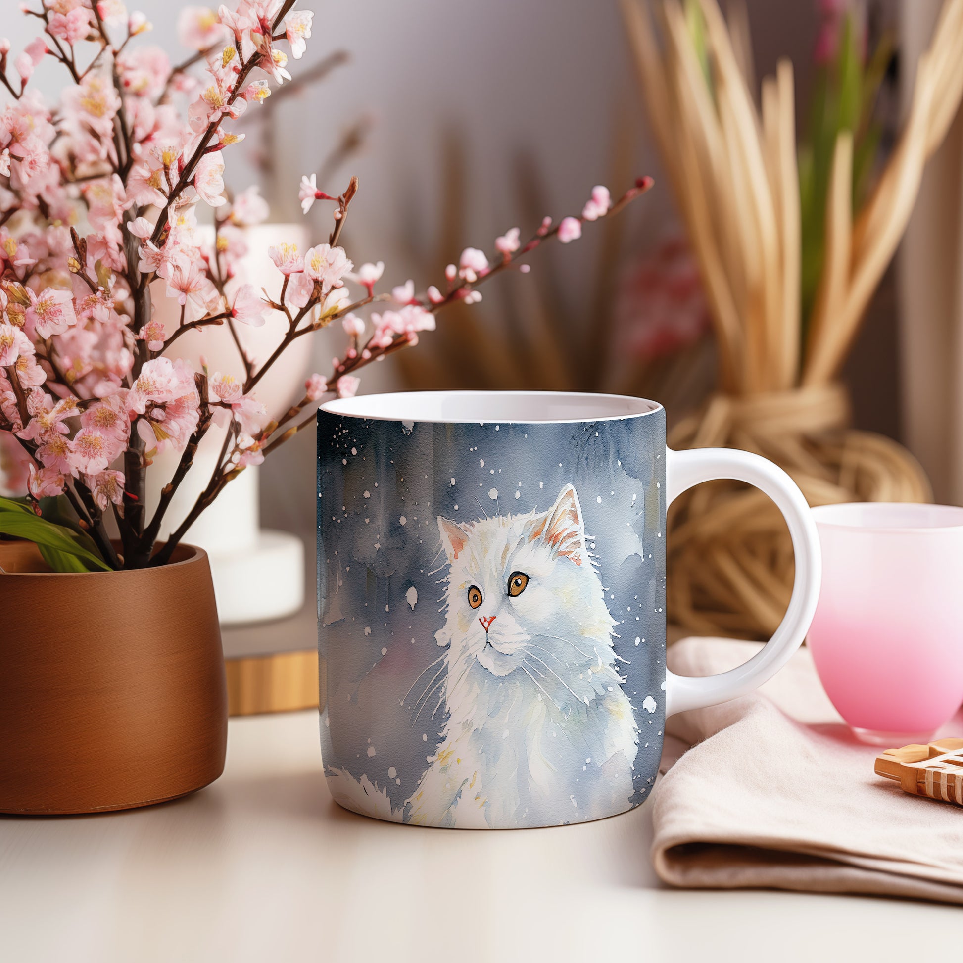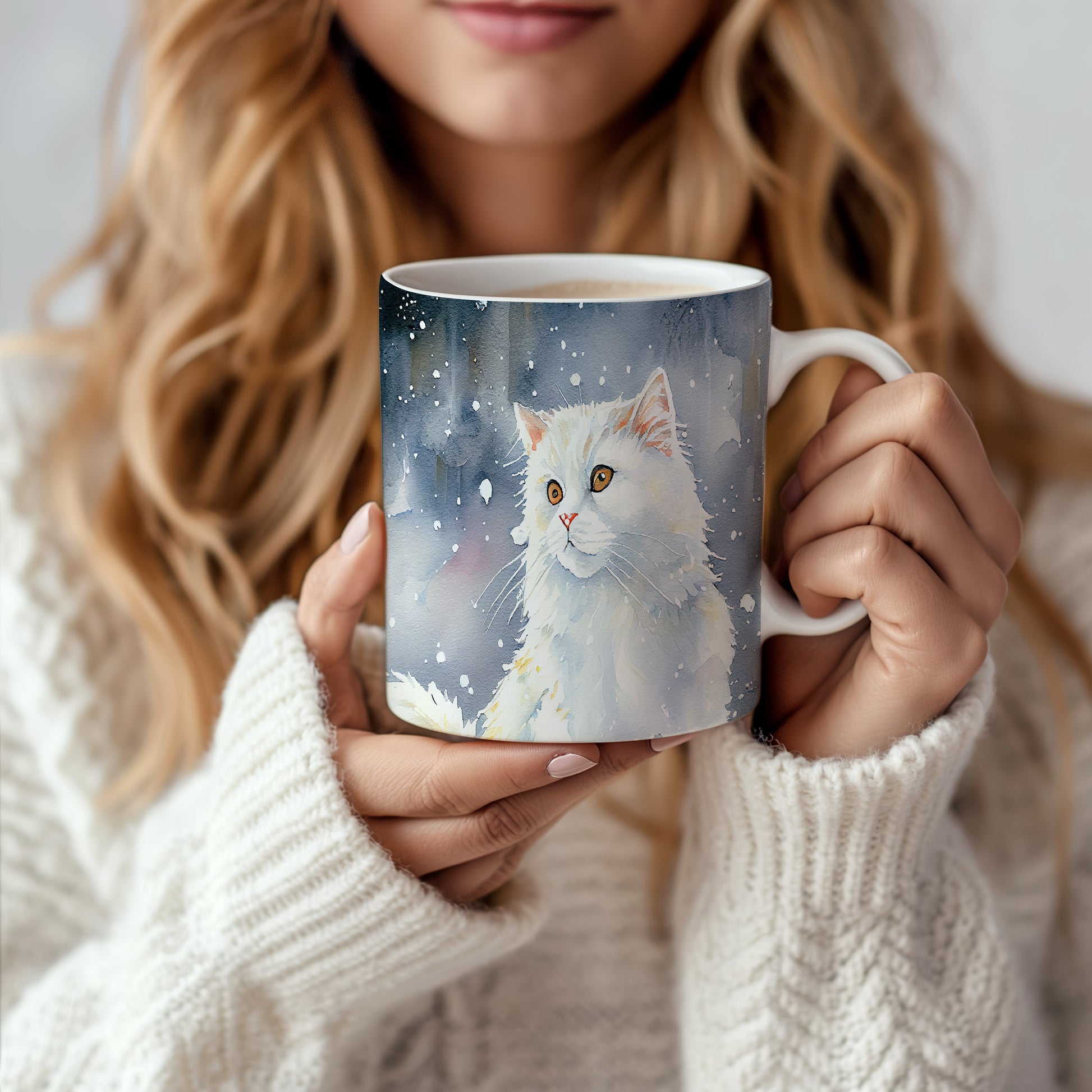 Tento keramický hrnek zobrazuje bílou kočku v zasněžené krajině. Je ideální pro milovníky koček a zimních scenérií, skvělý tip na dárek pro přátele nebo rodinu. Materiál: keramika. Objem: 330 ml. Vhodné do myčky i mikrovlnky. Užívejte si svůj oblíbený nápoj s tímto hrnkem, který přináší útulnou atmosféru zimních dnů.