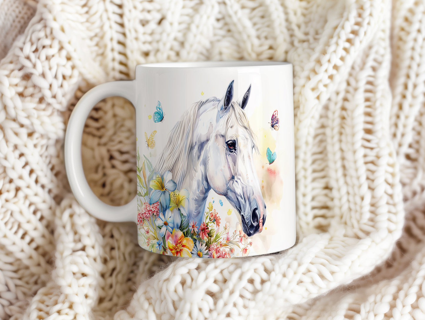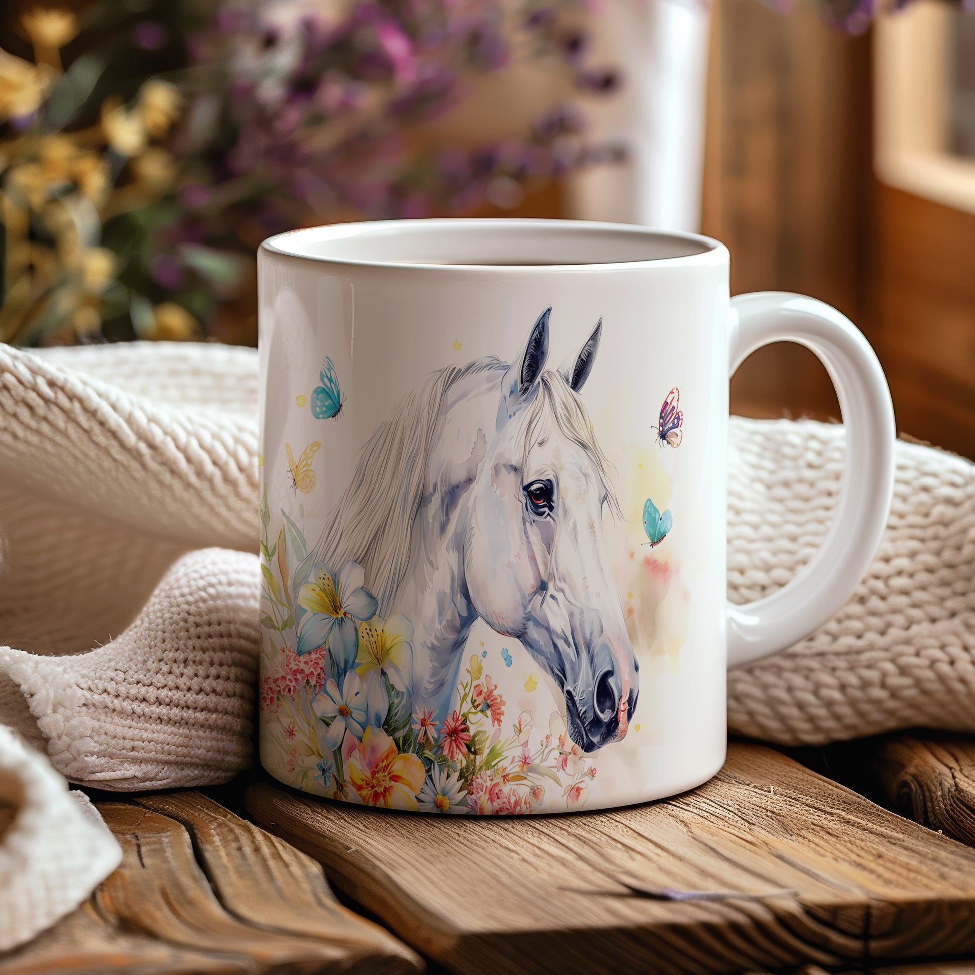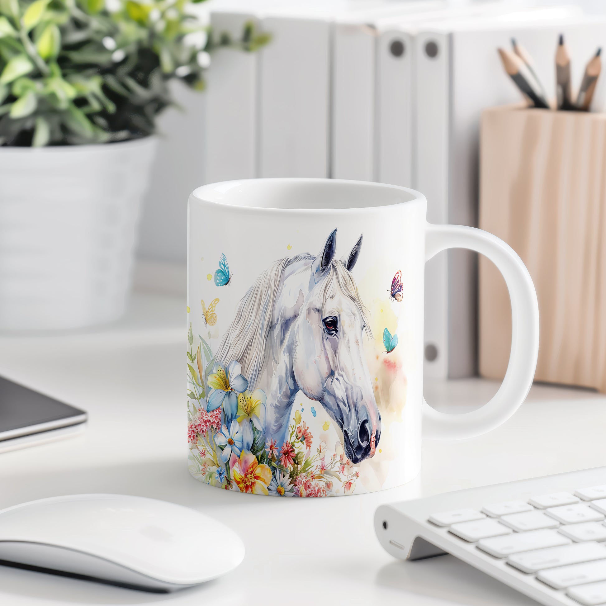 Keramický hrnek s realistickým motivem bílého koně, obklopeného barevnými květinami. Tento hrnek je skvělým dárkem pro milovníky koní a přírody. Materiál: keramika. Objem: 330 ml. Vhodné do myčky i mikrovlnky. Užívejte si svůj oblíbený nápoj s tímto elegantním kouskem.