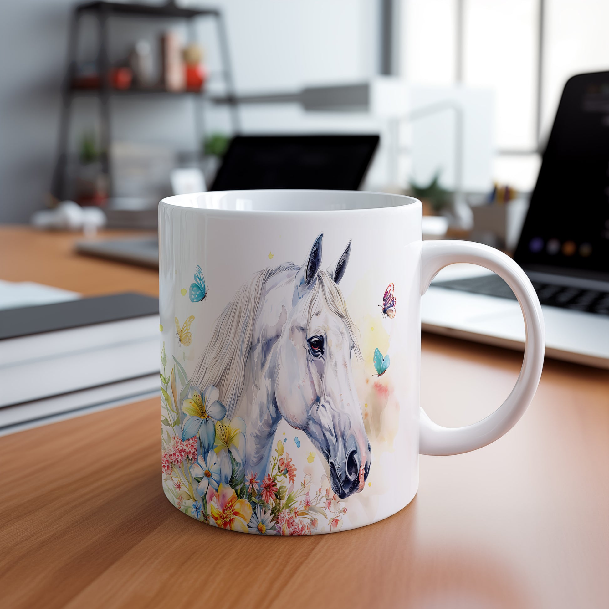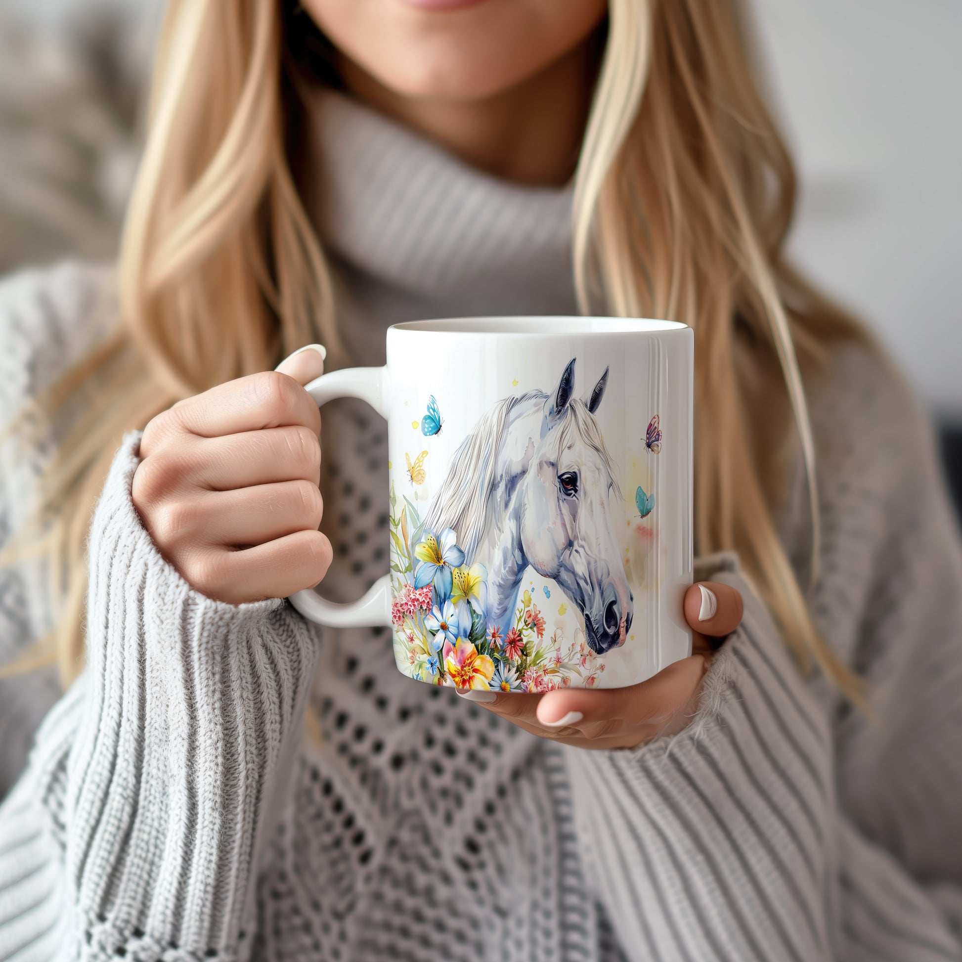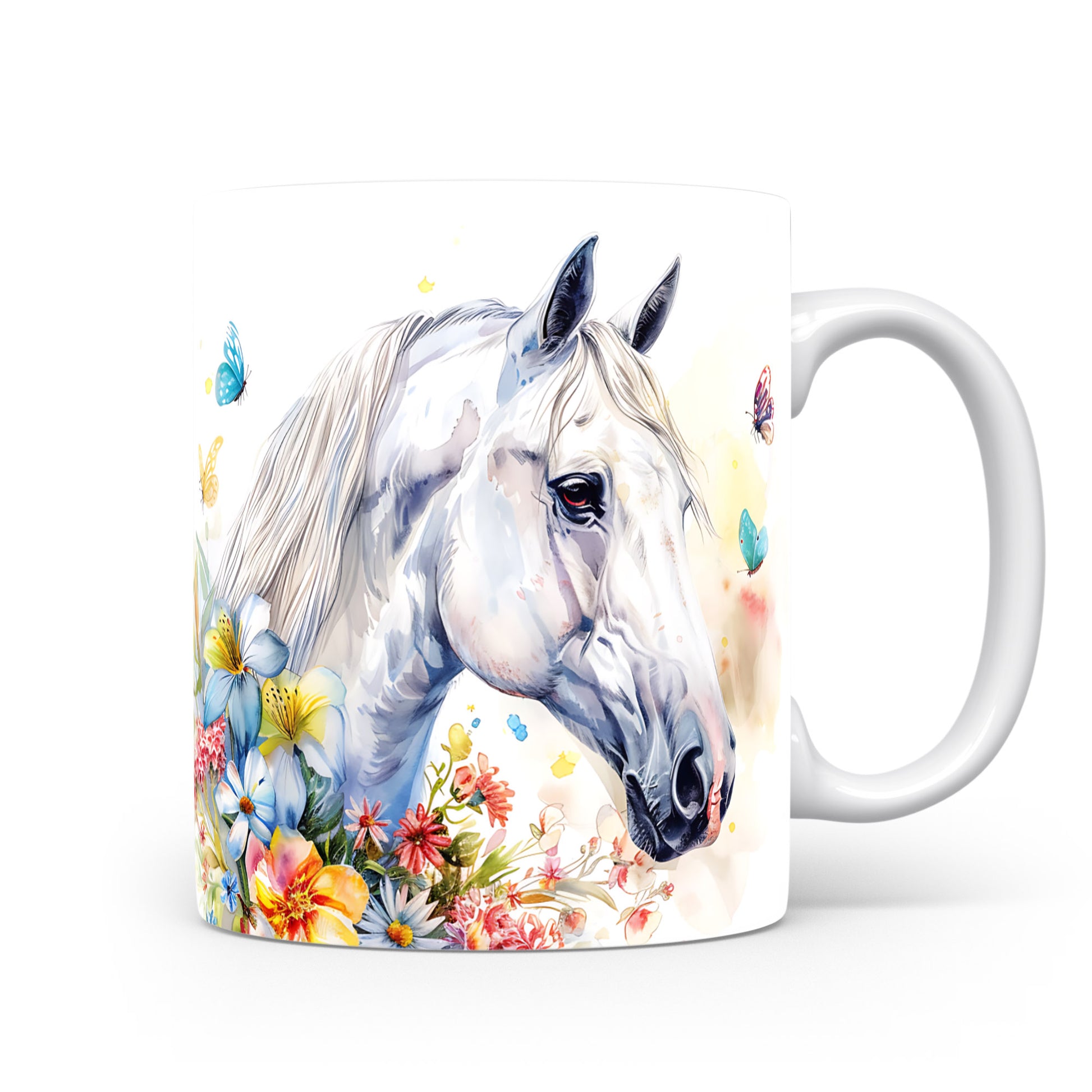 Keramický hrnek s realistickým motivem bílého koně, obklopeného barevnými květinami. Tento hrnek je skvělým dárkem pro milovníky koní a přírody. Materiál: keramika. Objem: 330 ml. Vhodné do myčky i mikrovlnky. Užívejte si svůj oblíbený nápoj s tímto elegantním kouskem.
