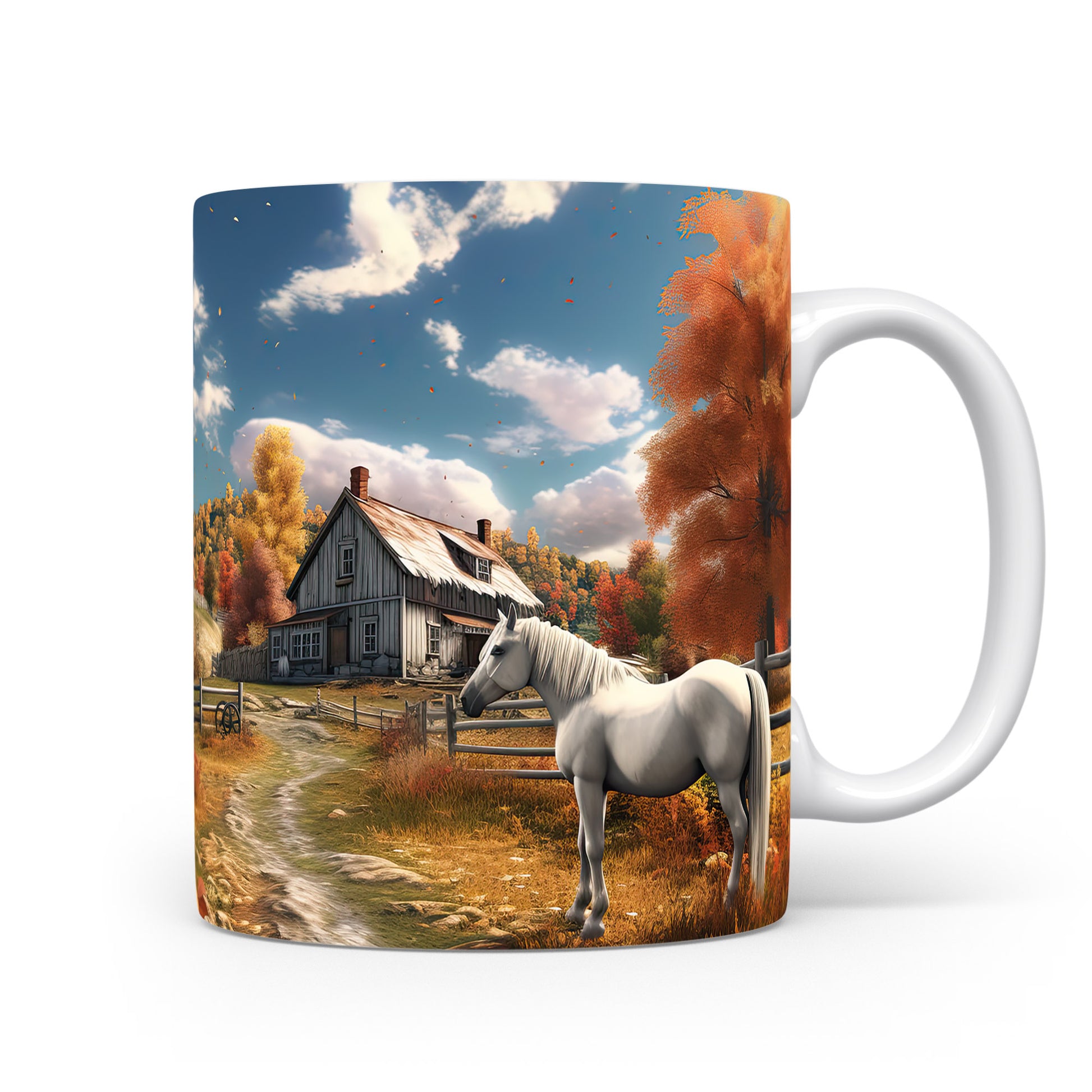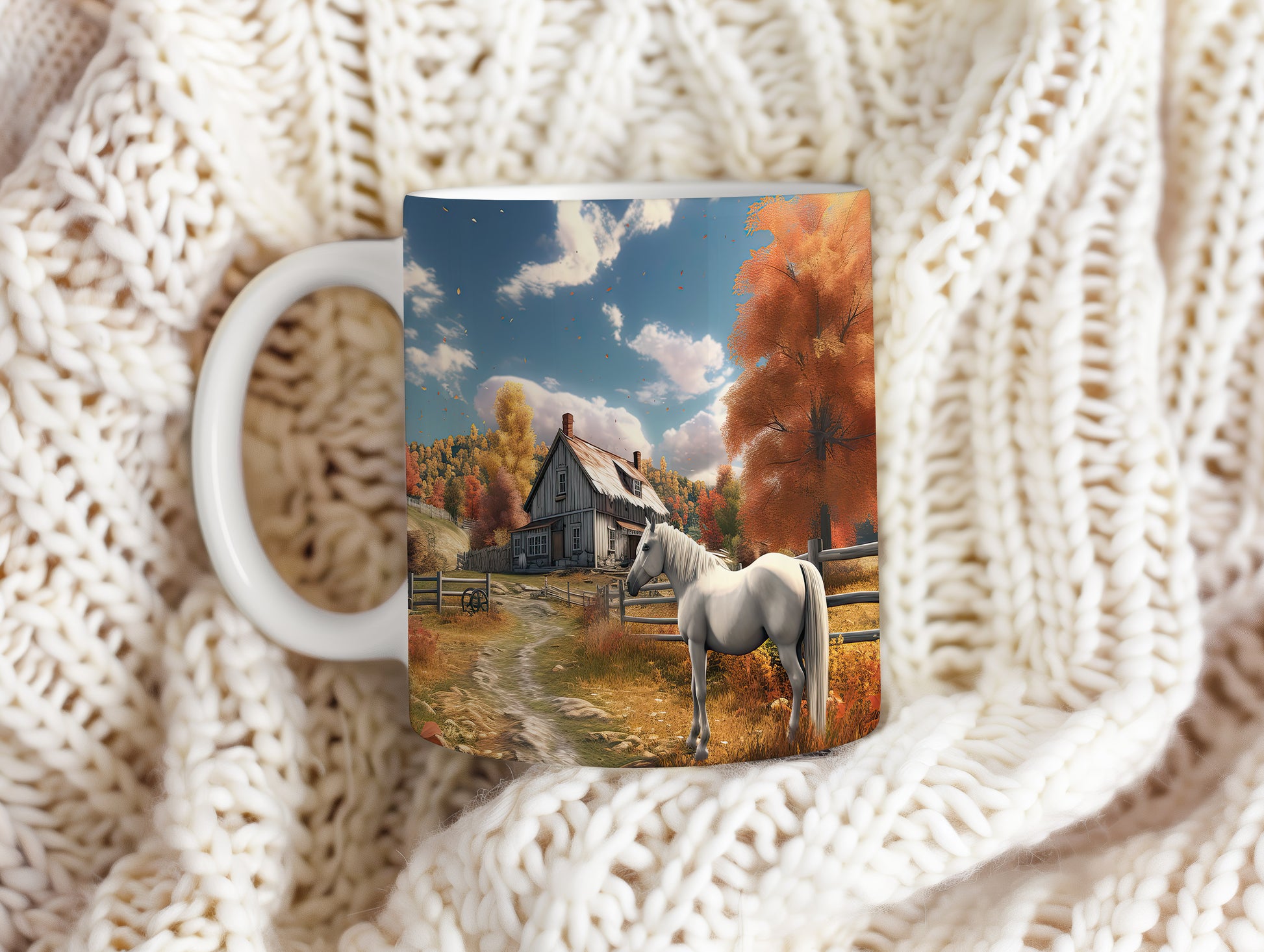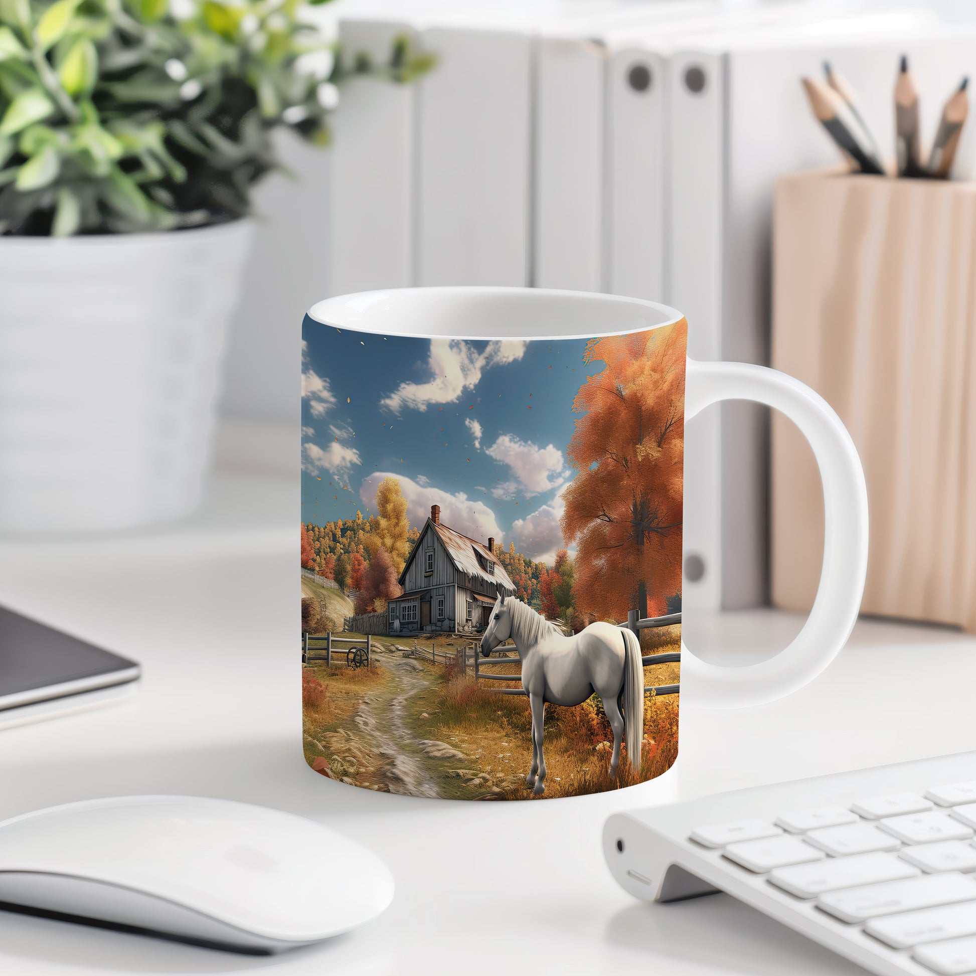 Hrnek s motivem bílého koně v podzimní krajině je ideálním kouskem pro milovníky přírody a zvířat. Skvěle se hodí jako dárek pro přátele nebo rodinu, kteří ocení krásu venkovského života. Materiál: keramika. Objem: 330 ml. Vhodné do myčky i mikrovlnky. Tento hrnek vám přinese radost při každém doušku vašeho oblíbeného nápoje.