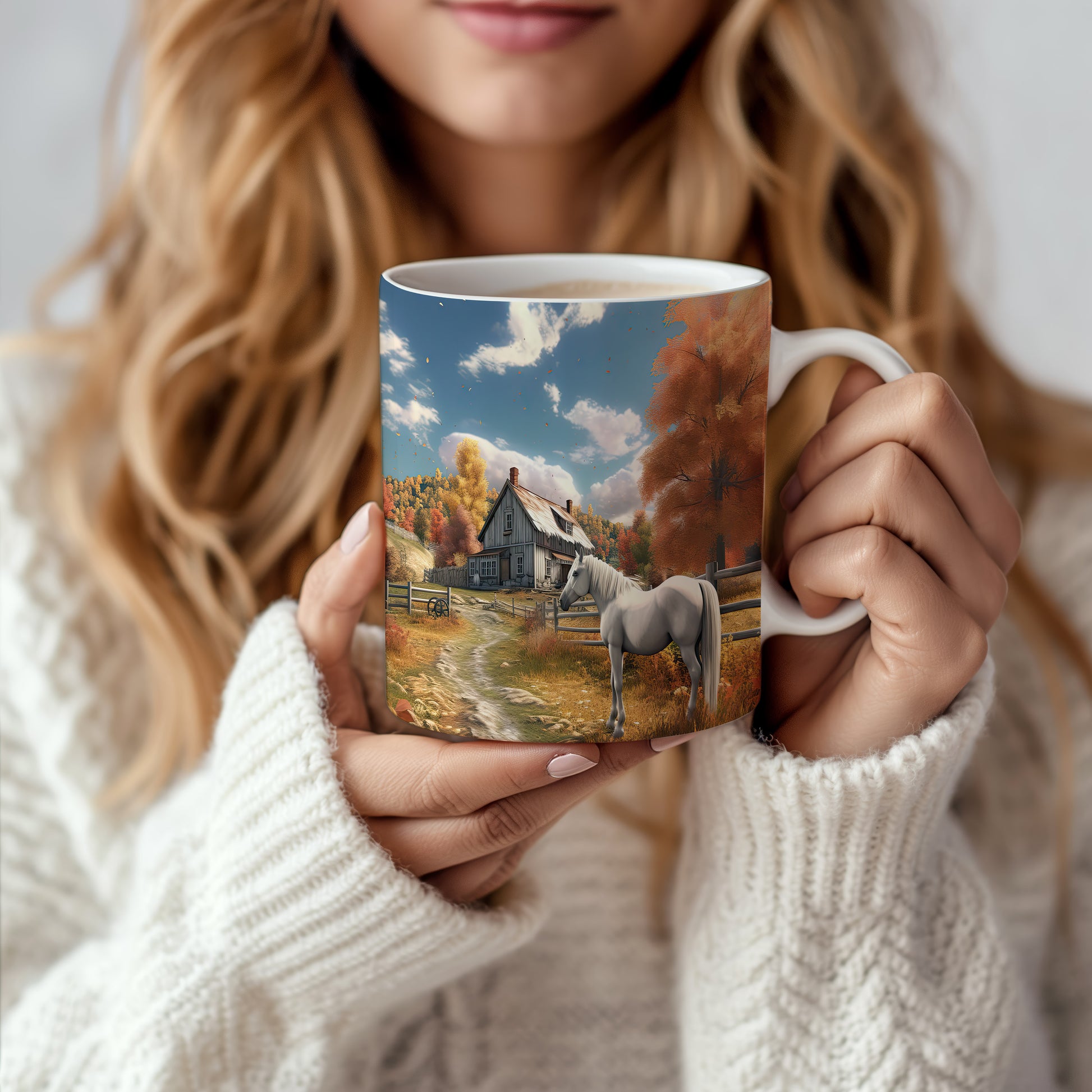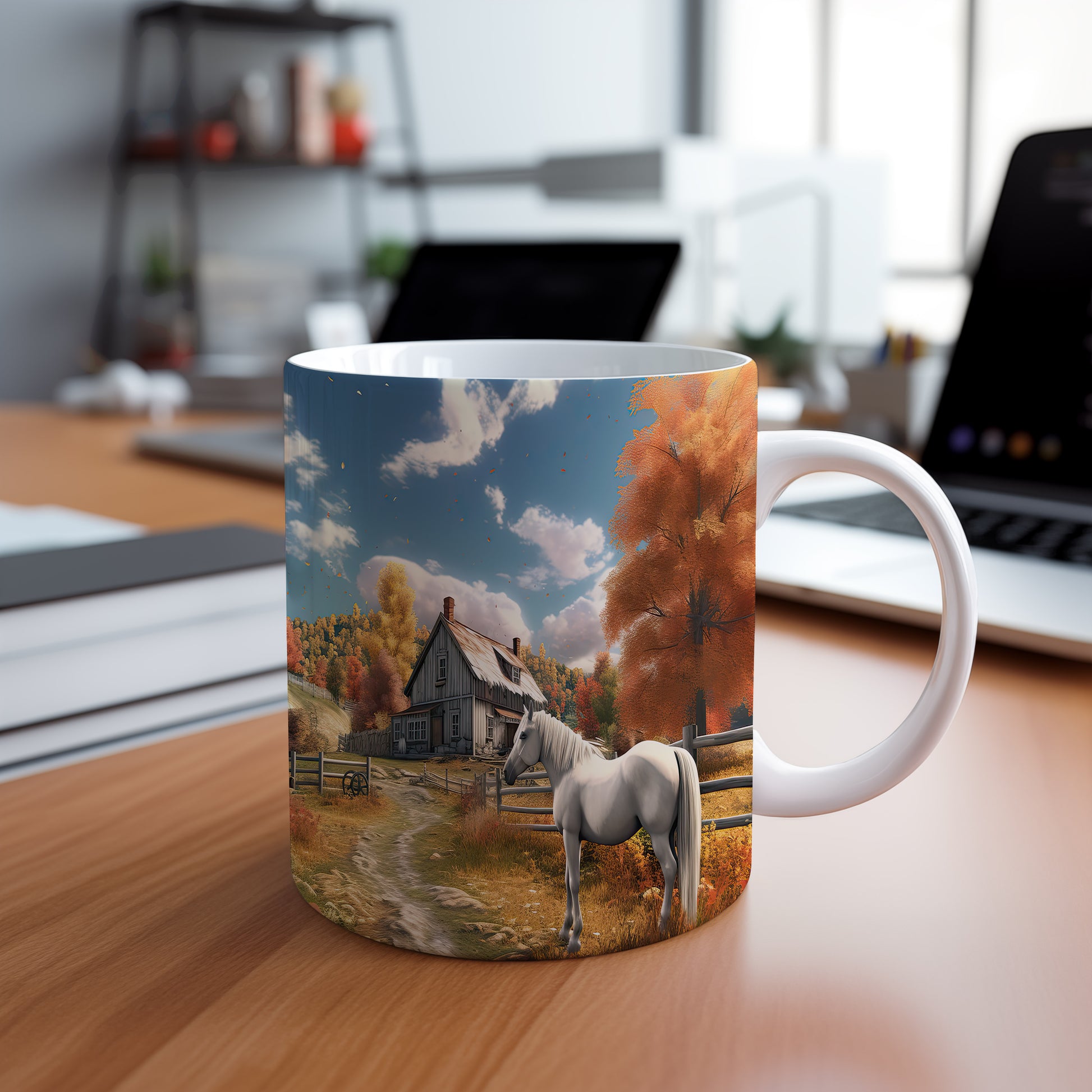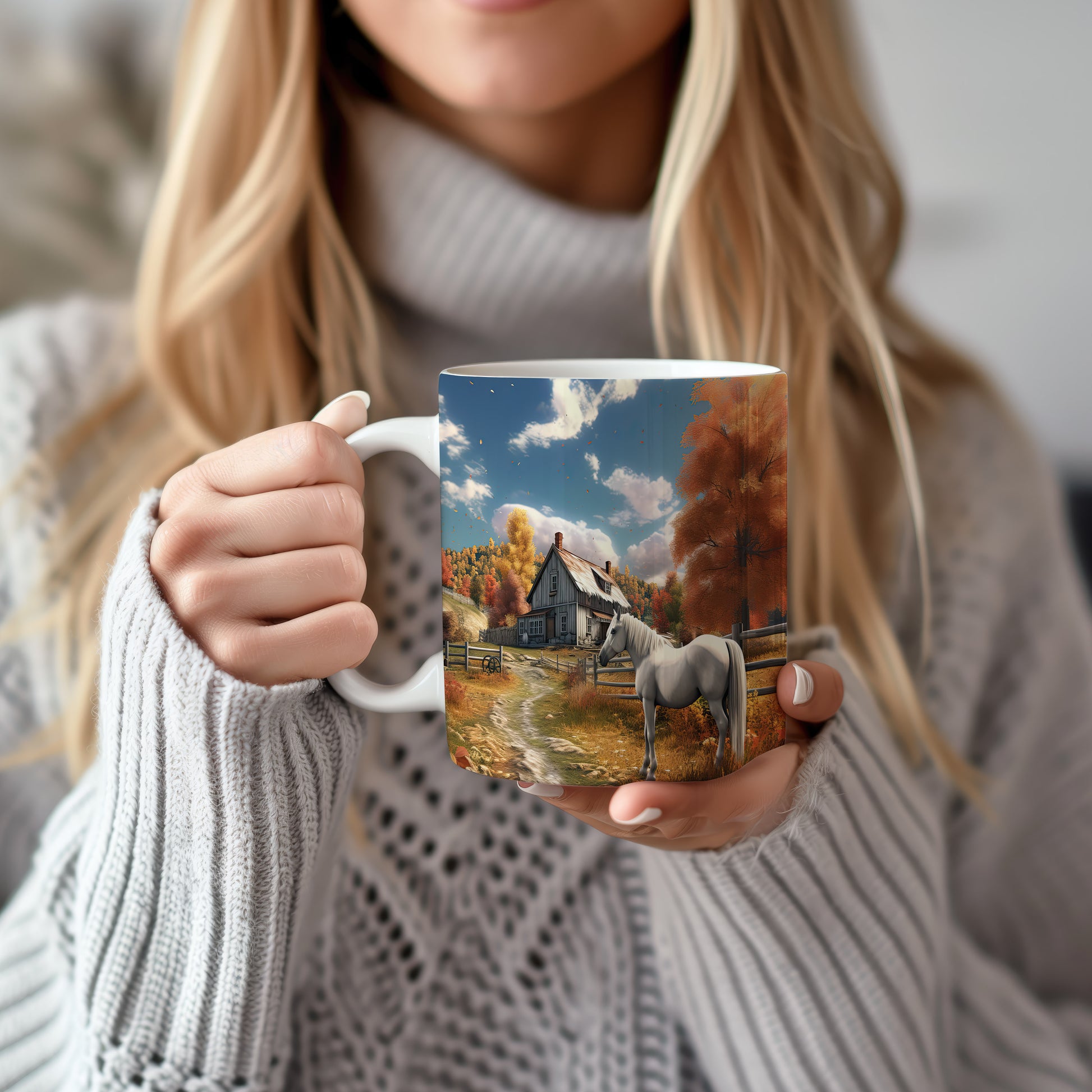 Hrnek s motivem bílého koně v podzimní krajině je ideálním kouskem pro milovníky přírody a zvířat. Skvěle se hodí jako dárek pro přátele nebo rodinu, kteří ocení krásu venkovského života. Materiál: keramika. Objem: 330 ml. Vhodné do myčky i mikrovlnky. Tento hrnek vám přinese radost při každém doušku vašeho oblíbeného nápoje.