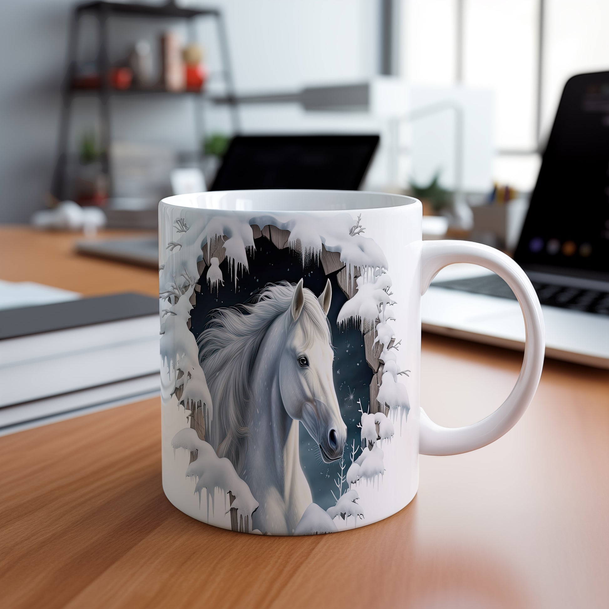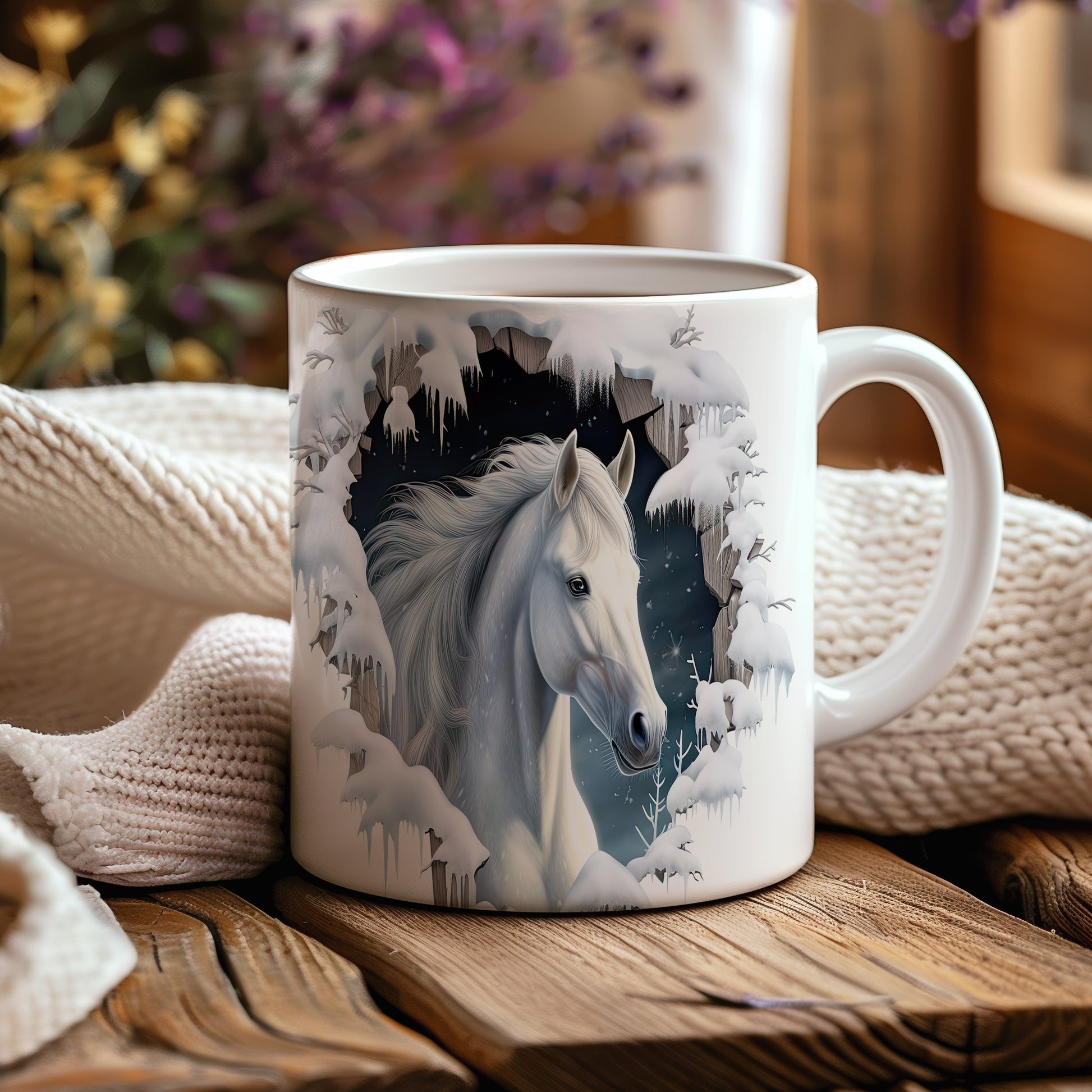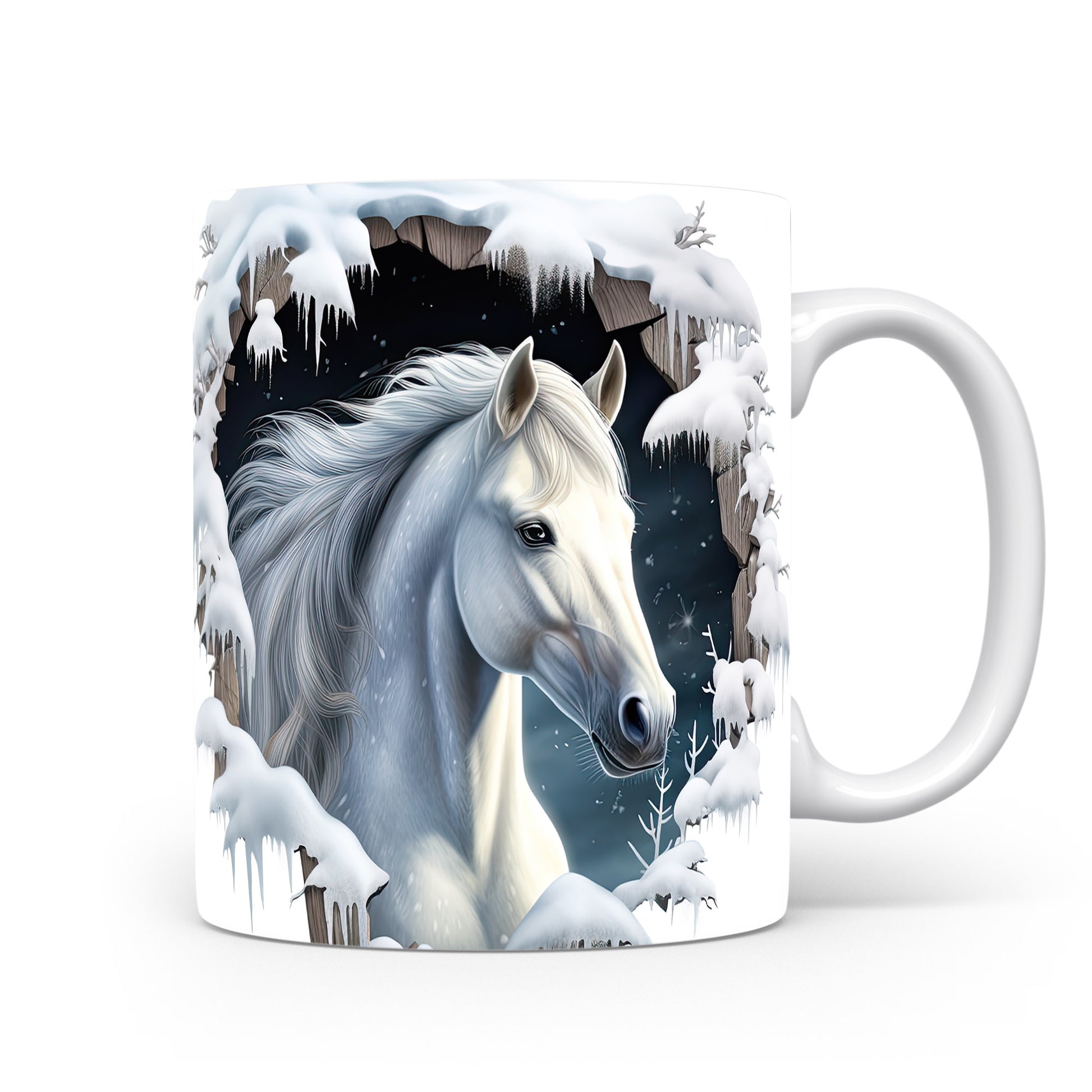 Tento hrnek zobrazuje bílého koně v zasněžené krajině, ideální pro milovníky koní a přírody. Skvělý tip na dárek pro všechny, kteří ocení krásu zimní scenérie. Materiál: keramika. Objem: 330 ml. Vhodné do myčky i mikrovlnky. Užívejte si svůj oblíbený nápoj s tímto stylovým hrnkem.