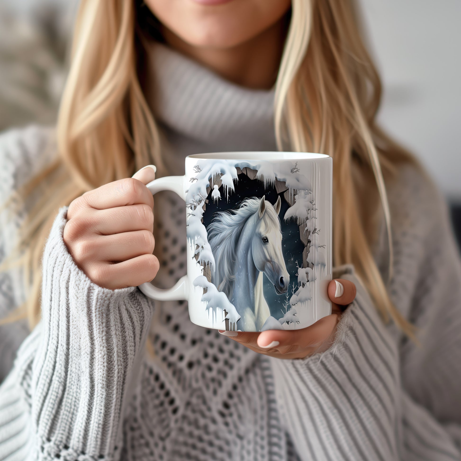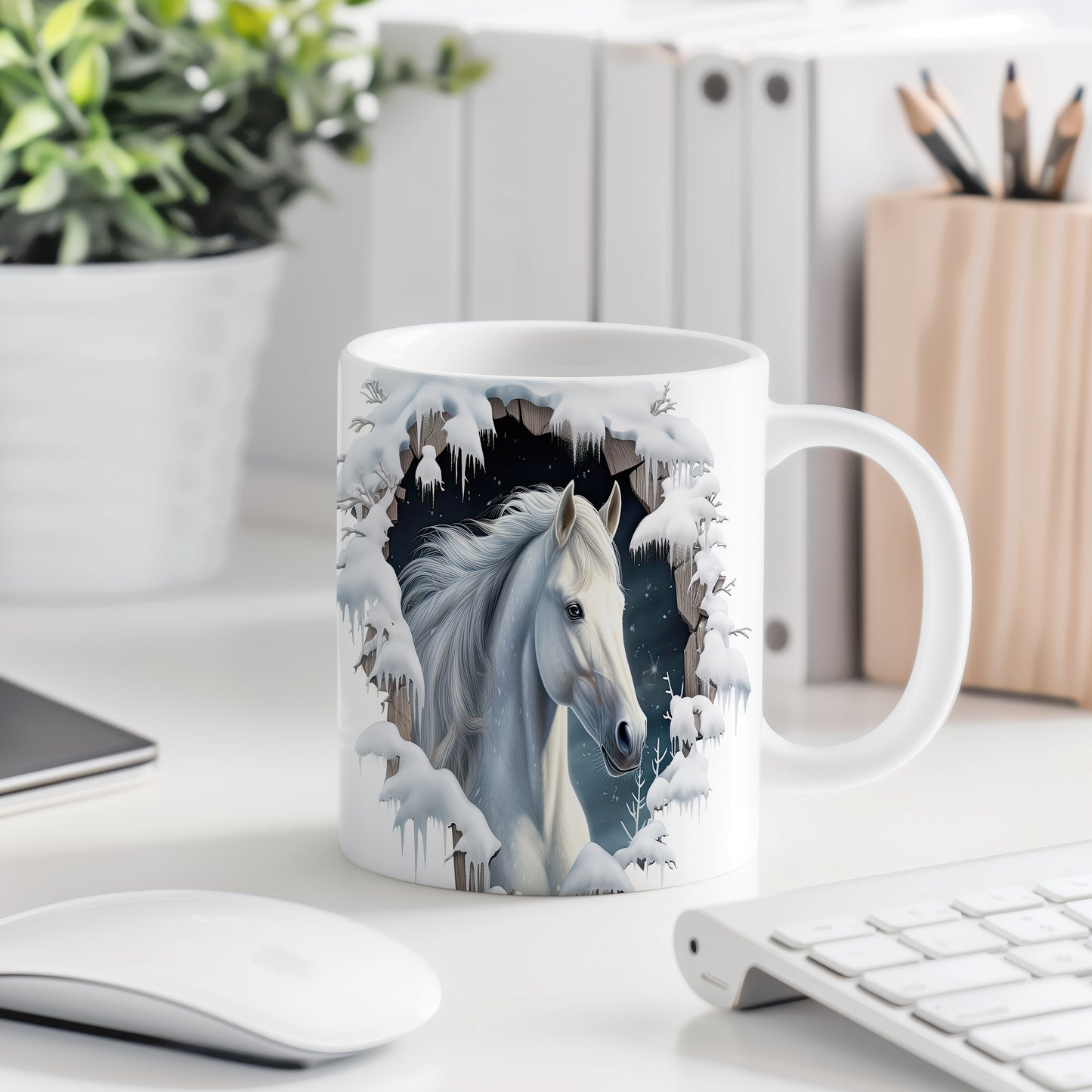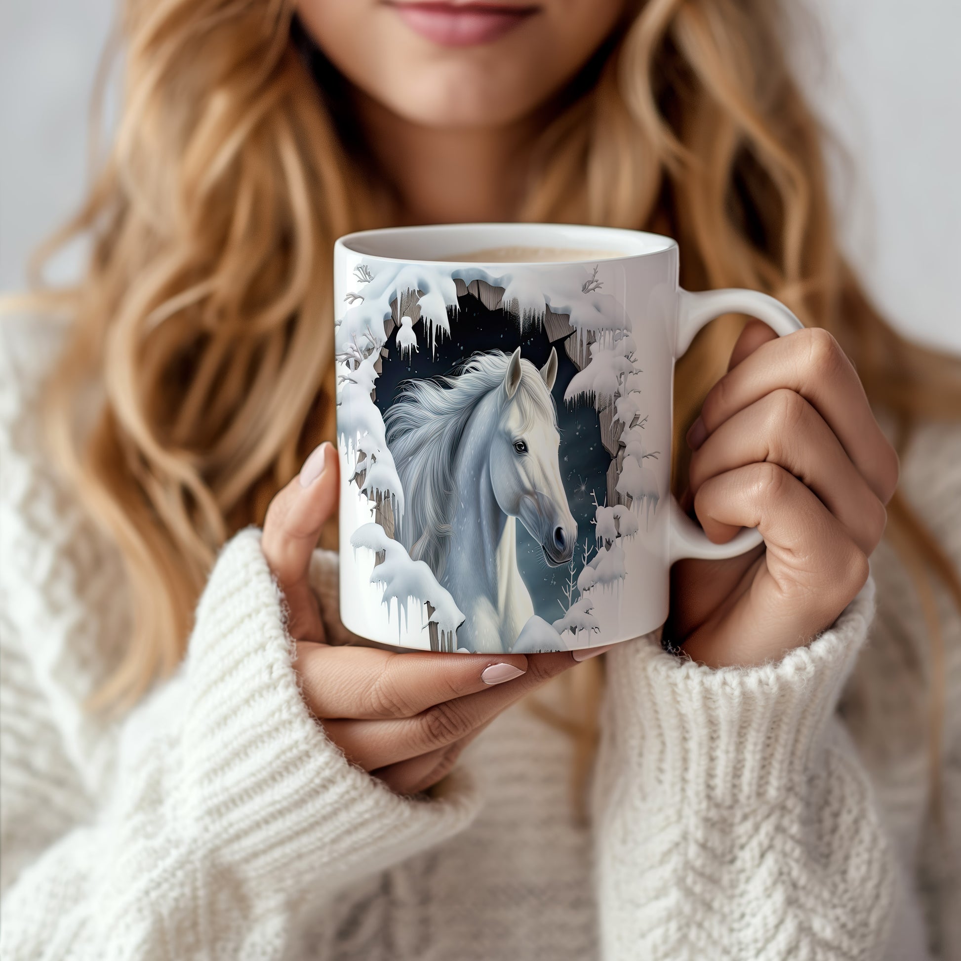 Tento hrnek zobrazuje bílého koně v zasněžené krajině, ideální pro milovníky koní a přírody. Skvělý tip na dárek pro všechny, kteří ocení krásu zimní scenérie. Materiál: keramika. Objem: 330 ml. Vhodné do myčky i mikrovlnky. Užívejte si svůj oblíbený nápoj s tímto stylovým hrnkem.