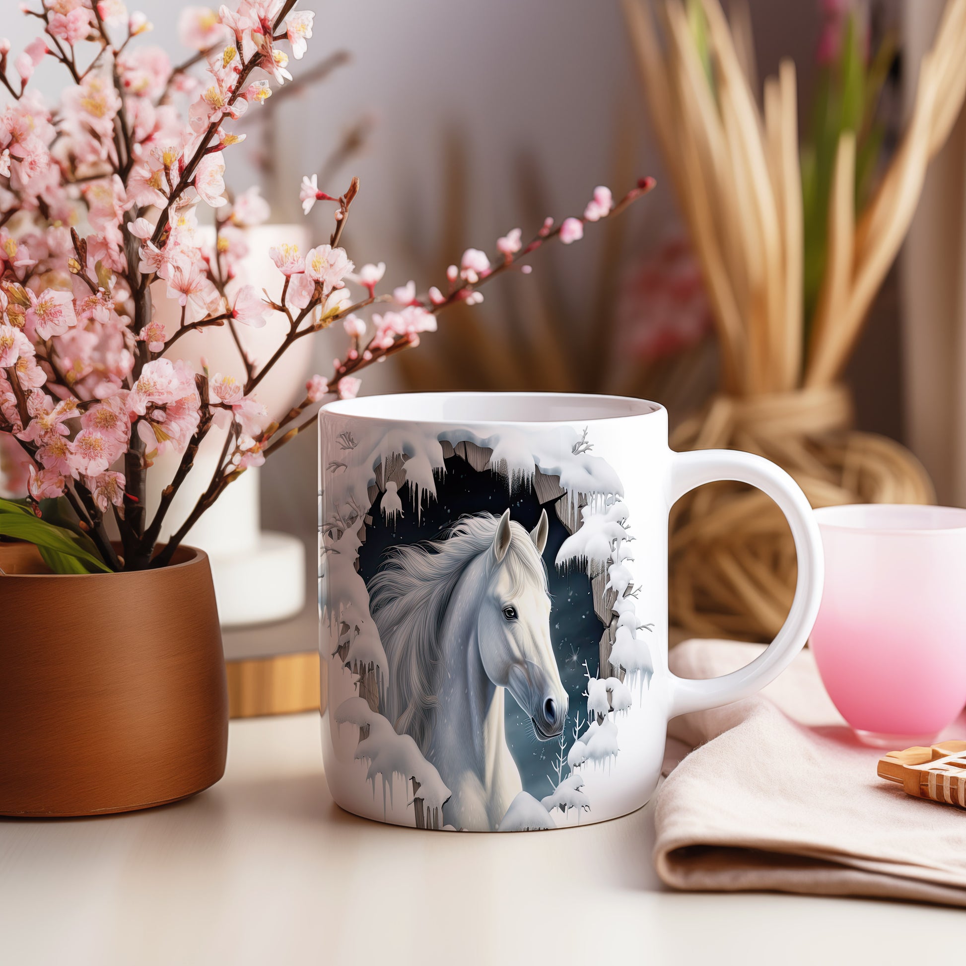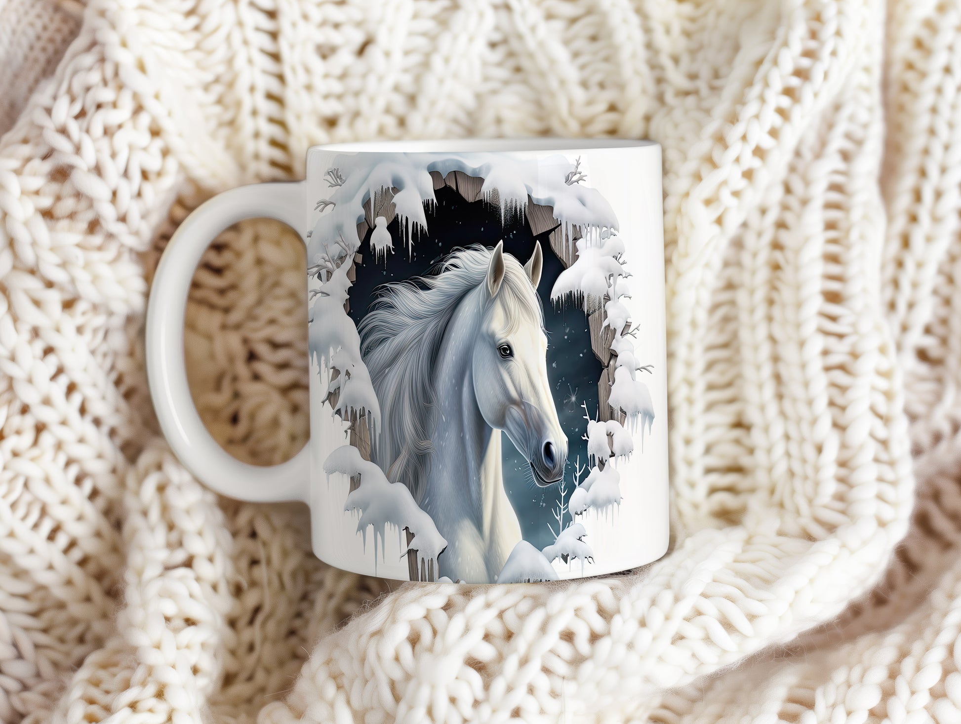 Hrnek s bílým koněm v zimní krajině