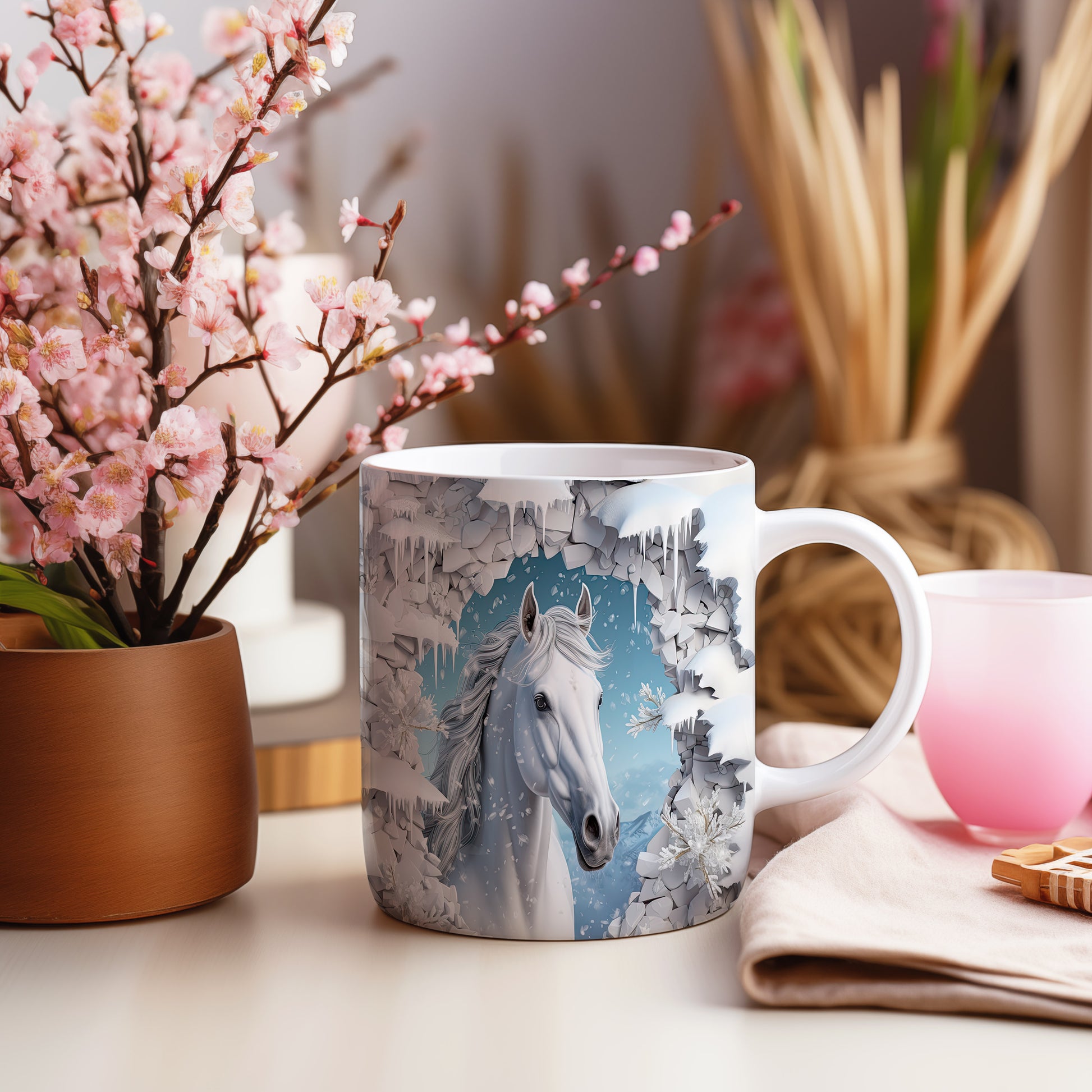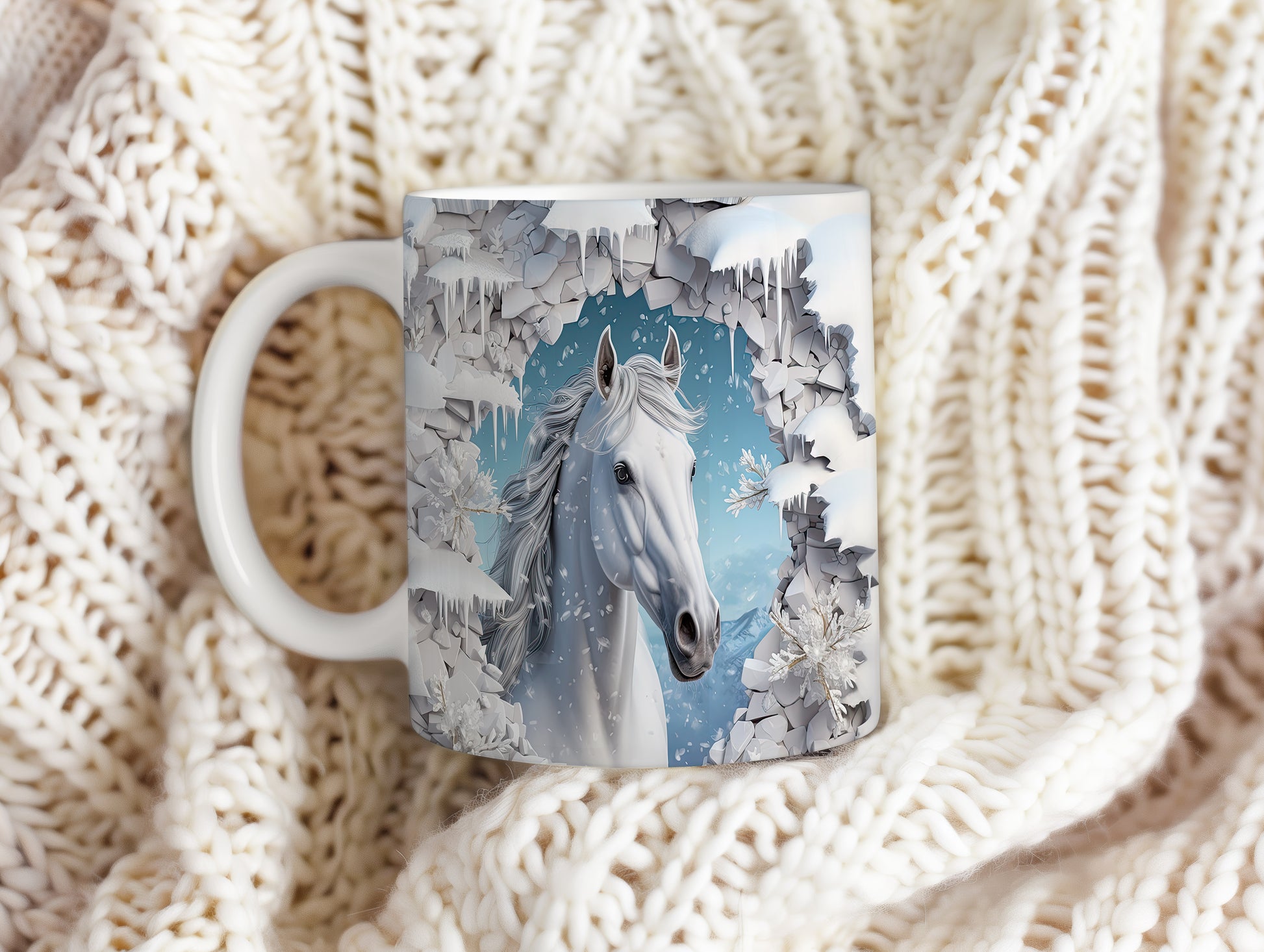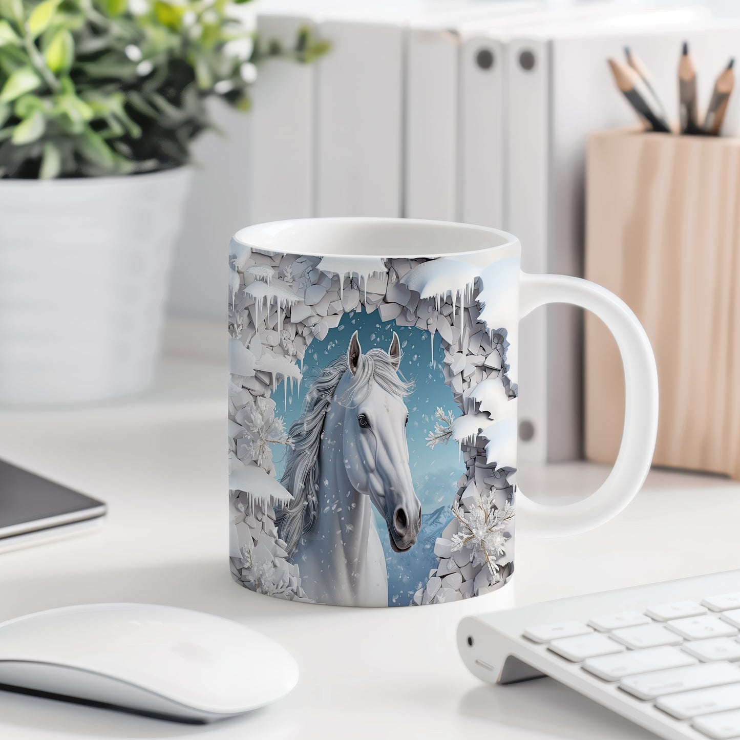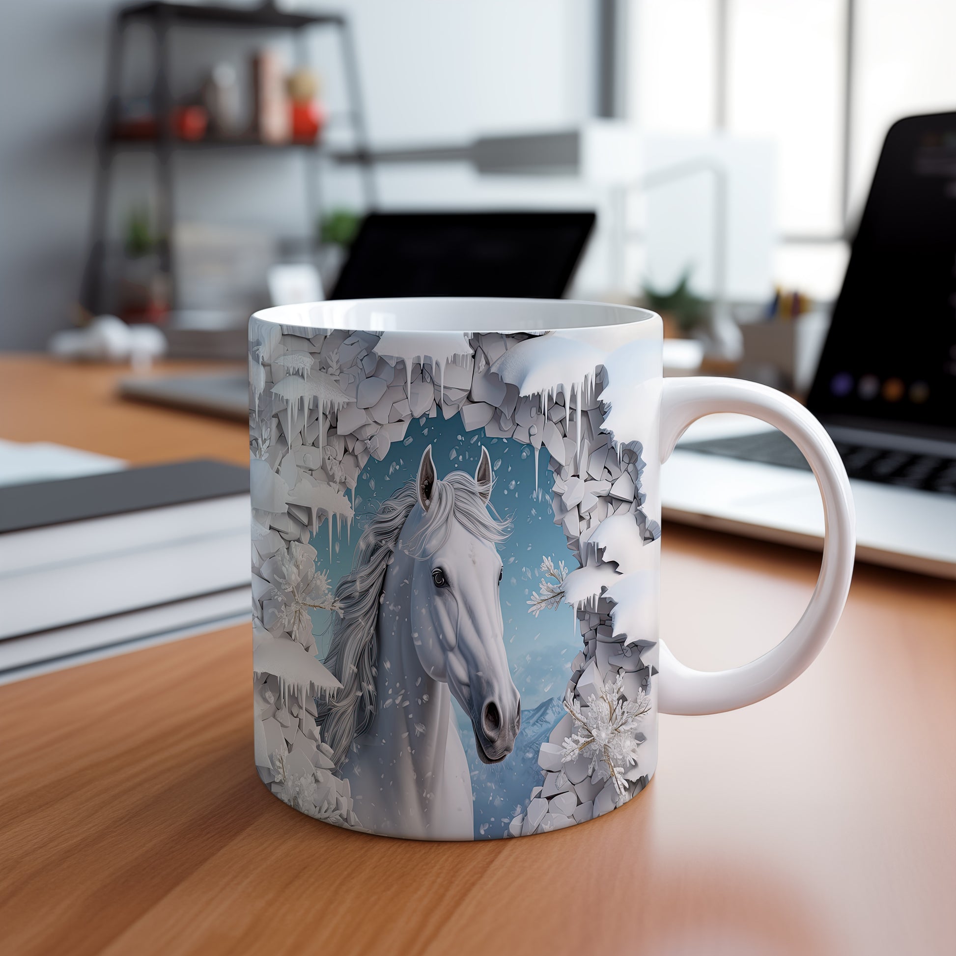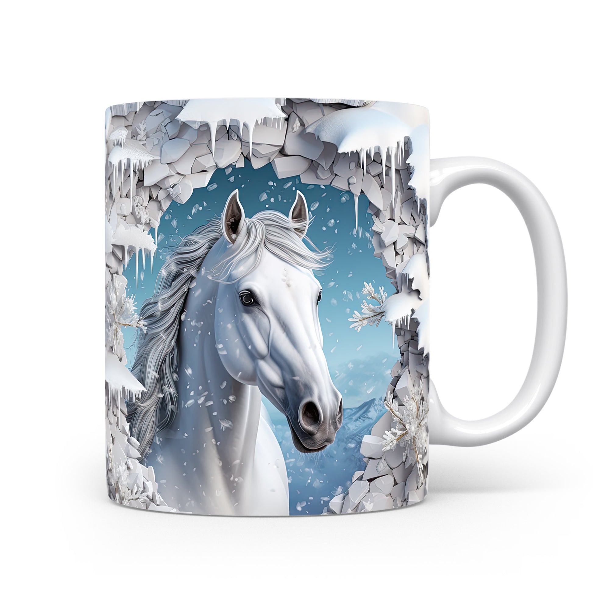 Hrnek s bílým koněm ve sněhové krajině
