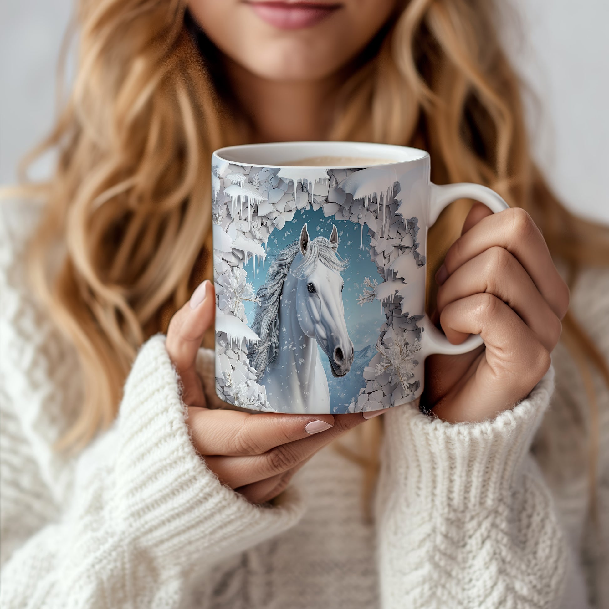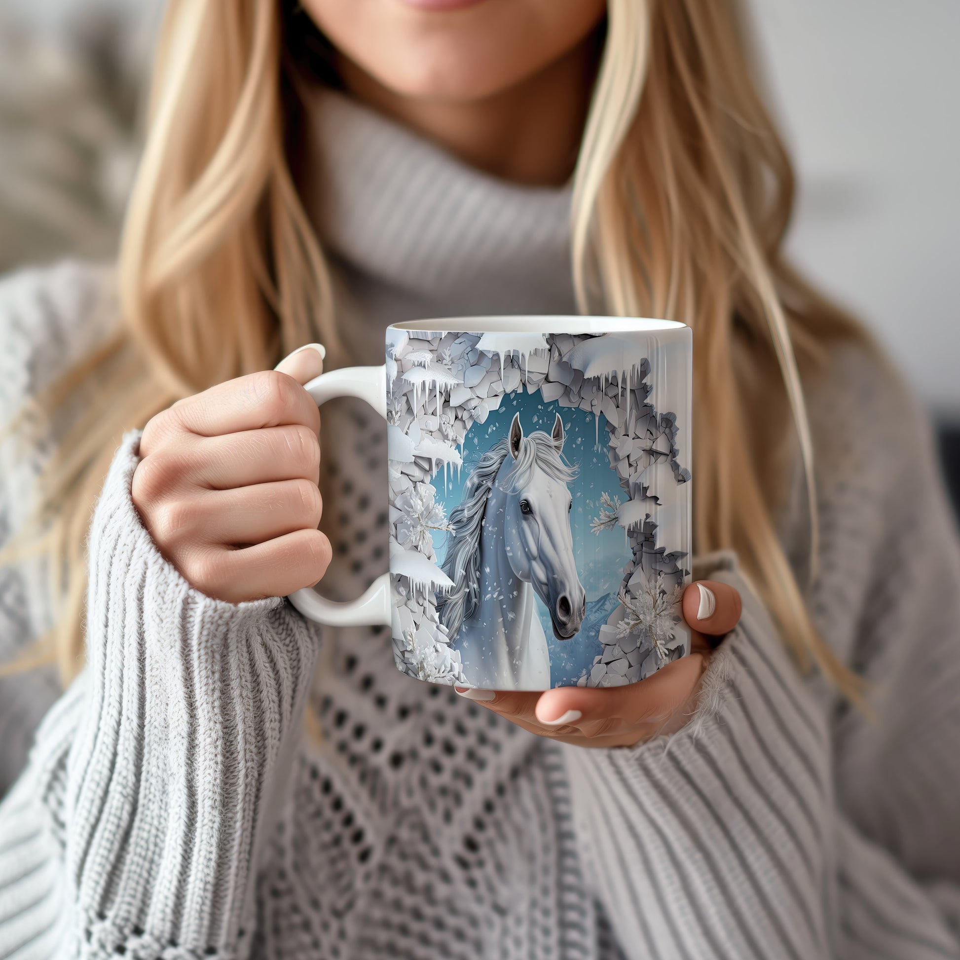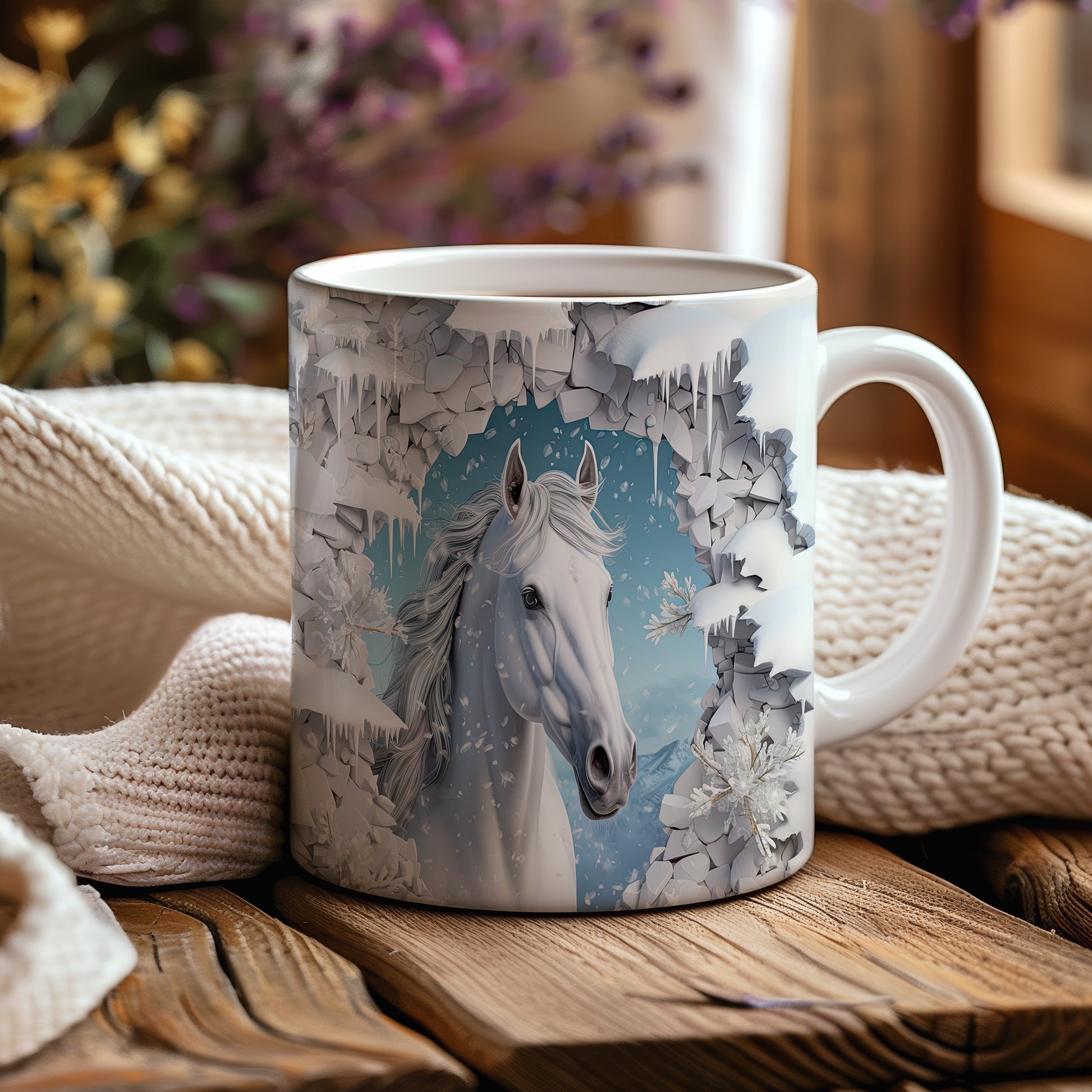 Tento elegantní hrnek zobrazuje bílého koně v zasněžené krajině. Je ideální pro milovníky koní a přírody, skvěle se hodí jako dárek pro každého, kdo ocení krásu přírody. Materiál: keramika. Objem: 330 ml. Vhodné do myčky i mikrovlnky. Používání tohoto hrnku přináší radost z každého doušku.