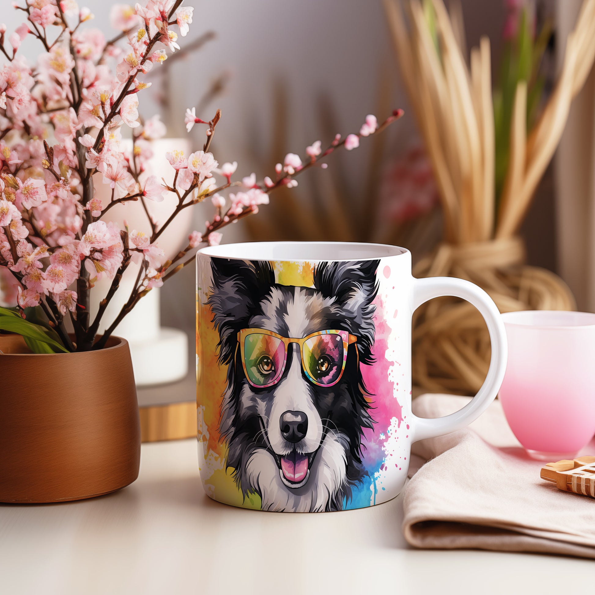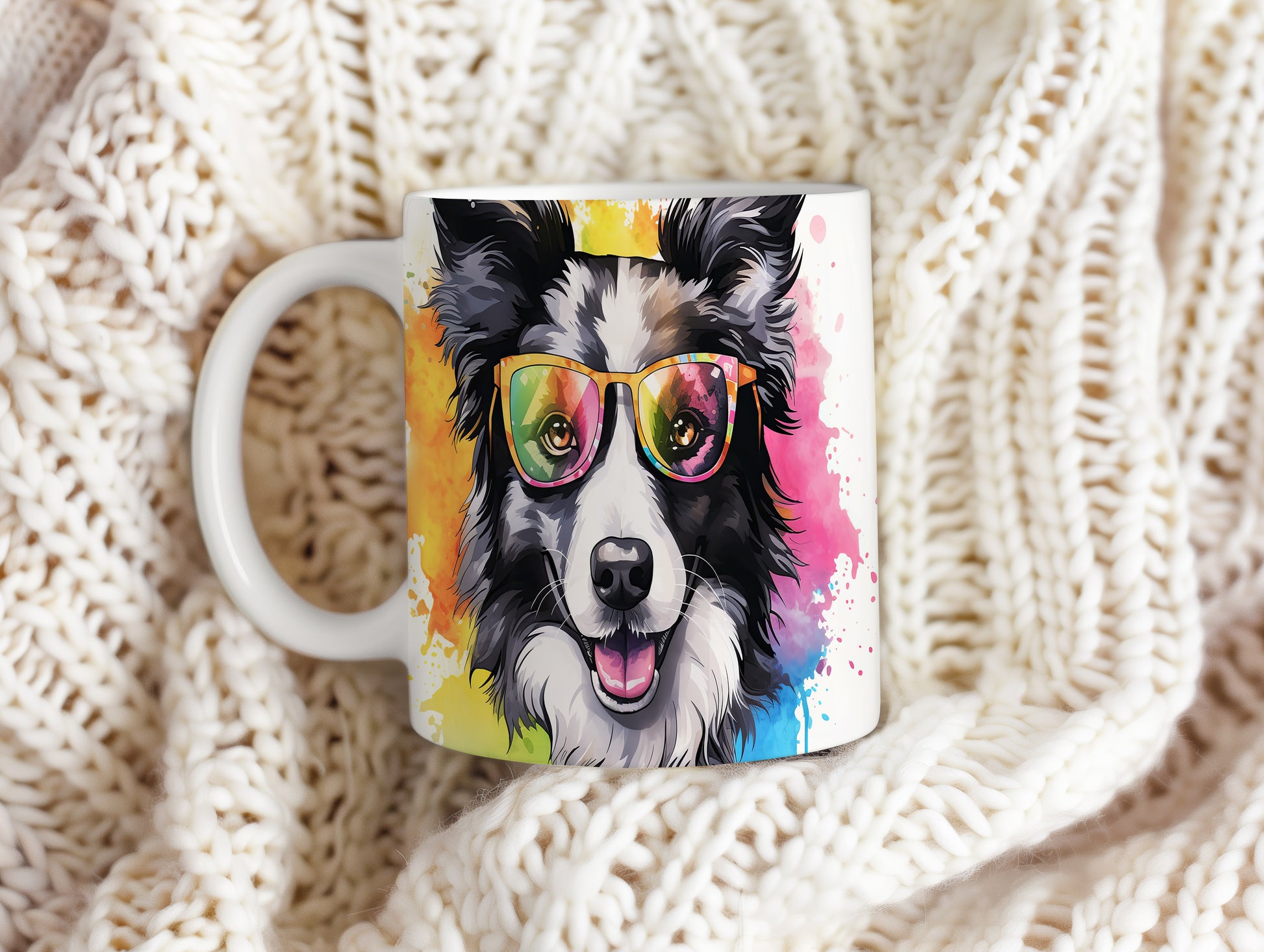 Hrnek s border collie v brýlích – roztomilá digitální ilustrace