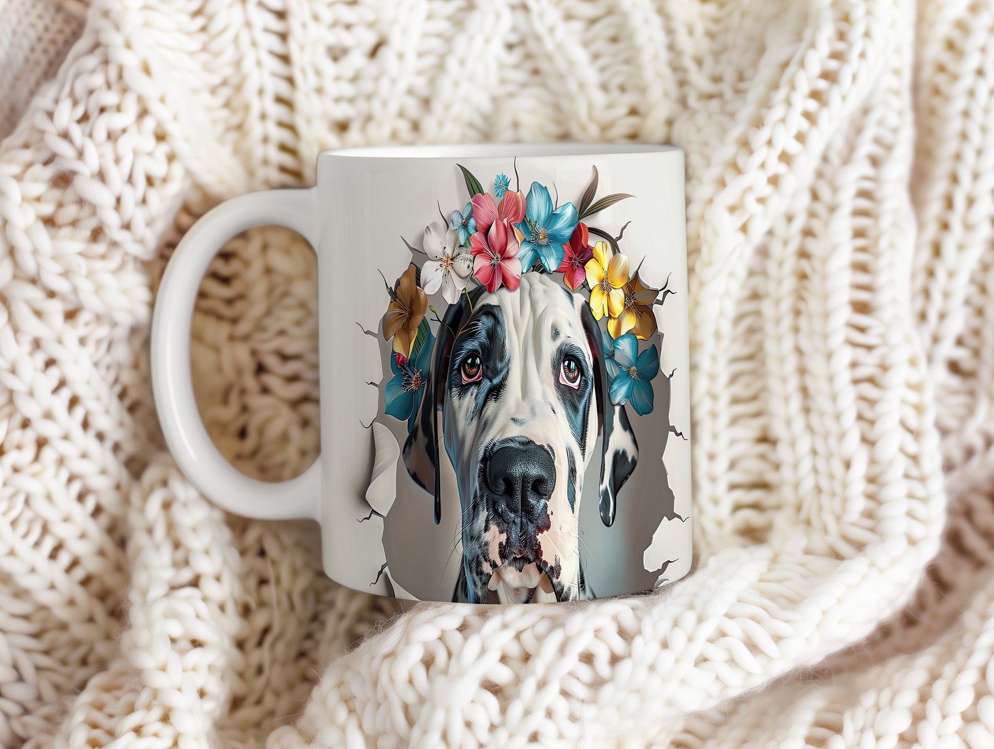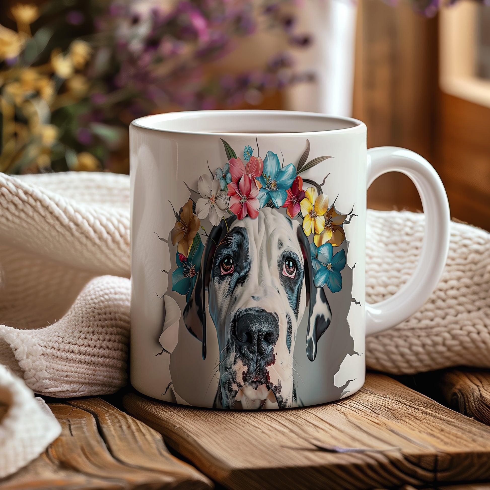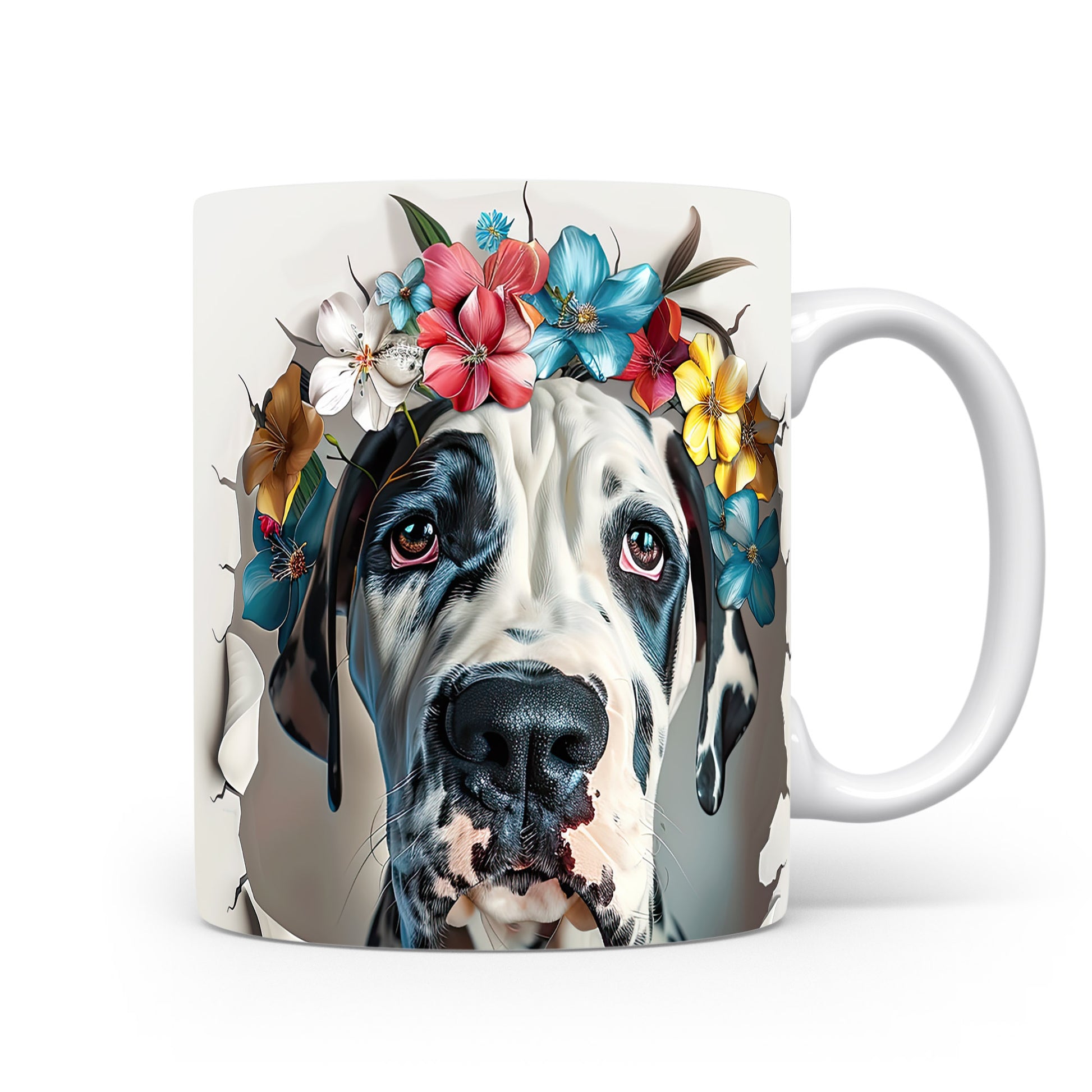 Hrnek s motivem velkého psa a květinové koruny je skvělým kouskem pro milovníky zvířat. Tento hrnek potěší každého, kdo hledá originální dárek pro přátele nebo rodinu. Materiál: keramika. Objem: 330 ml. Vhodné do myčky i mikrovlnky. Díky svému designu přináší do každodenního pití radost a styl.