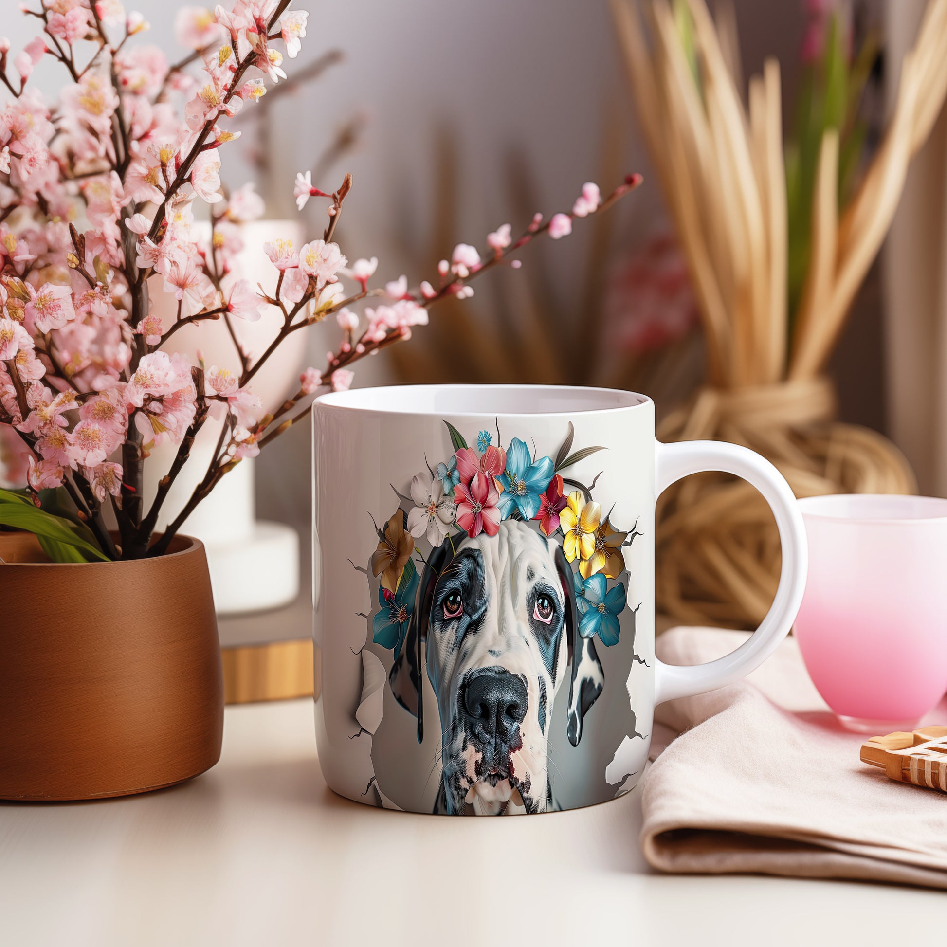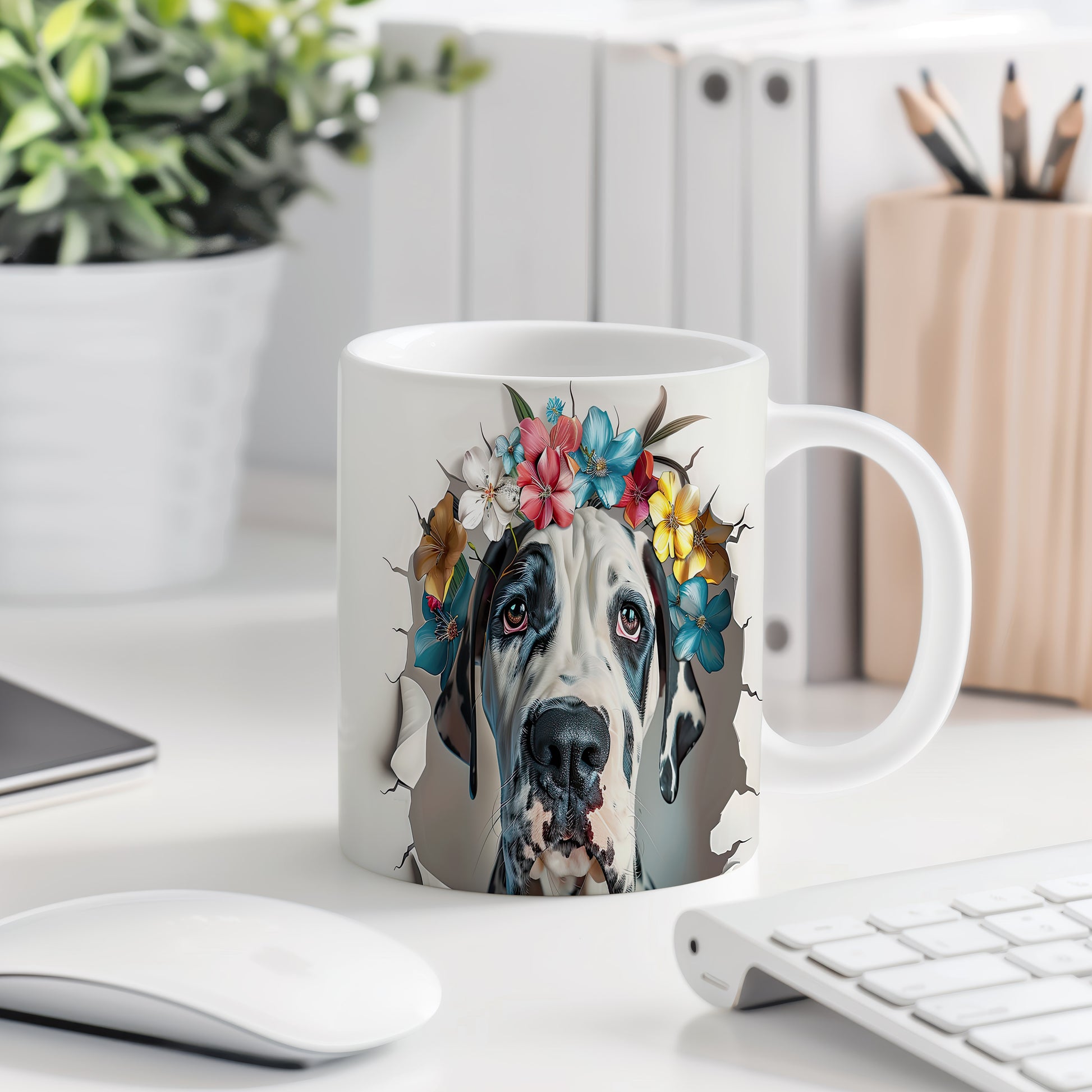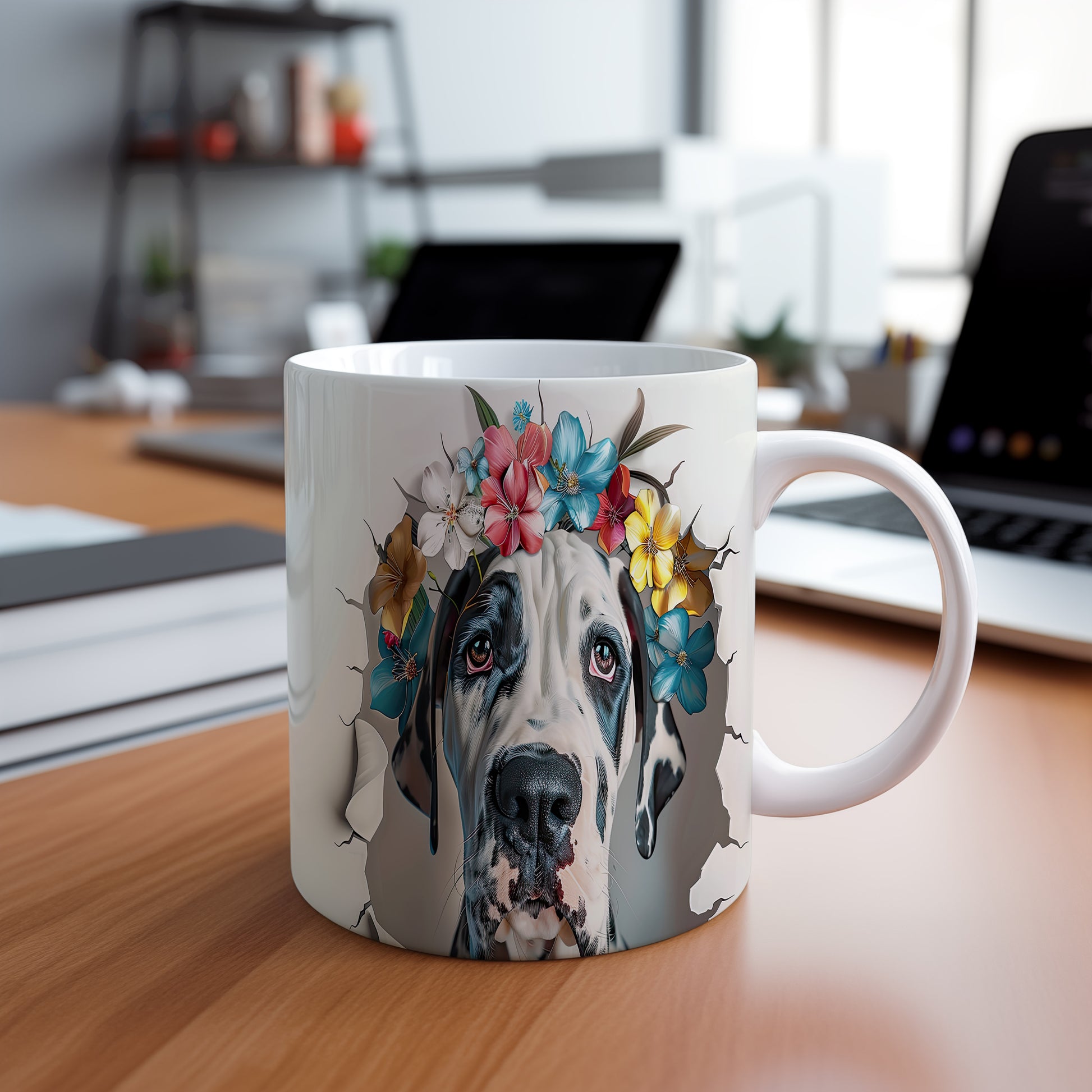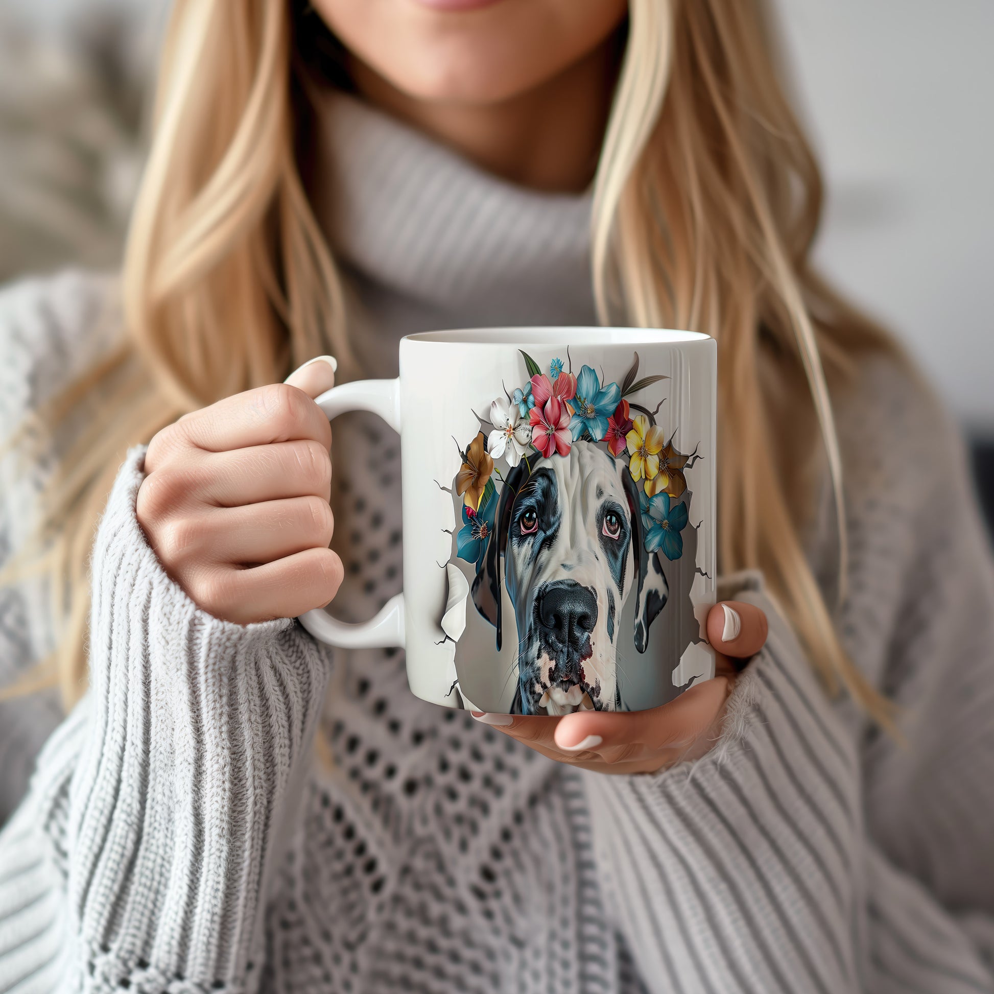 Hrnek s motivem velkého psa a květinové koruny je skvělým kouskem pro milovníky zvířat. Tento hrnek potěší každého, kdo hledá originální dárek pro přátele nebo rodinu. Materiál: keramika. Objem: 330 ml. Vhodné do myčky i mikrovlnky. Díky svému designu přináší do každodenního pití radost a styl.