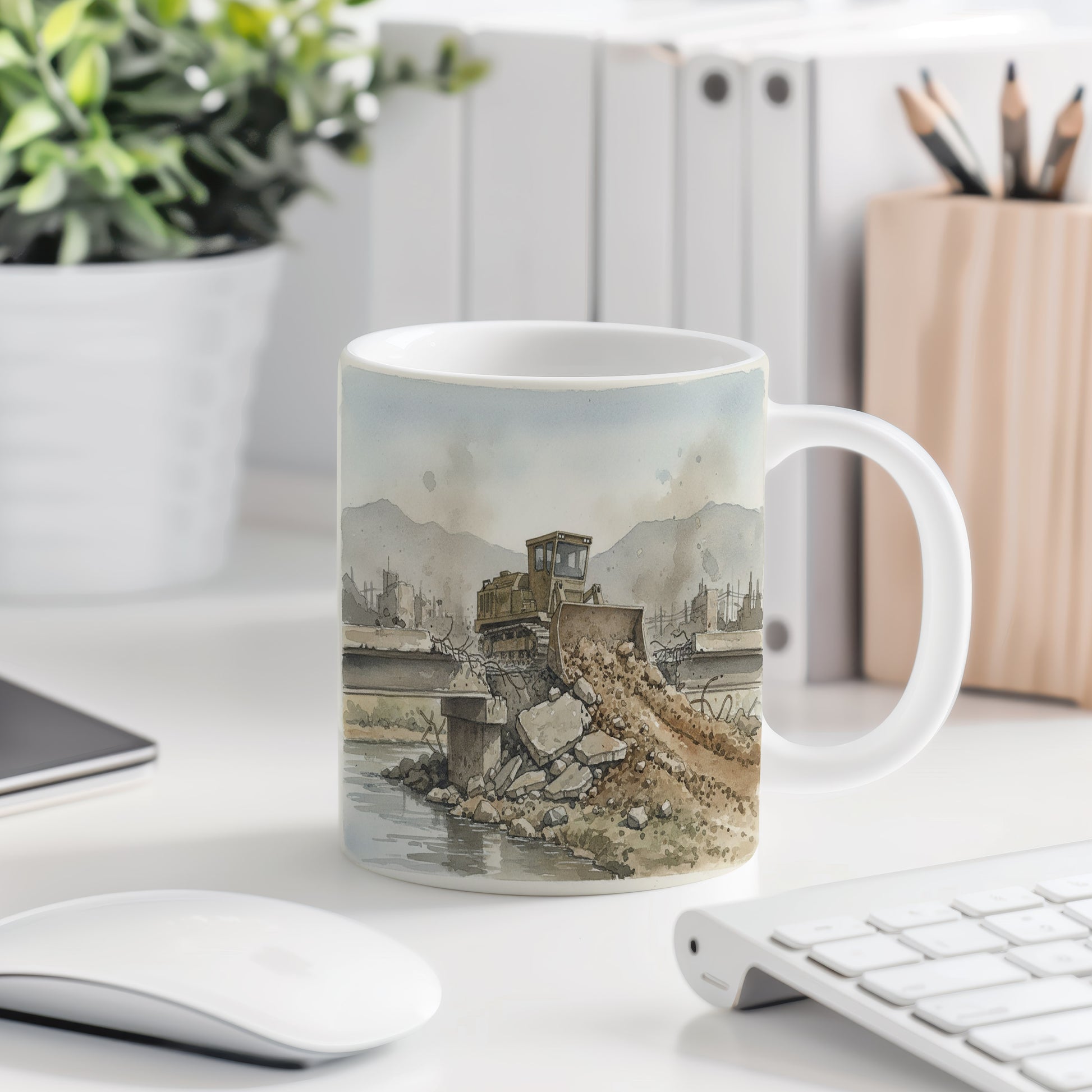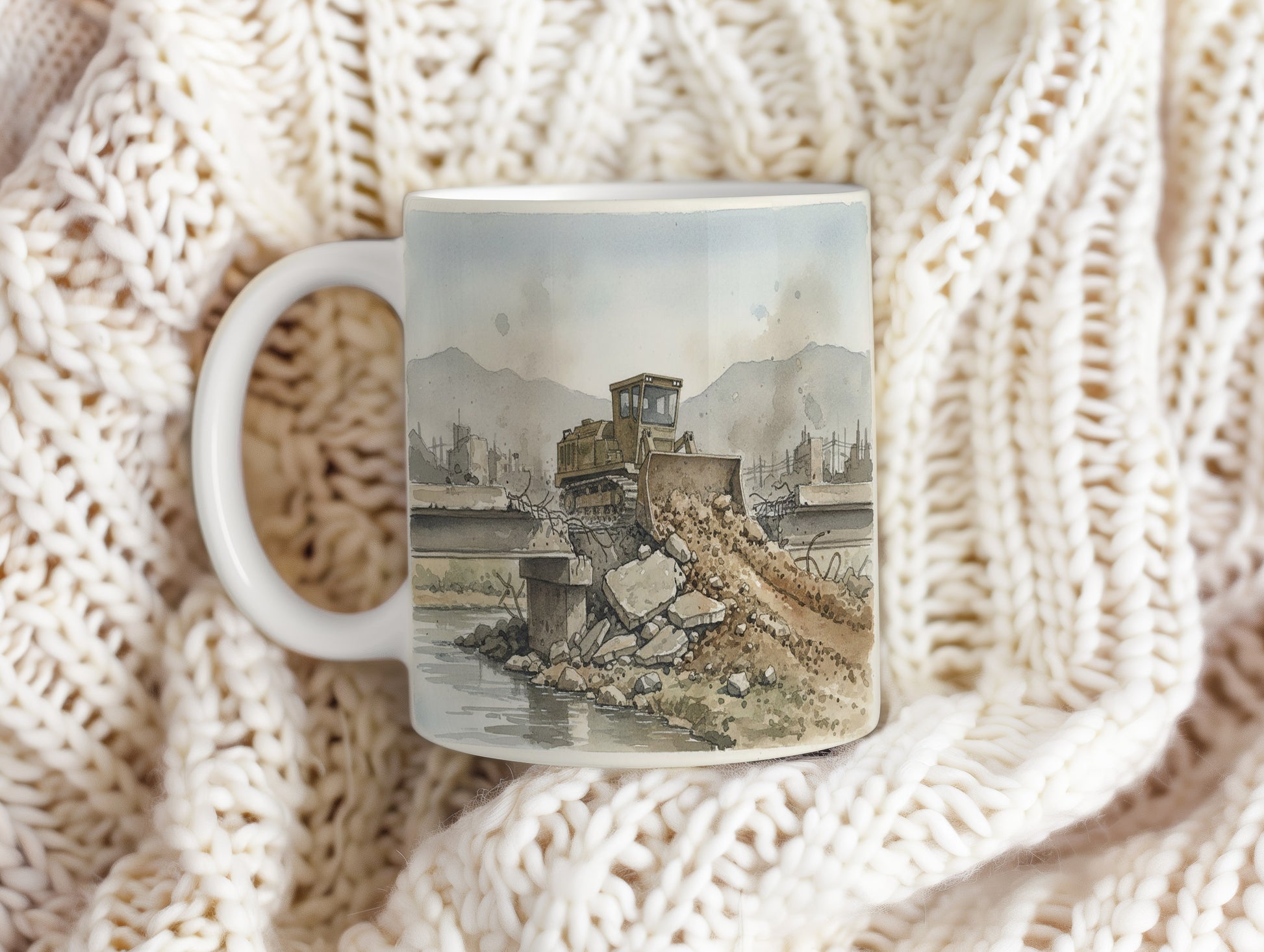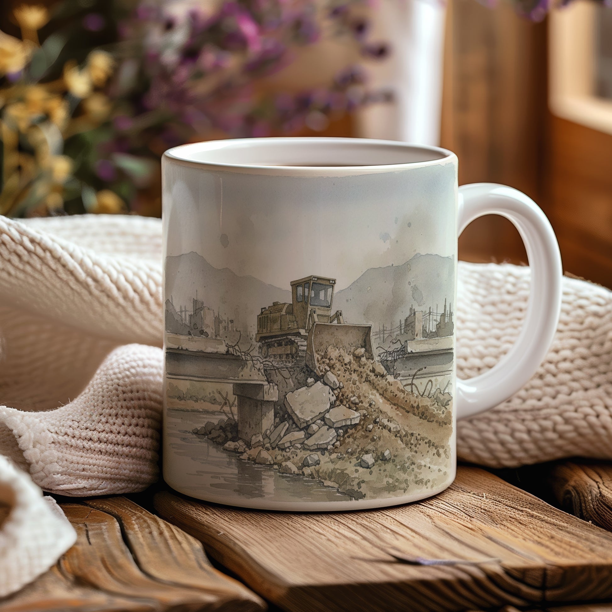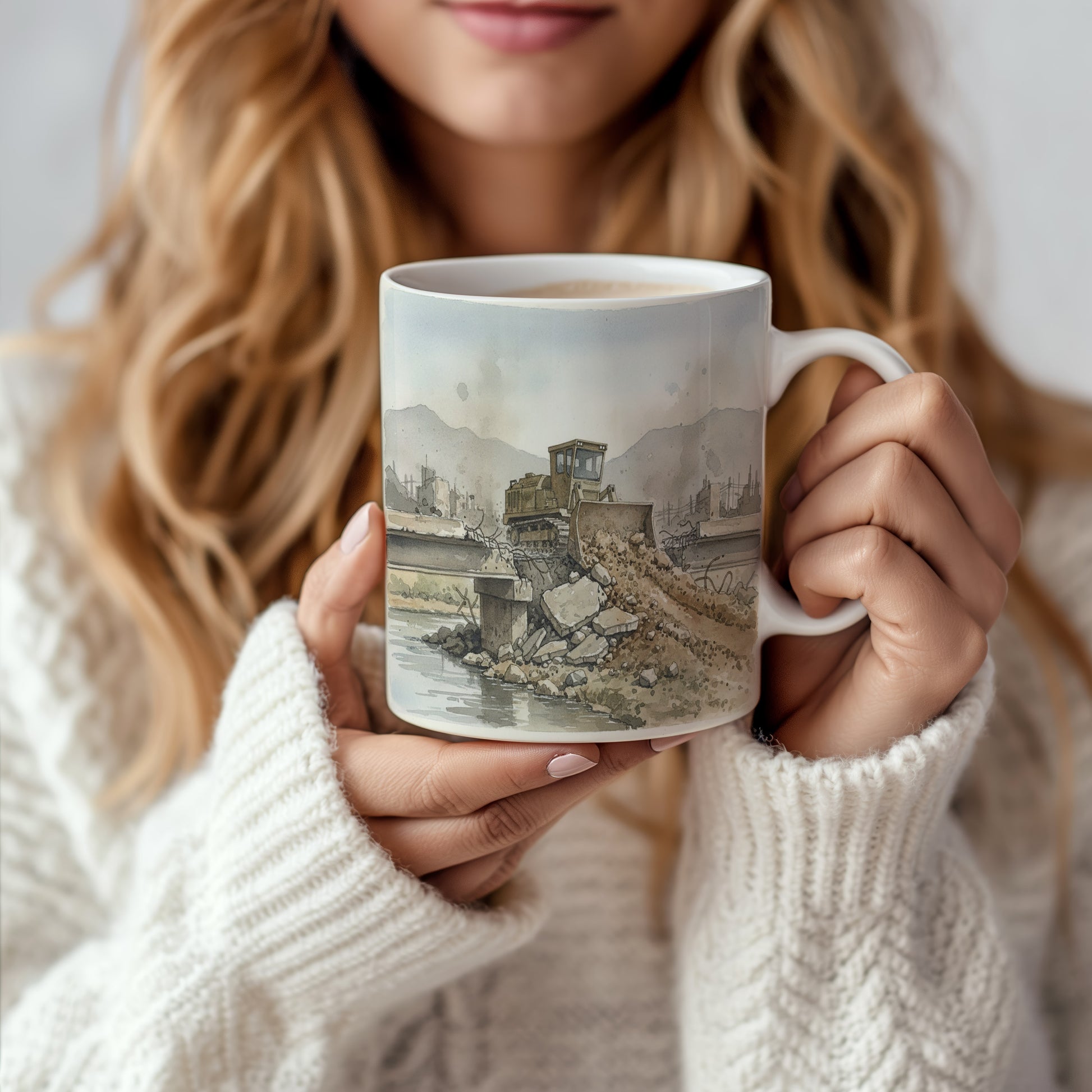Objevte sílu a odolnost s hrnkem, na kterém akvarelový buldozer pracuje u rozvodněné řeky. Dokonalý společník pro milovníky strojů.