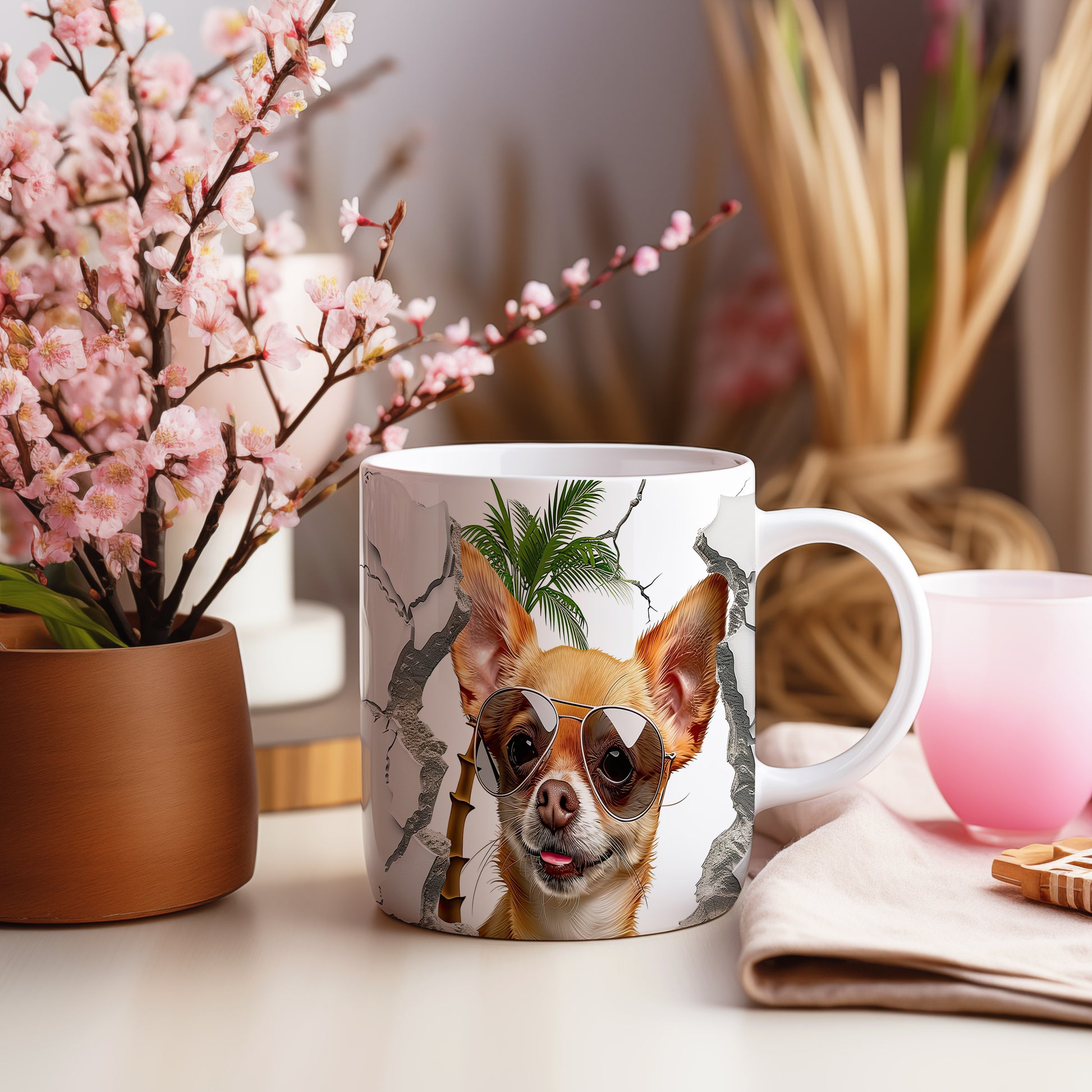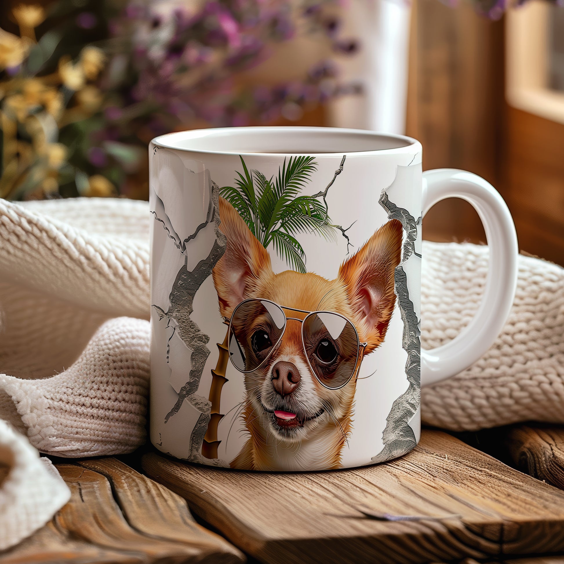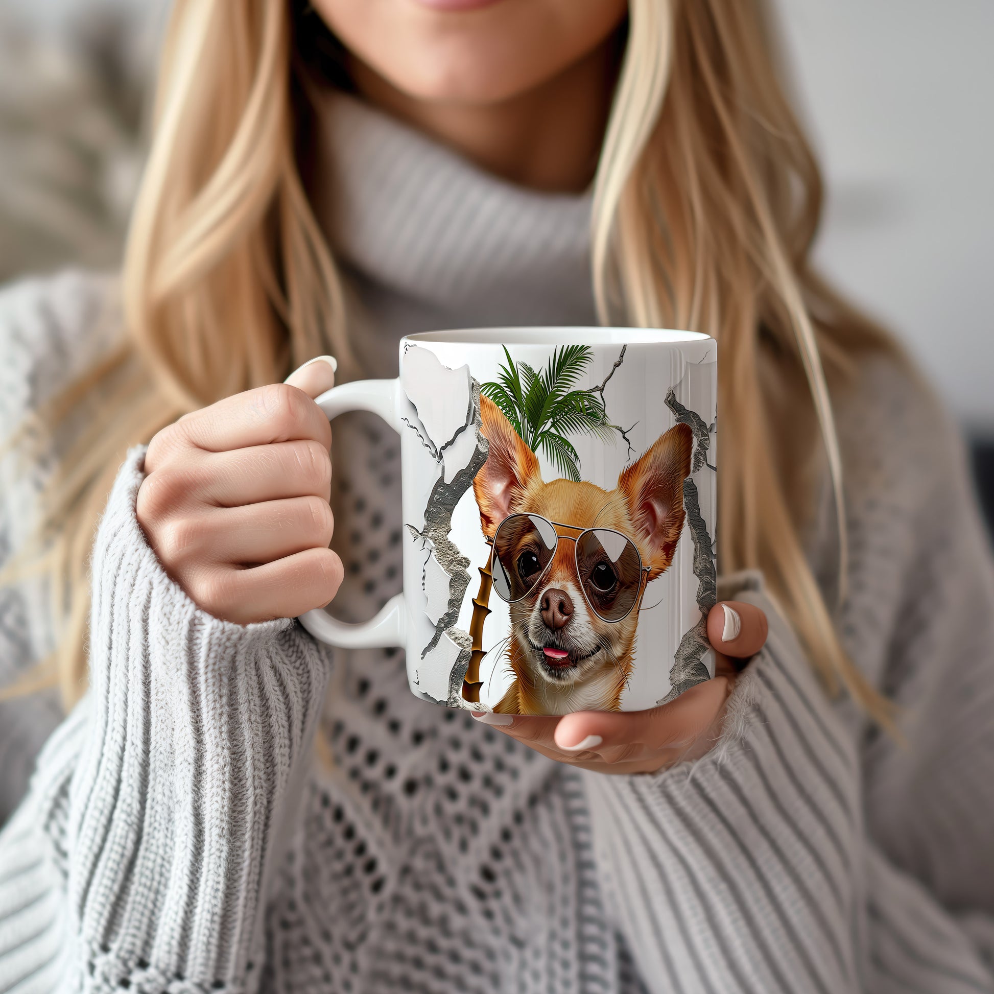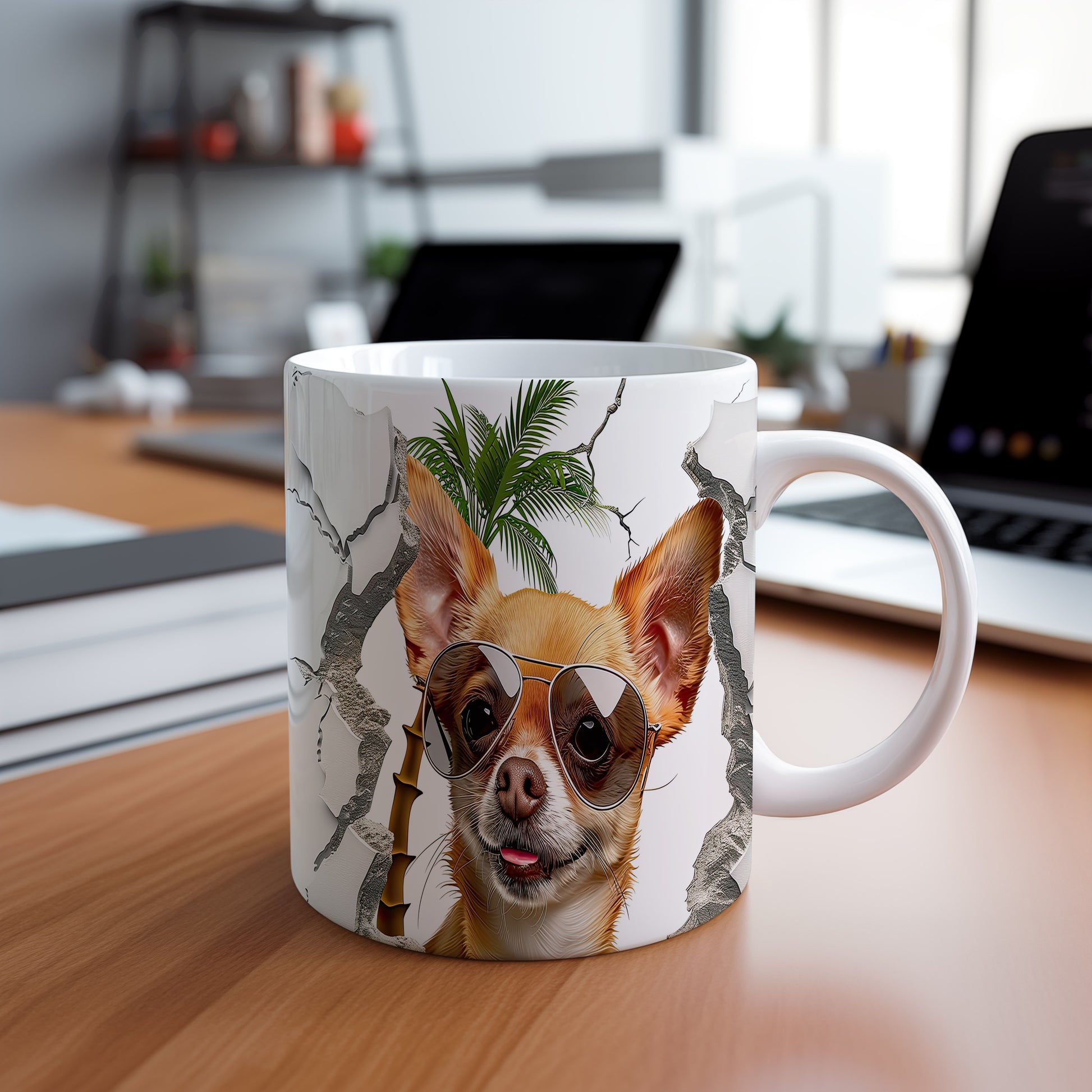 Tento originální hrnek s motivem roztomilé chihuahuá se slunečními brýlemi potěší všechny milovníky psů. Je ideálním dárkem pro přátele nebo rodinu, kteří mají rádi zvířata. Materiál: keramika. Objem: 330 ml. Vhodné do myčky i mikrovlnky. Díky svému designu přináší radost do každodenního pití.