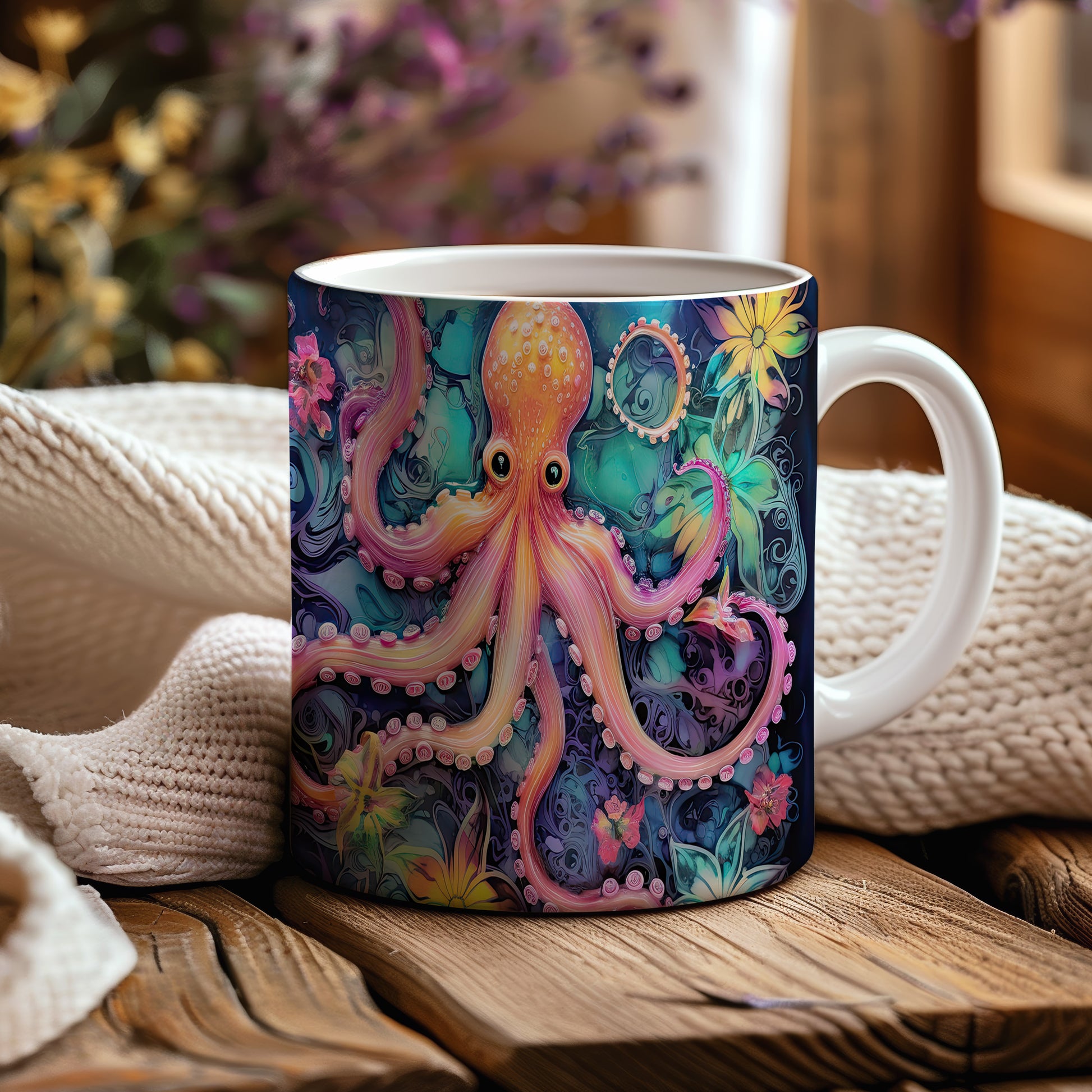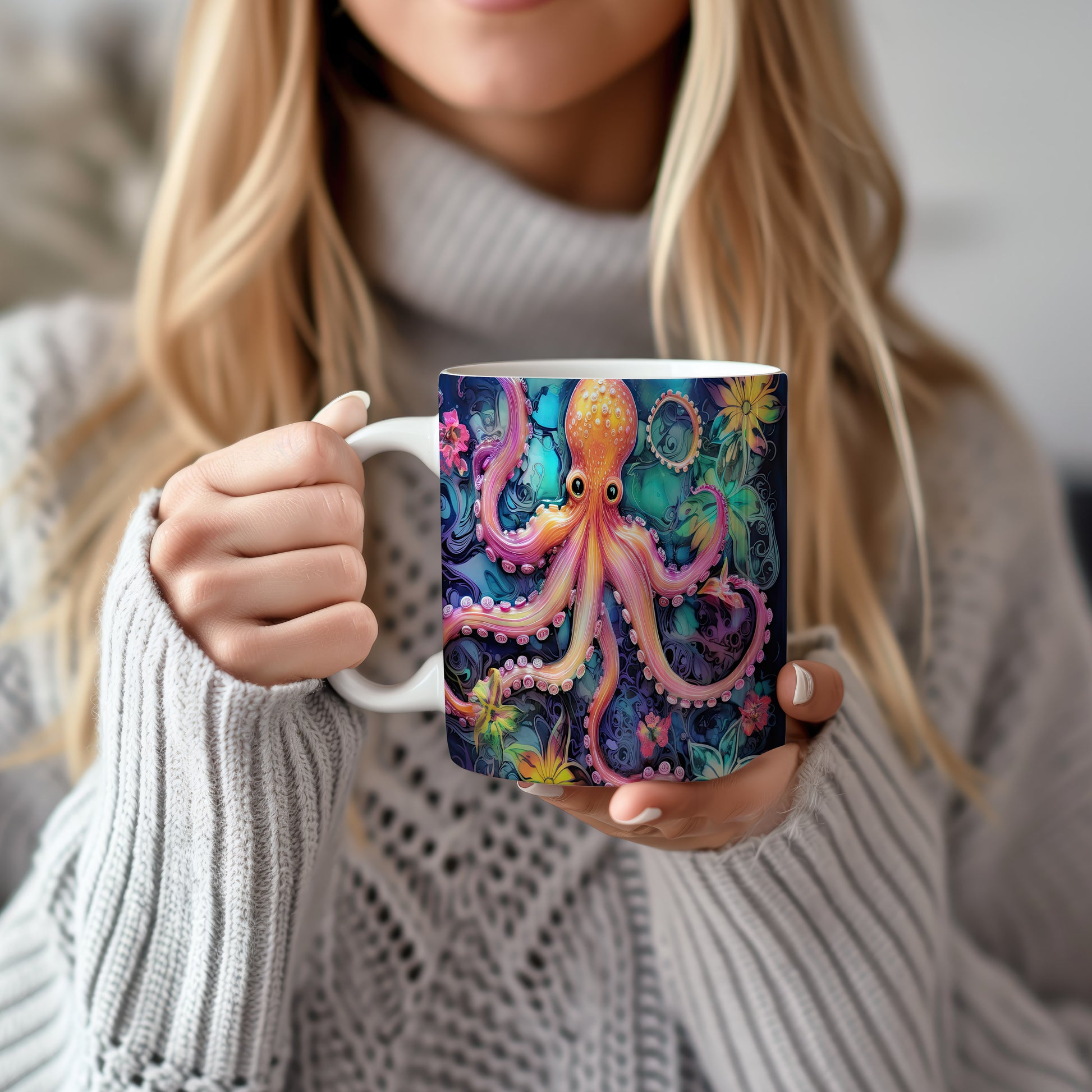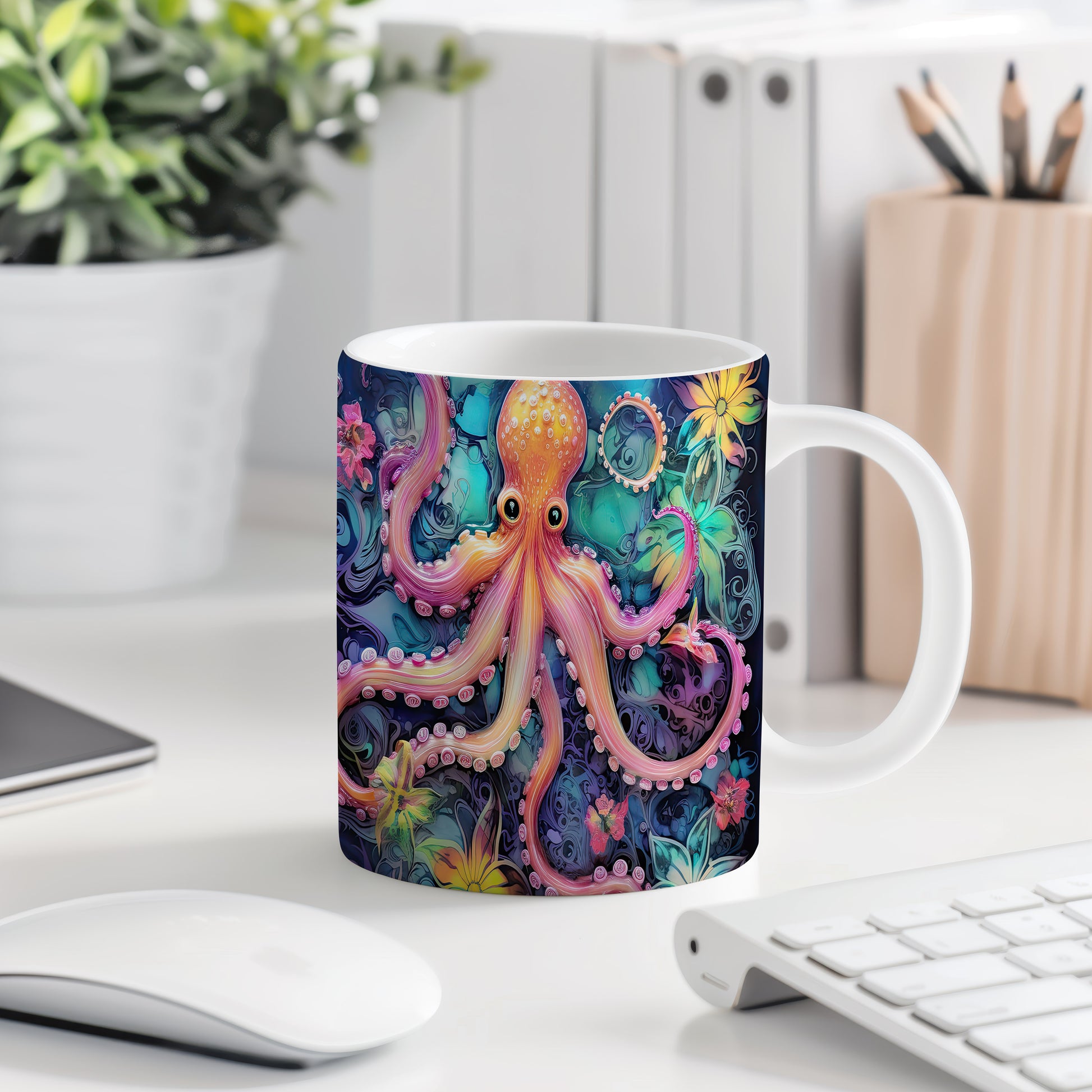 Tento keramický hrnek s motivem chobotnice a barevných květin je skvělým kouskem pro milovníky oceánu a přírody. Je ideální jako dárek pro přátele nebo rodinu, kteří ocení originální design. Materiál: keramika. Objem: 330 ml. Vhodné do myčky i mikrovlnky. Díky svému jedinečnému vzhledu přináší do každodenního pití radost a styl.