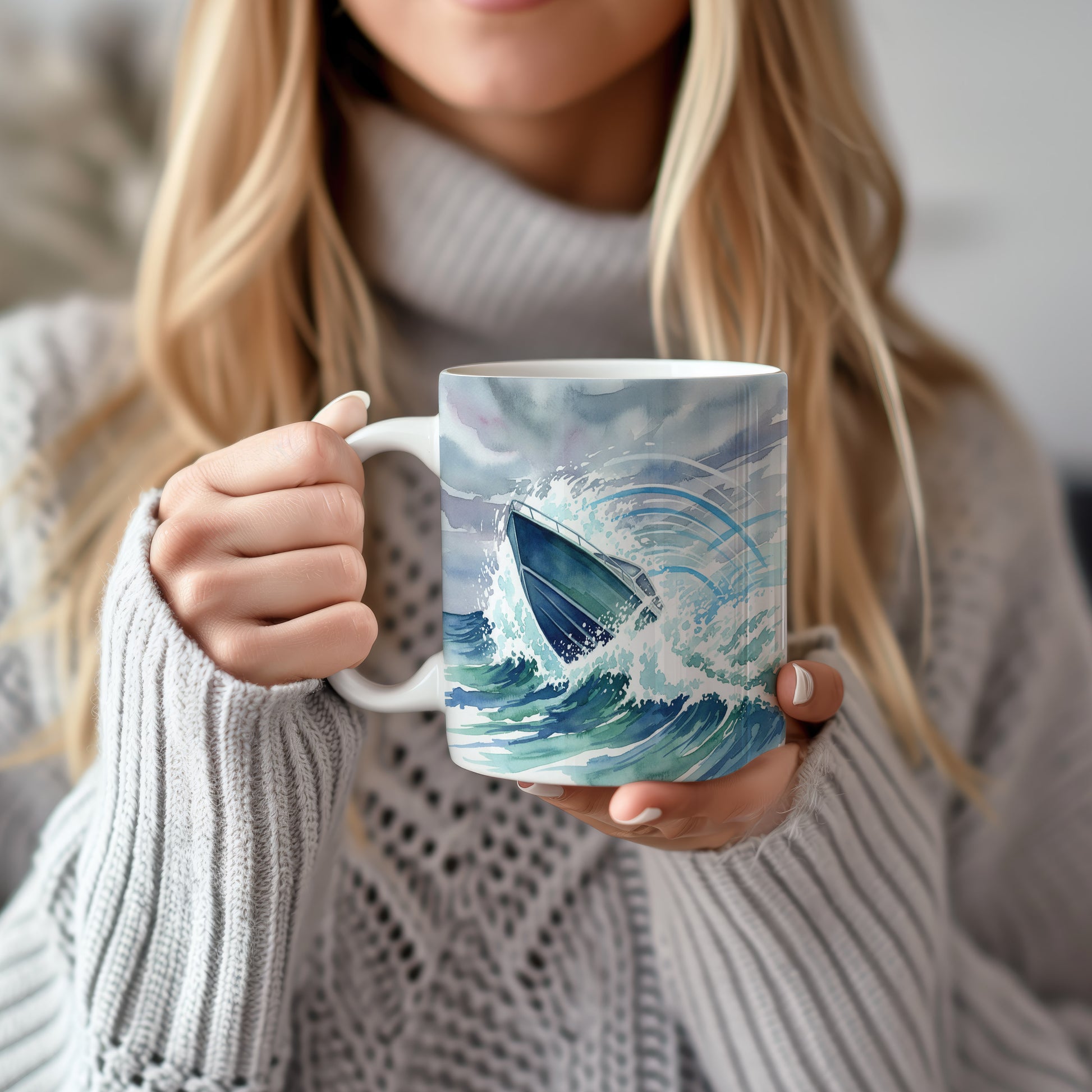 Hrnek s člunem v rozbouřených vlnách