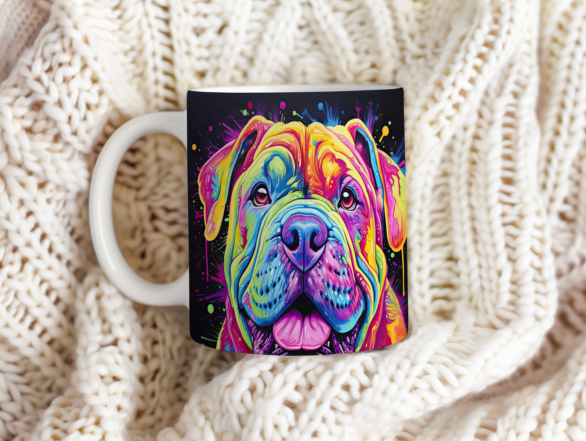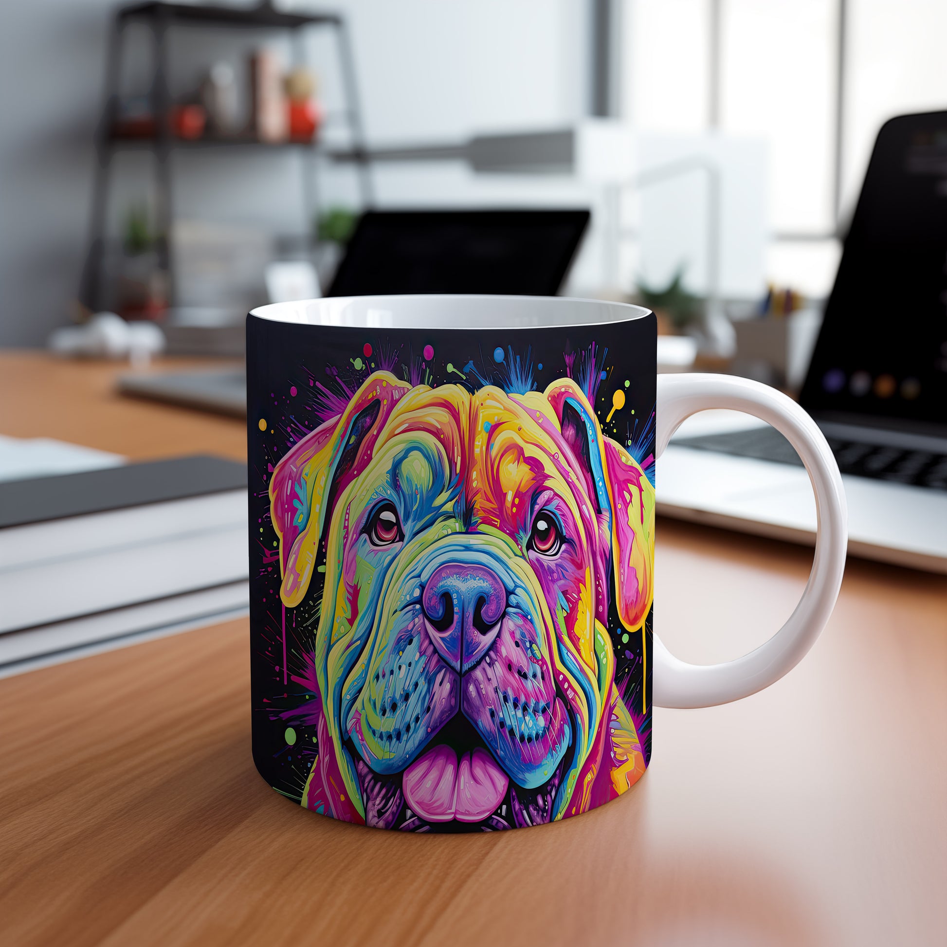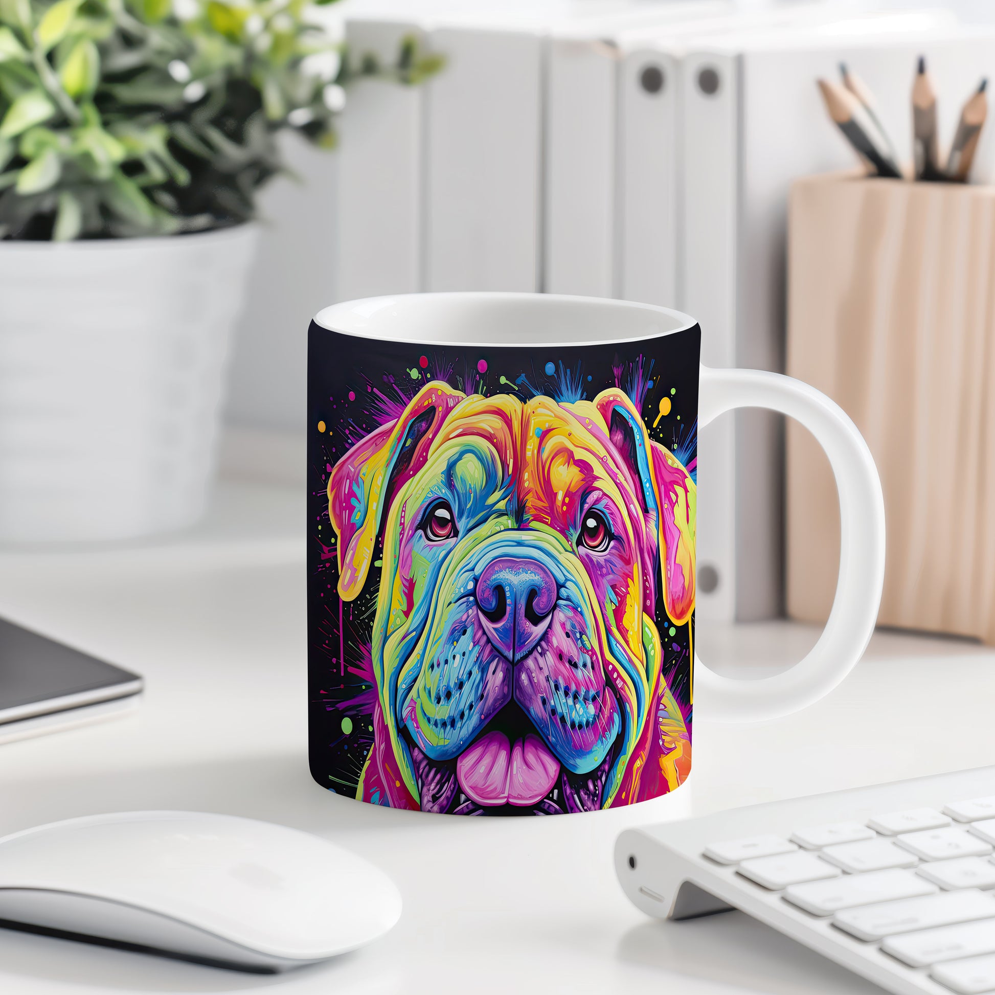 Hrnek s digitální ilustrací barevného psa na veselém pozadí