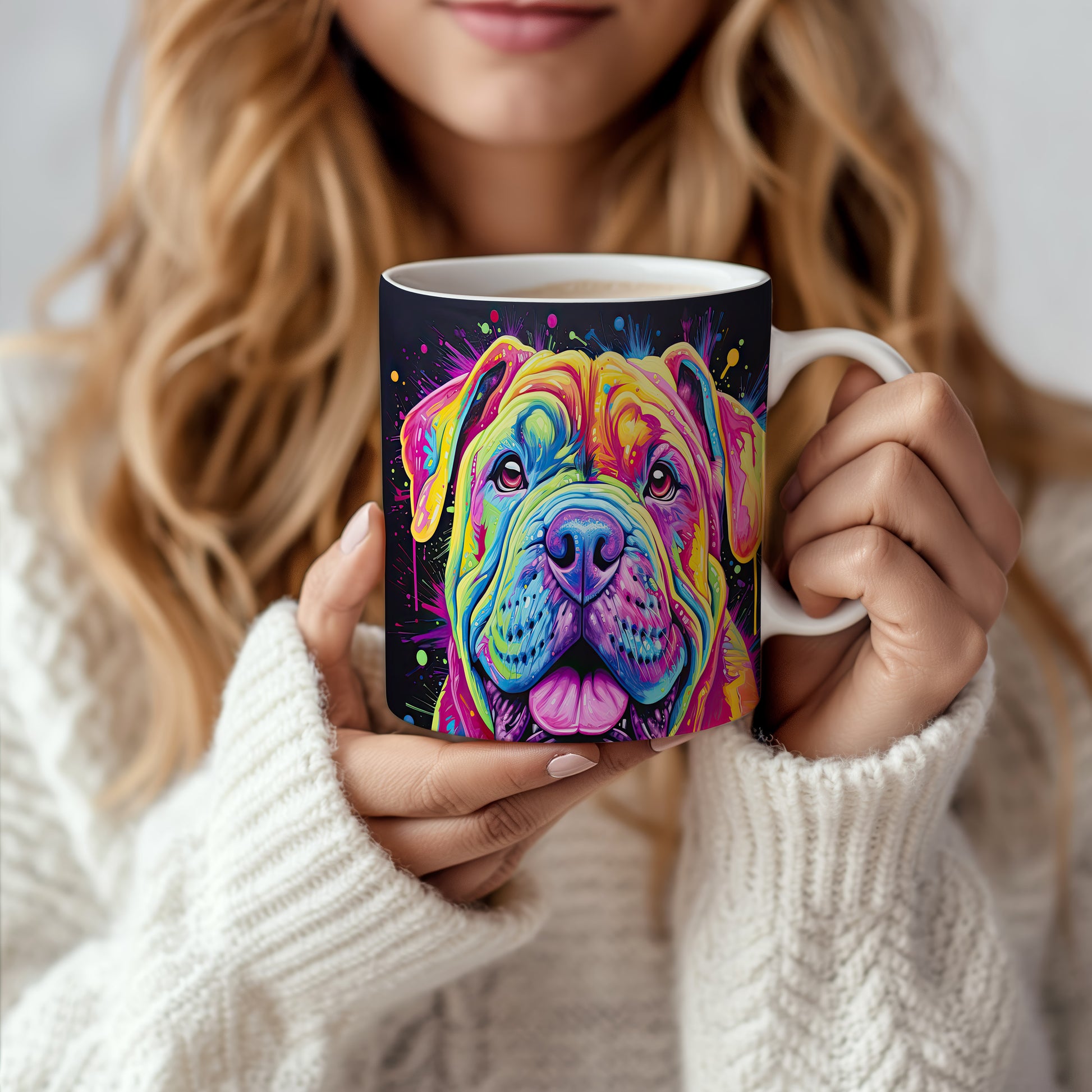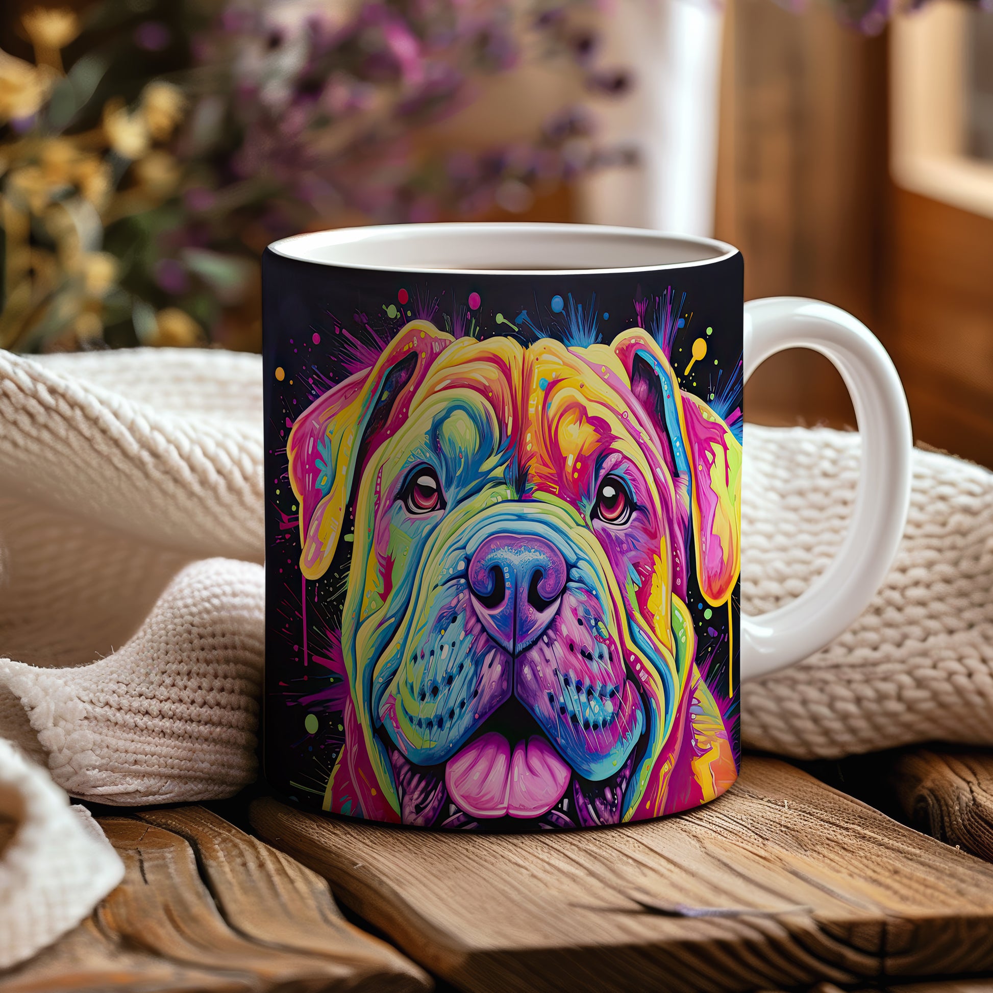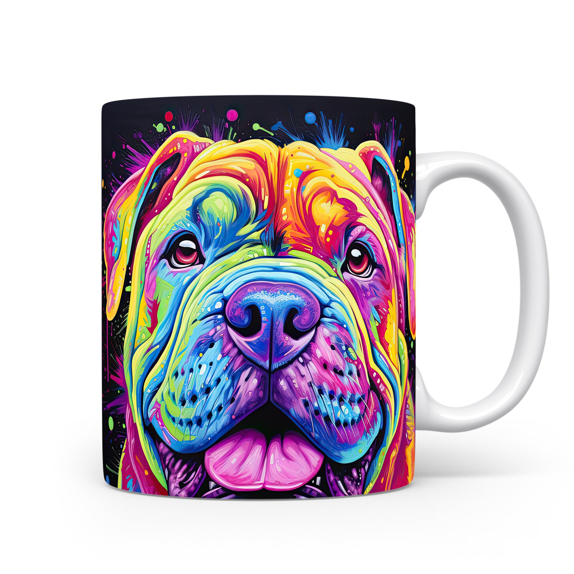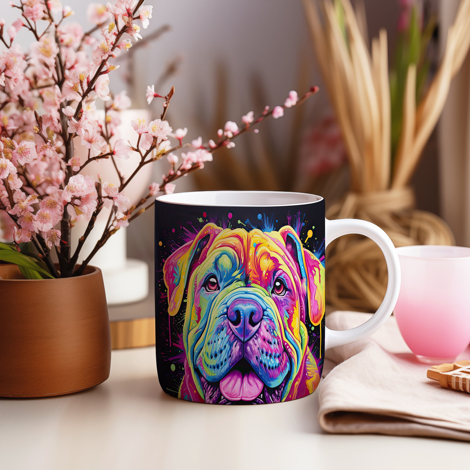 Hrnek s digitální ilustrací barevného psa na veselém pozadí
