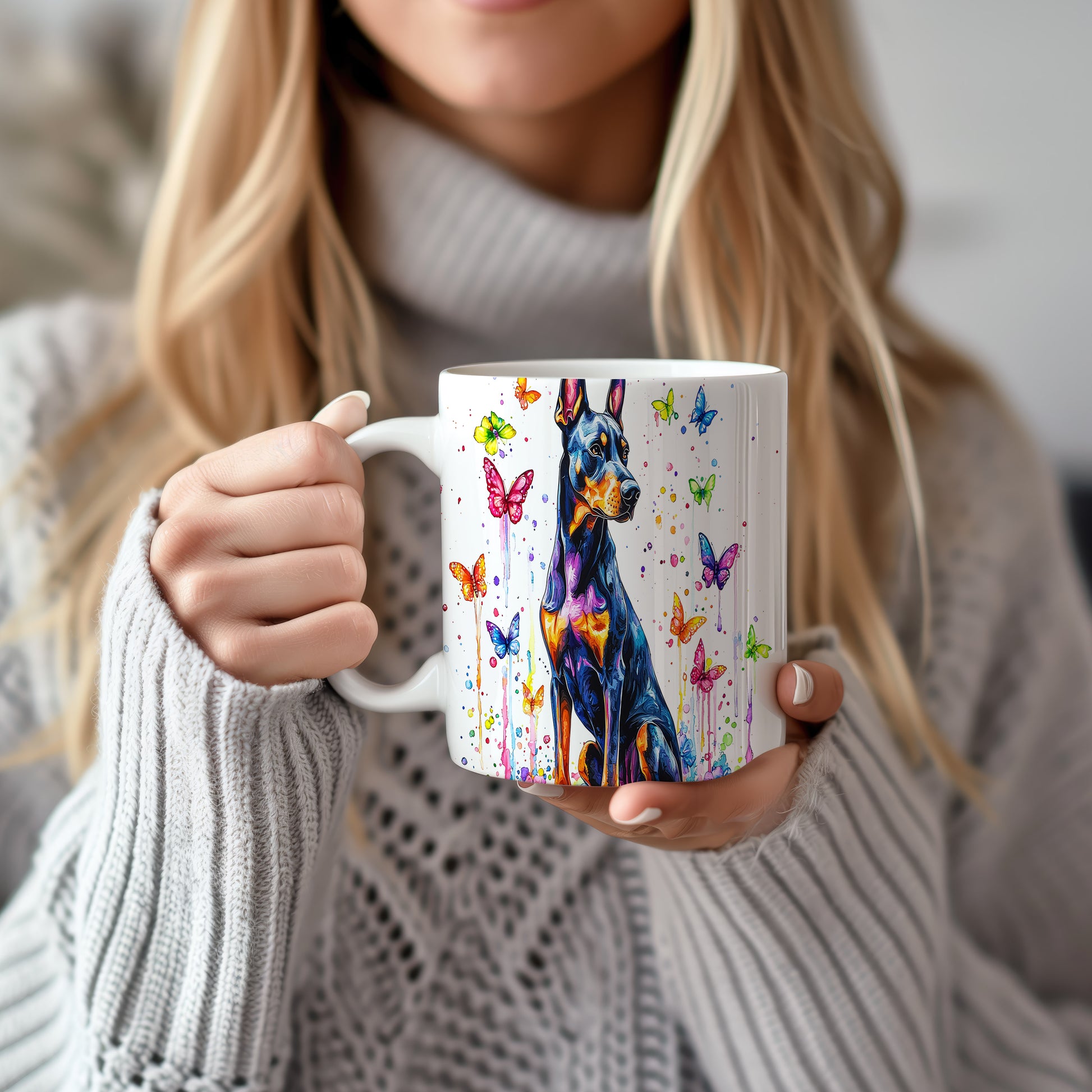 Hrnek s ilustrací dobermana obklopeného barevnými motýly je skvělým kouskem pro milovníky psů a přírody. Tento hrnek potěší každého, kdo ocení originální design a hledá inspiraci pro dárek. Materiál: keramika. Objem: 330 ml. Vhodné do myčky i mikrovlnky. Používání tohoto hrnku přináší radost z každého doušku.
