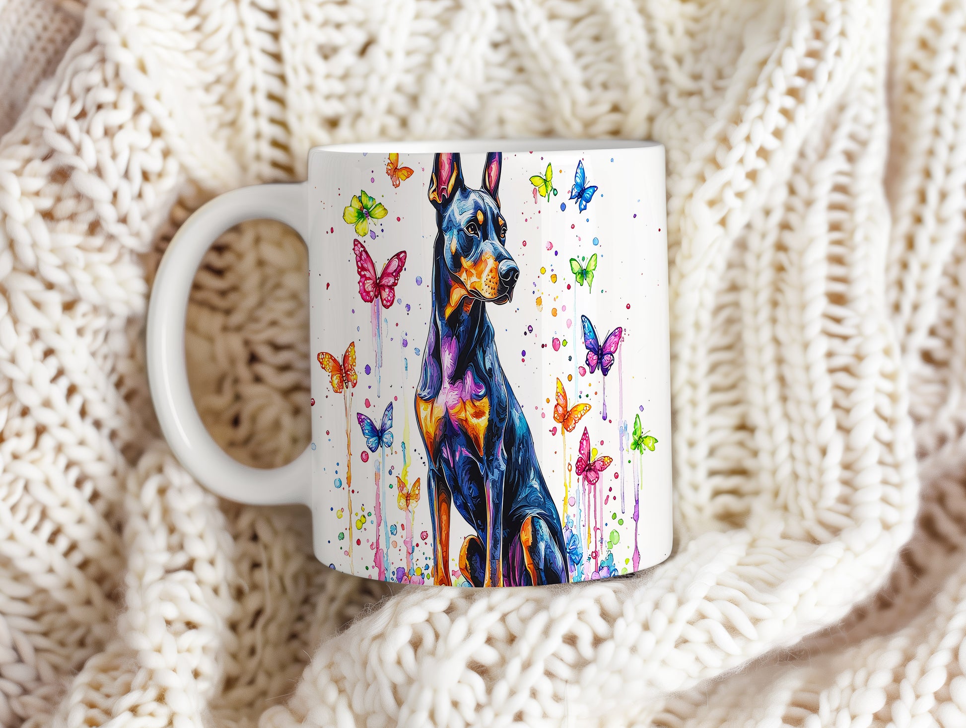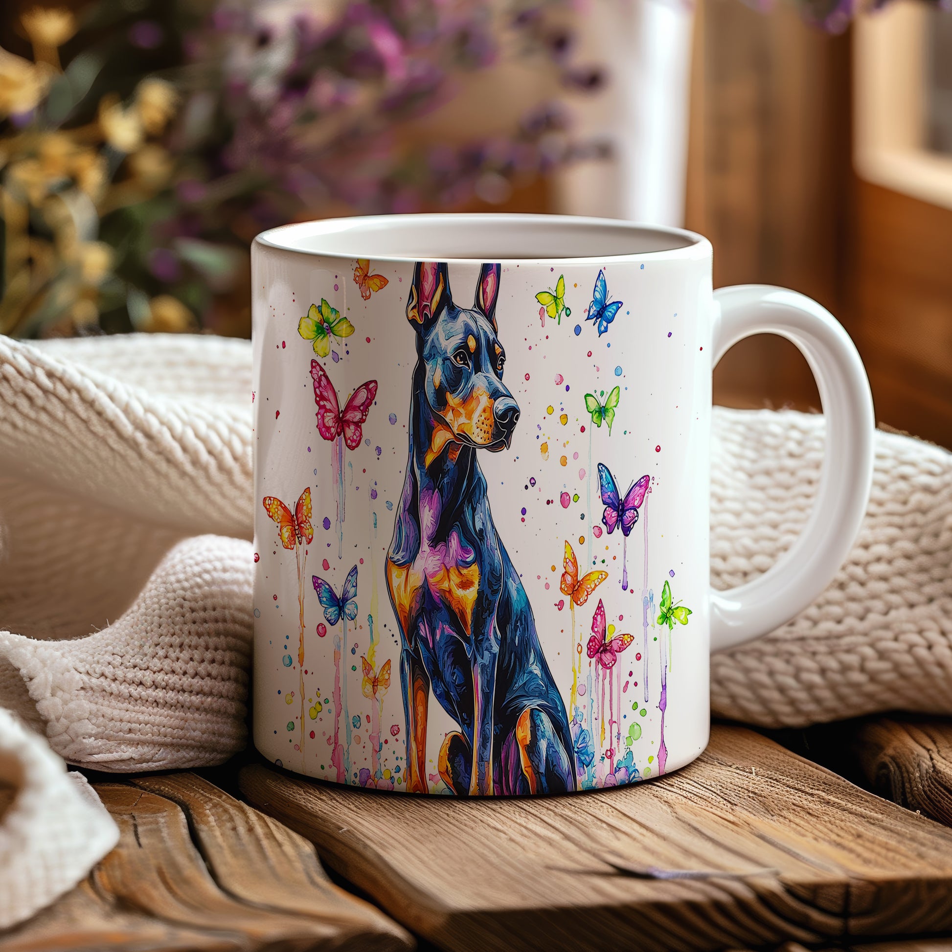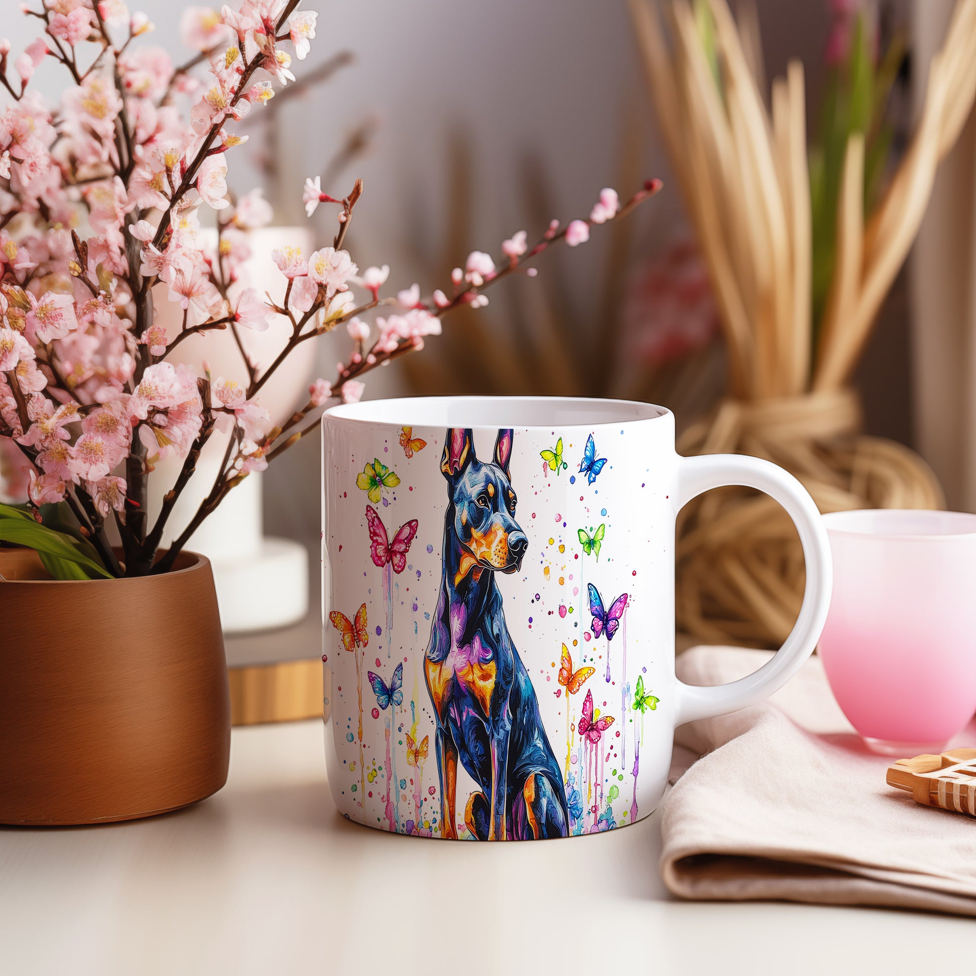 Hrnek s dobermanem a barevnými motýly