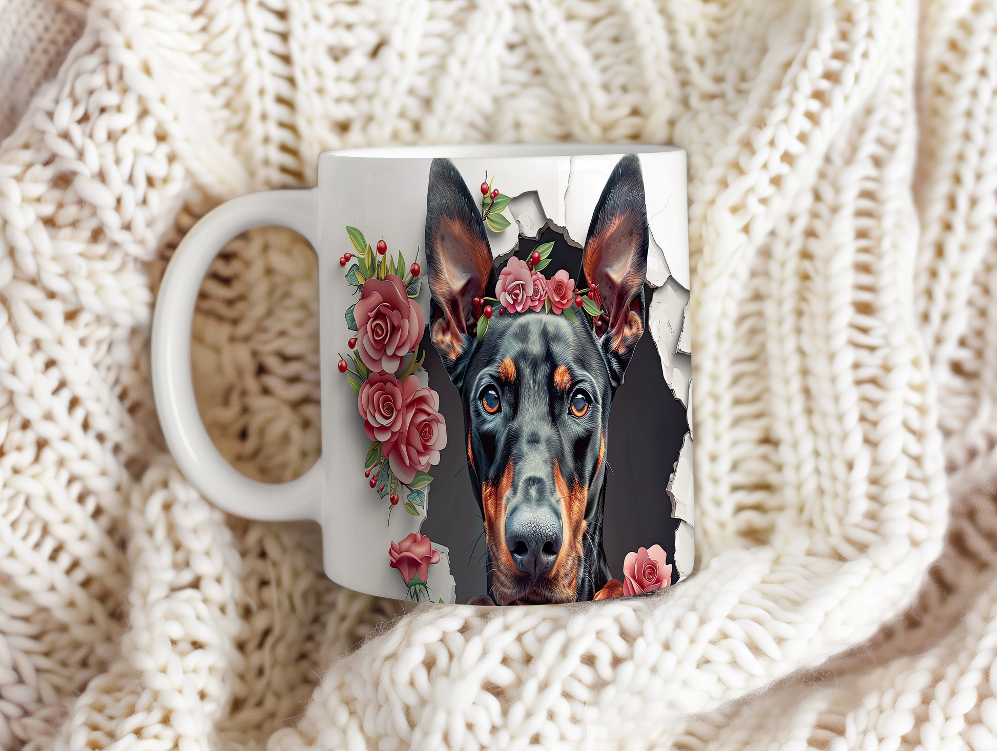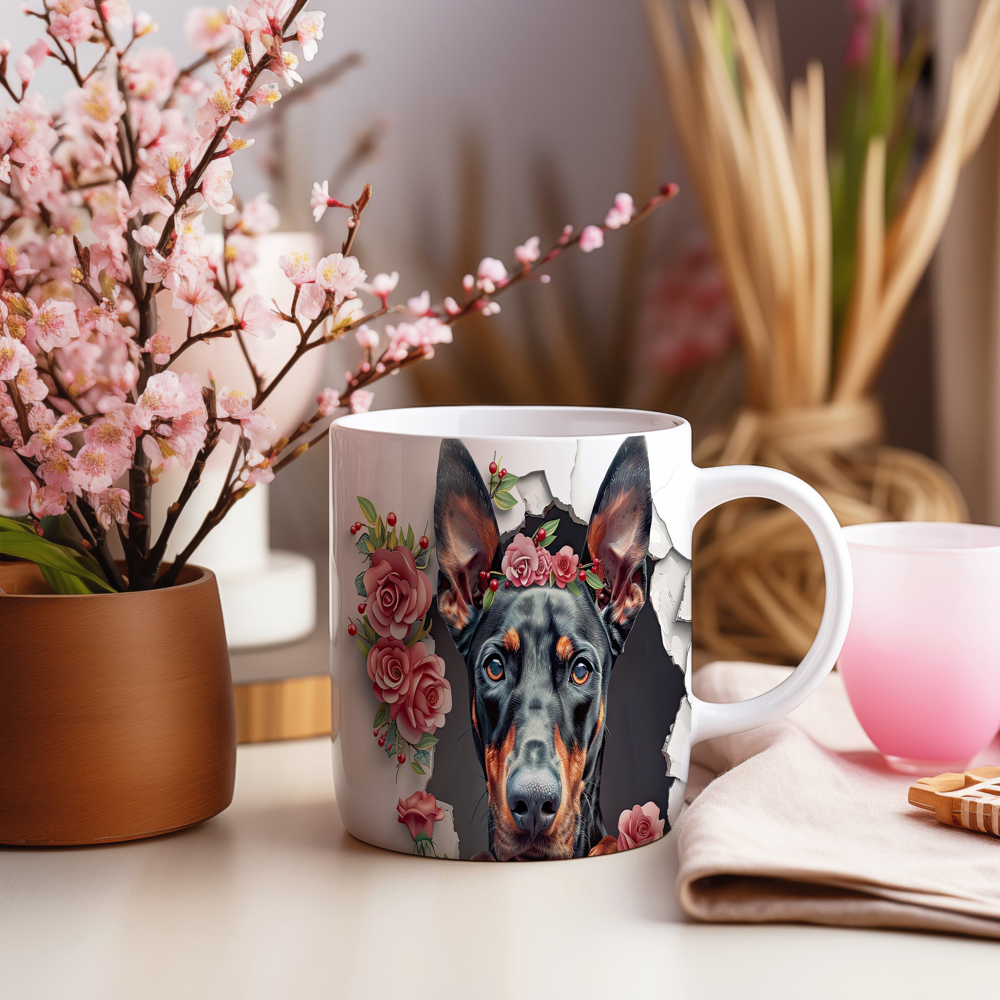 Elegantní hrnek s realistickým vyobrazením dobermana zdobeného květinovou korunou. Tento hrnek potěší každého milovníka psů a je skvělým dárkem pro přátele či rodinu. Materiál: keramika. Objem: 330 ml. Vhodné do myčky i mikrovlnky. Používání tohoto hrnku přináší radost a styl do každodenního pití.