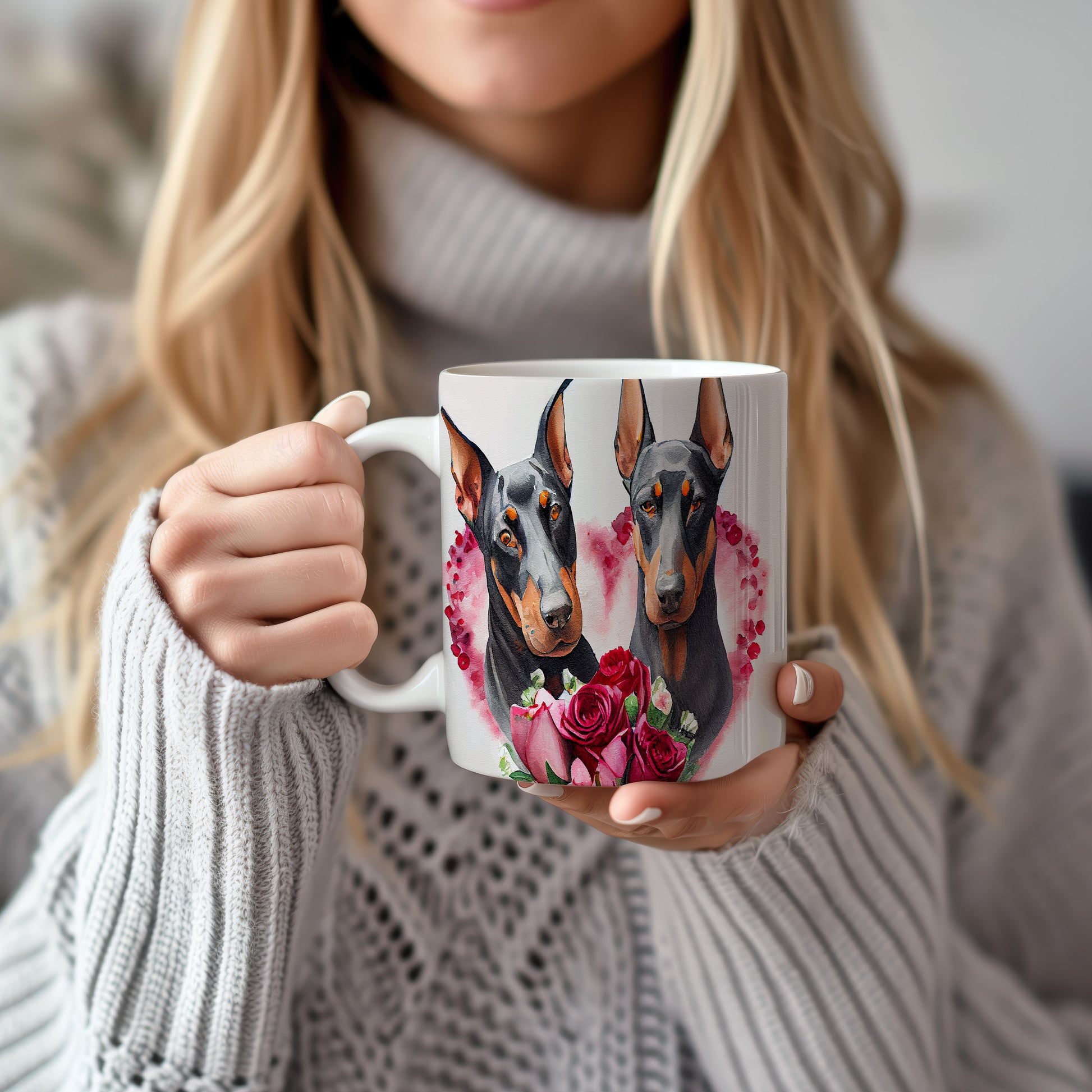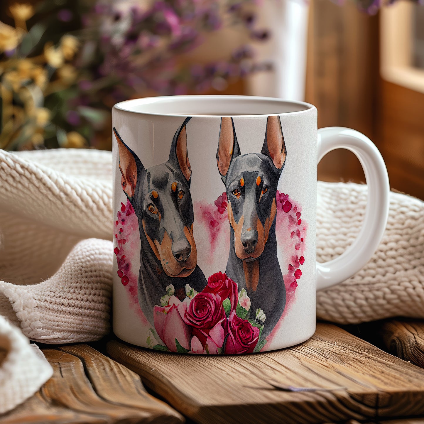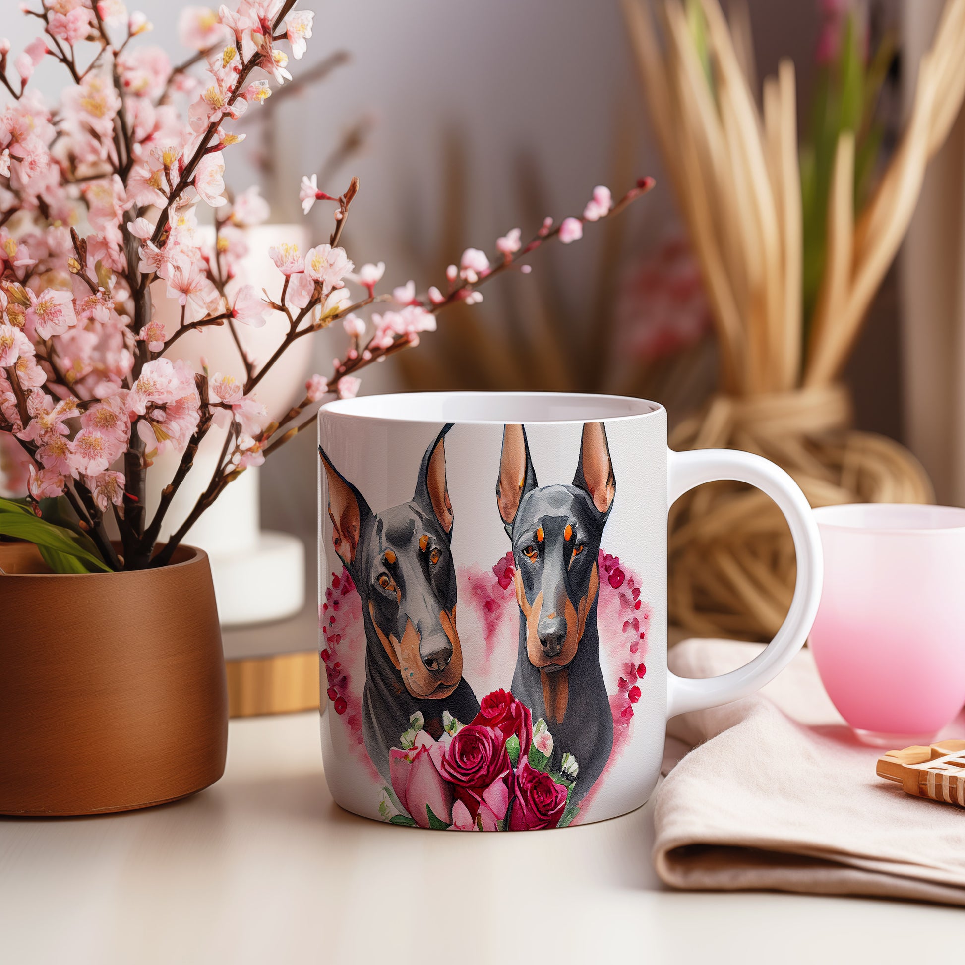 Hrnek s dobermany a květinami přináší realistické zobrazení dvou psů obklopených květinovými motivy. Je ideální jako dárek pro milovníky psů a přírody. Materiál: keramika. Objem: 330 ml. Vhodné do myčky i mikrovlnky. Tento hrnek potěší každého, kdo ocení krásu a jedinečnost designu.