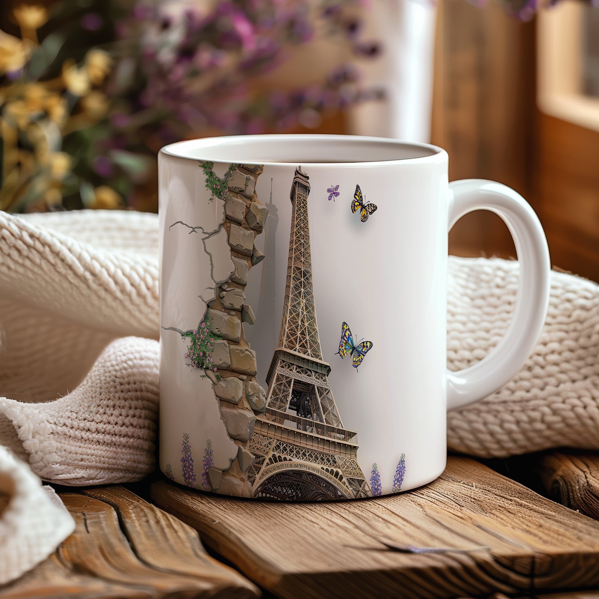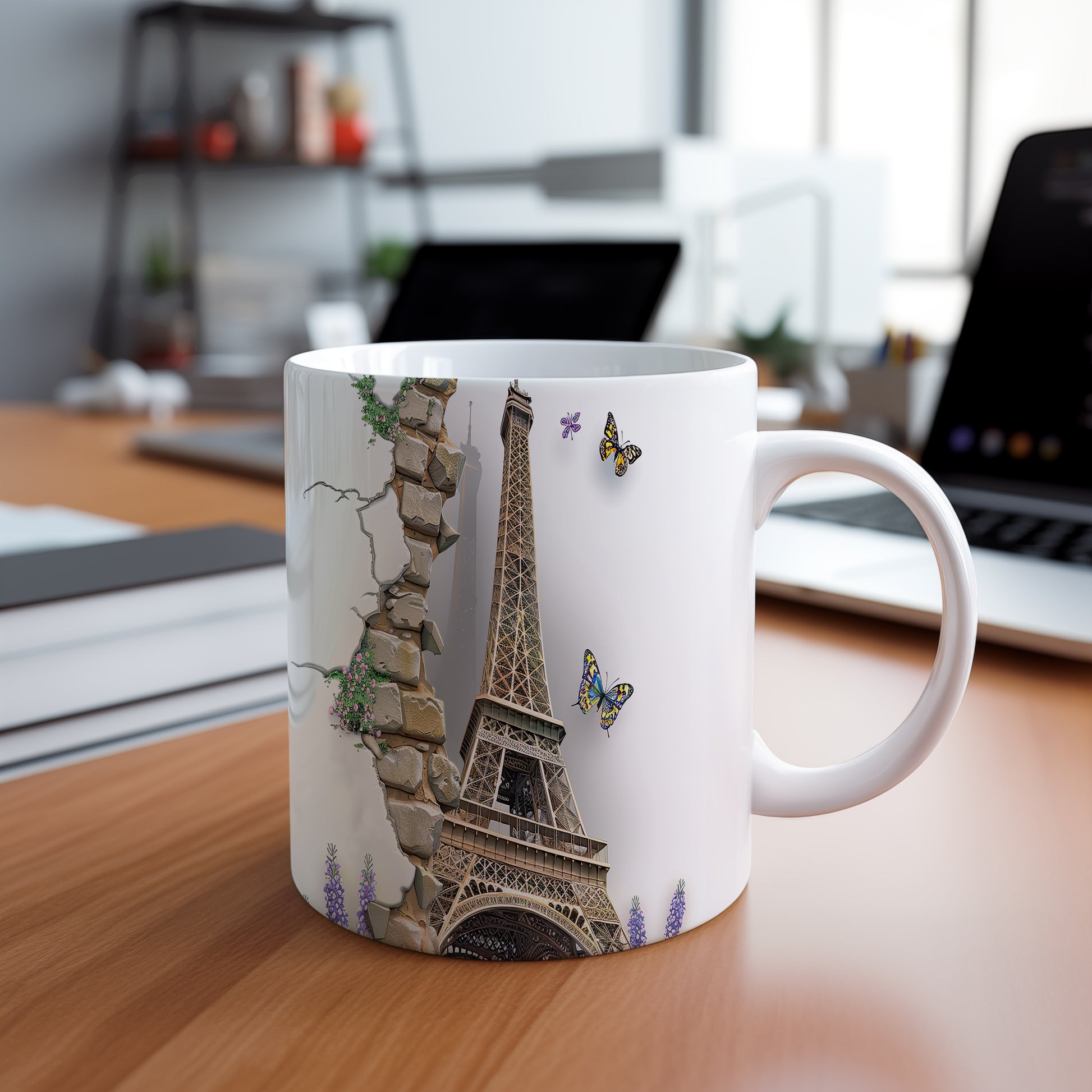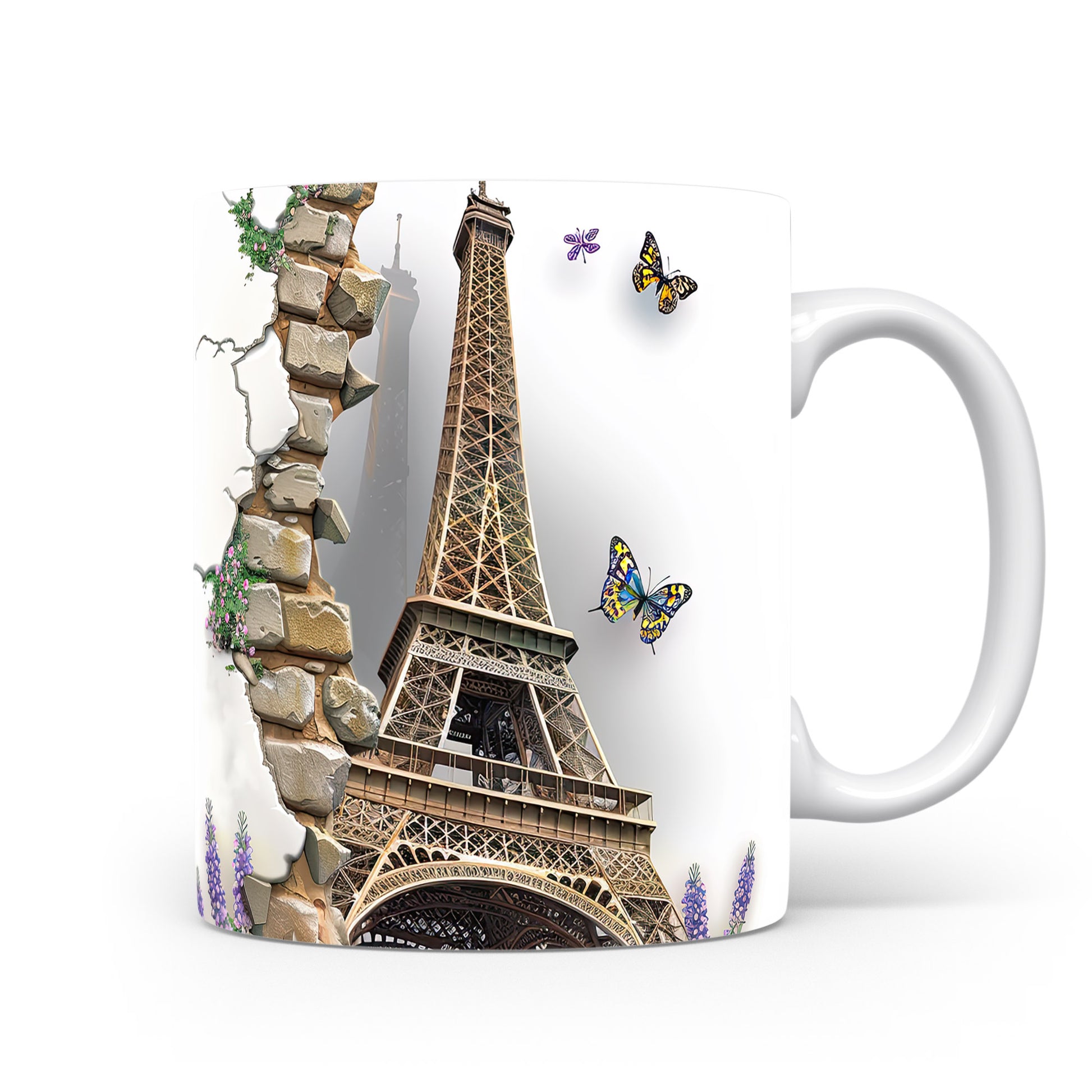 Elegantní hrnek s motivem Eiffelovy věže a barevnými motýly. Tento hrnek je ideální pro milovníky Paříže a přírody, skvělý tip na dárek pro každého, kdo ocení krásu. Materiál: keramika. Objem: 330 ml. Vhodné do myčky i mikrovlnky. Používáním tohoto hrnku si můžete vychutnat svůj oblíbený nápoj s nádechem elegance.
