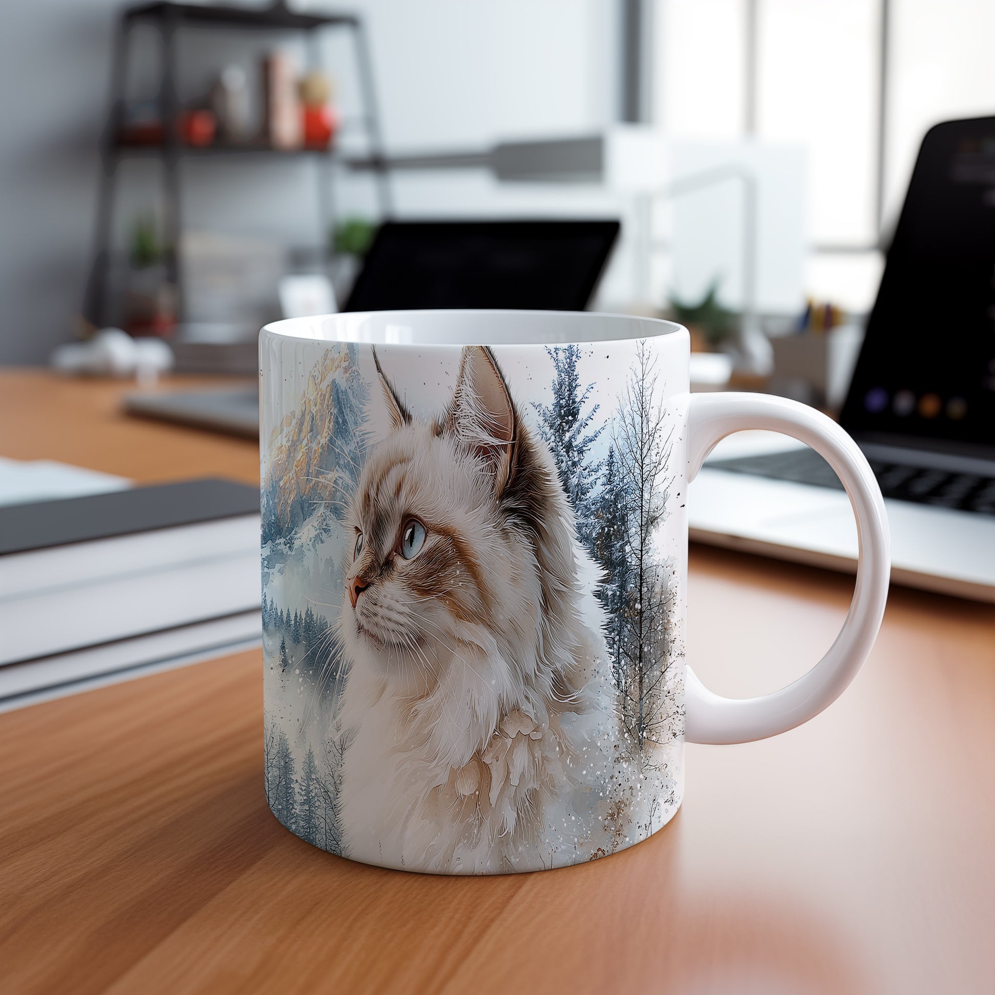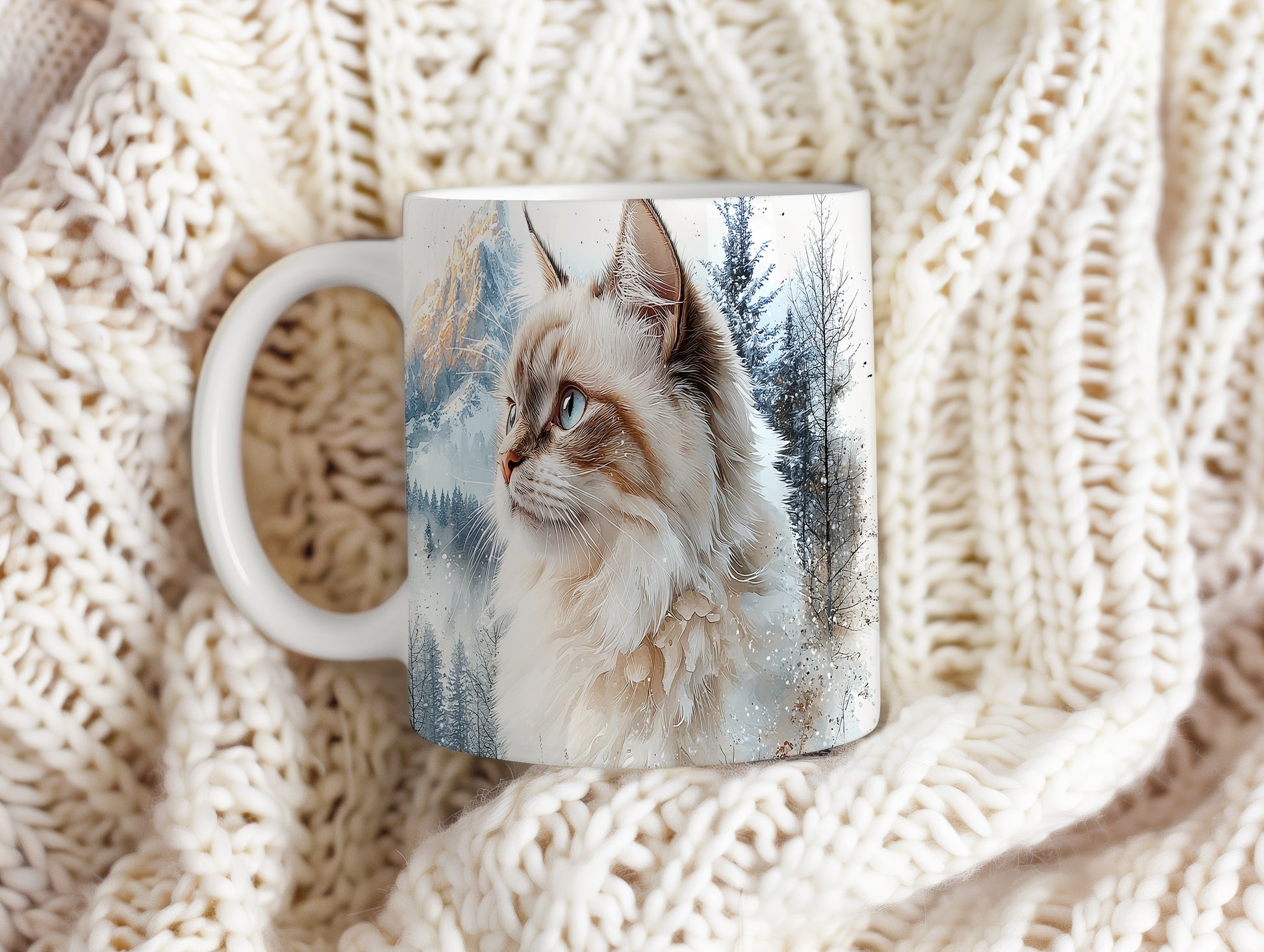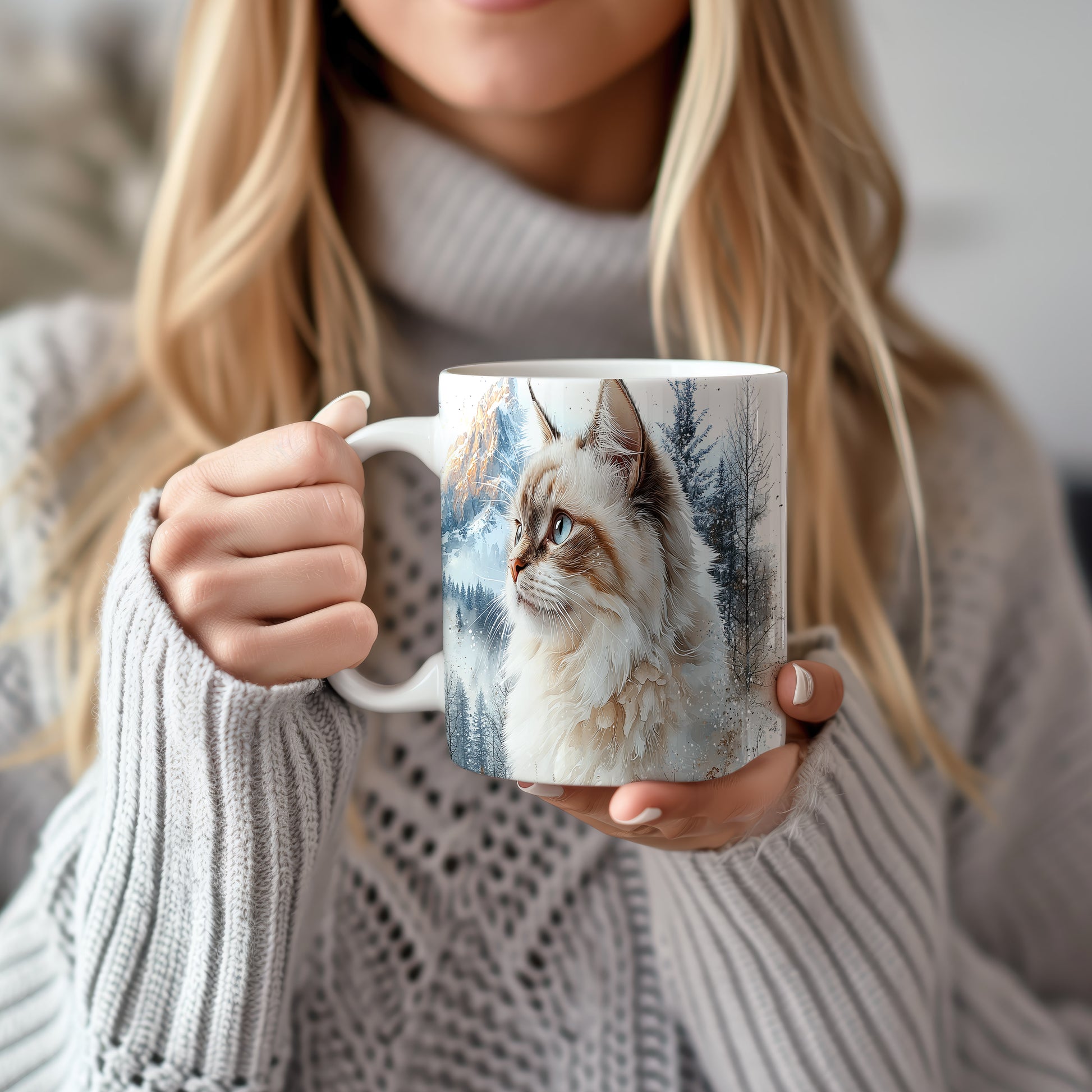 Tento hrnek zobrazuje elegantní kočku s modrýma očima a jemným kožíškem, zasazenou do zimní krajiny. Je ideální pro milovníky koček a skvělým dárkem pro přátele či rodinu. Materiál: keramika. Objem: 330 ml. Vhodné do myčky i mikrovlnky. Díky svému designu přináší do každodenního pití špetku elegance.