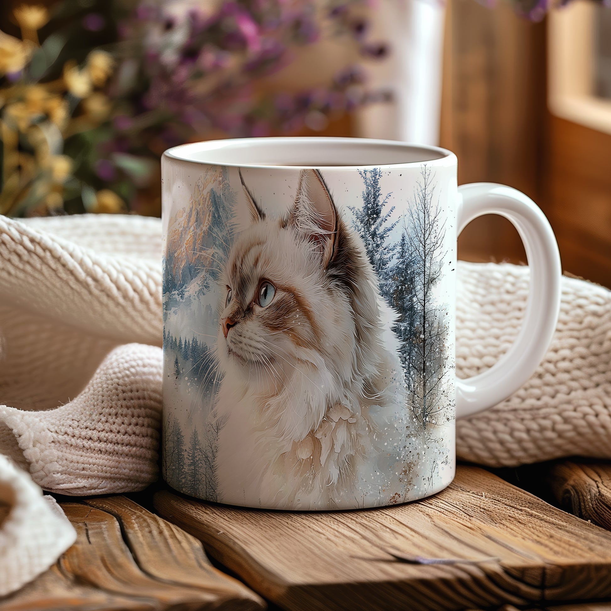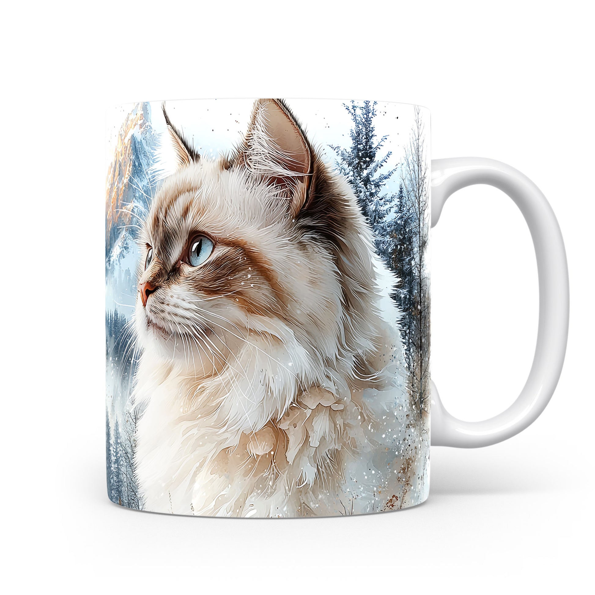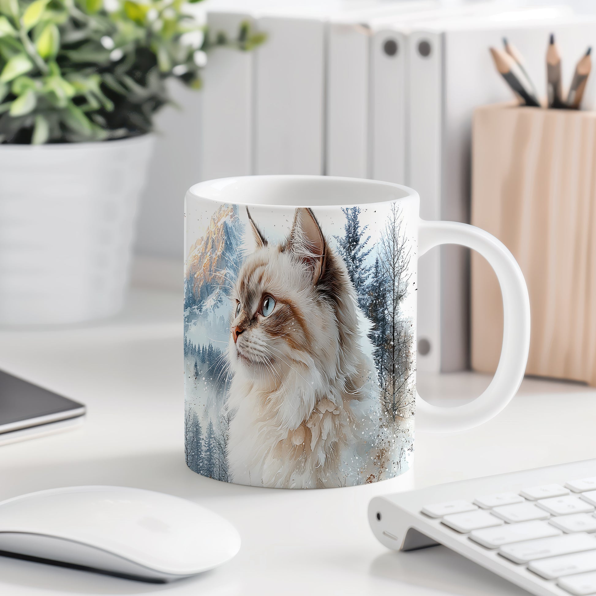 Tento hrnek zobrazuje elegantní kočku s modrýma očima a jemným kožíškem, zasazenou do zimní krajiny. Je ideální pro milovníky koček a skvělým dárkem pro přátele či rodinu. Materiál: keramika. Objem: 330 ml. Vhodné do myčky i mikrovlnky. Díky svému designu přináší do každodenního pití špetku elegance.