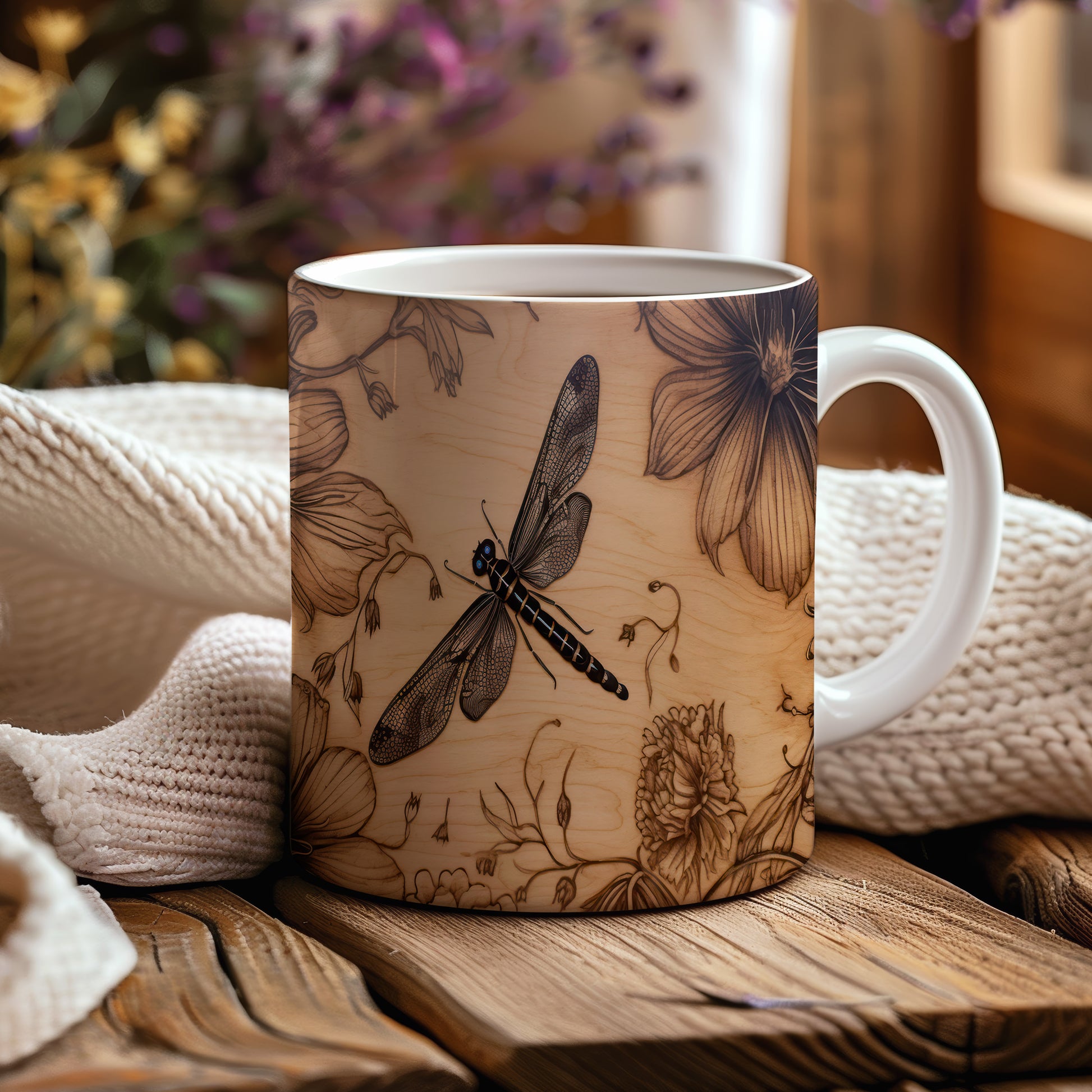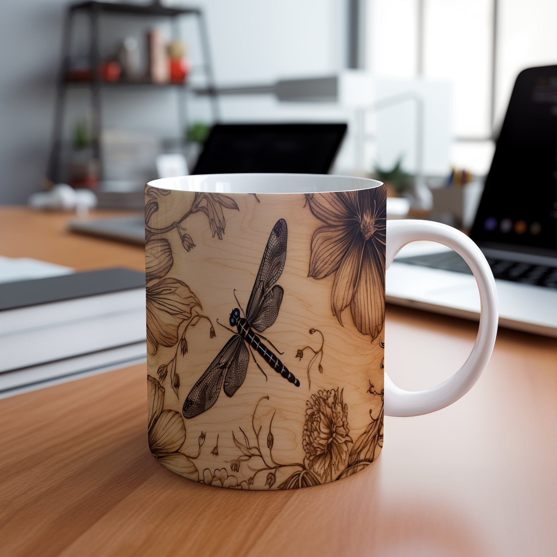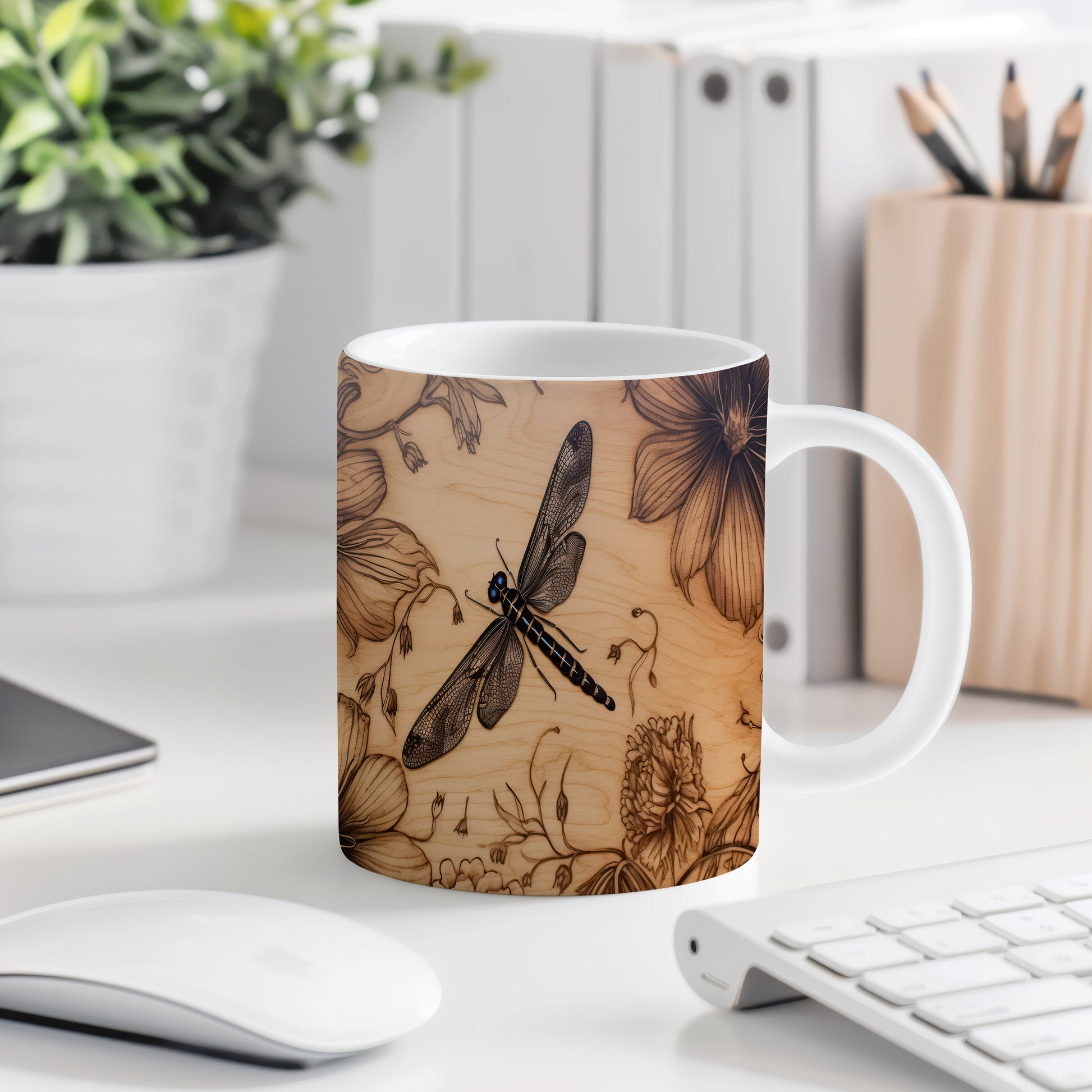 Hrnek s elegantní vážkou a květinovými motivy v přírodním stylu