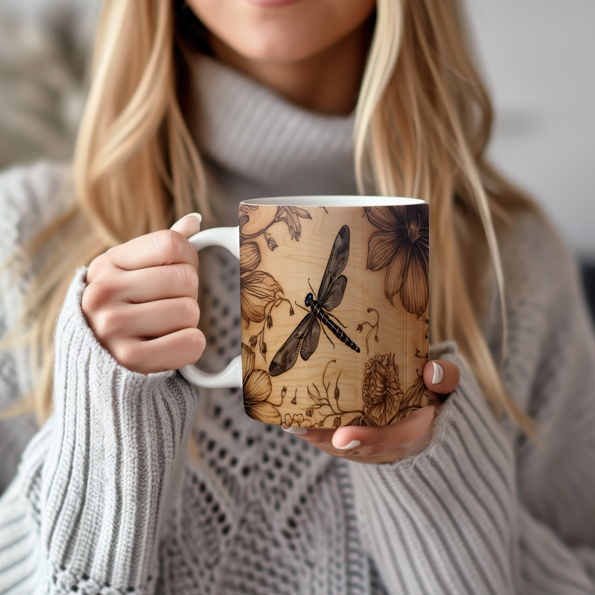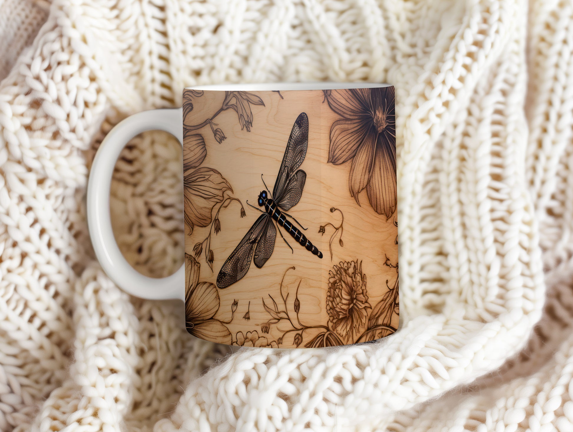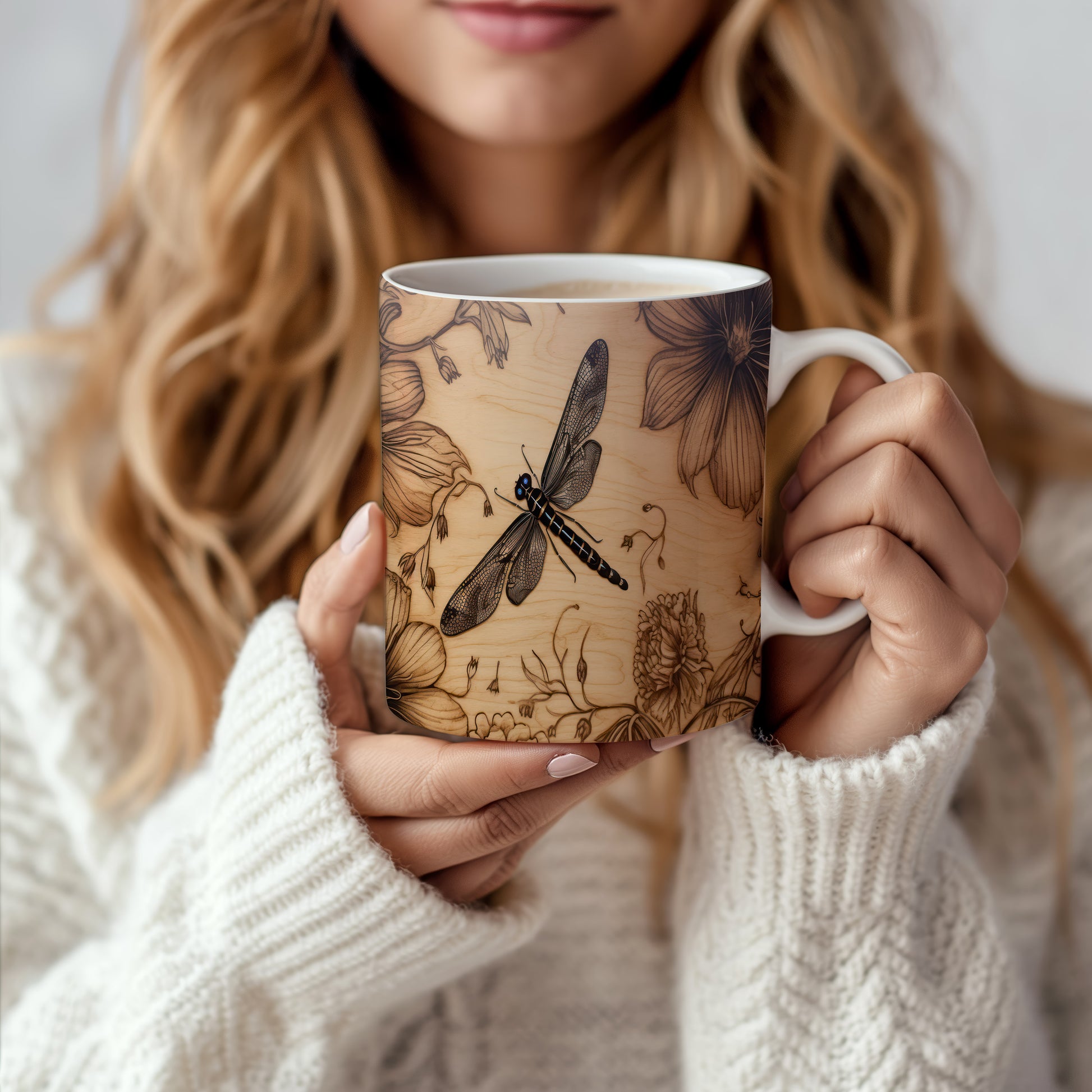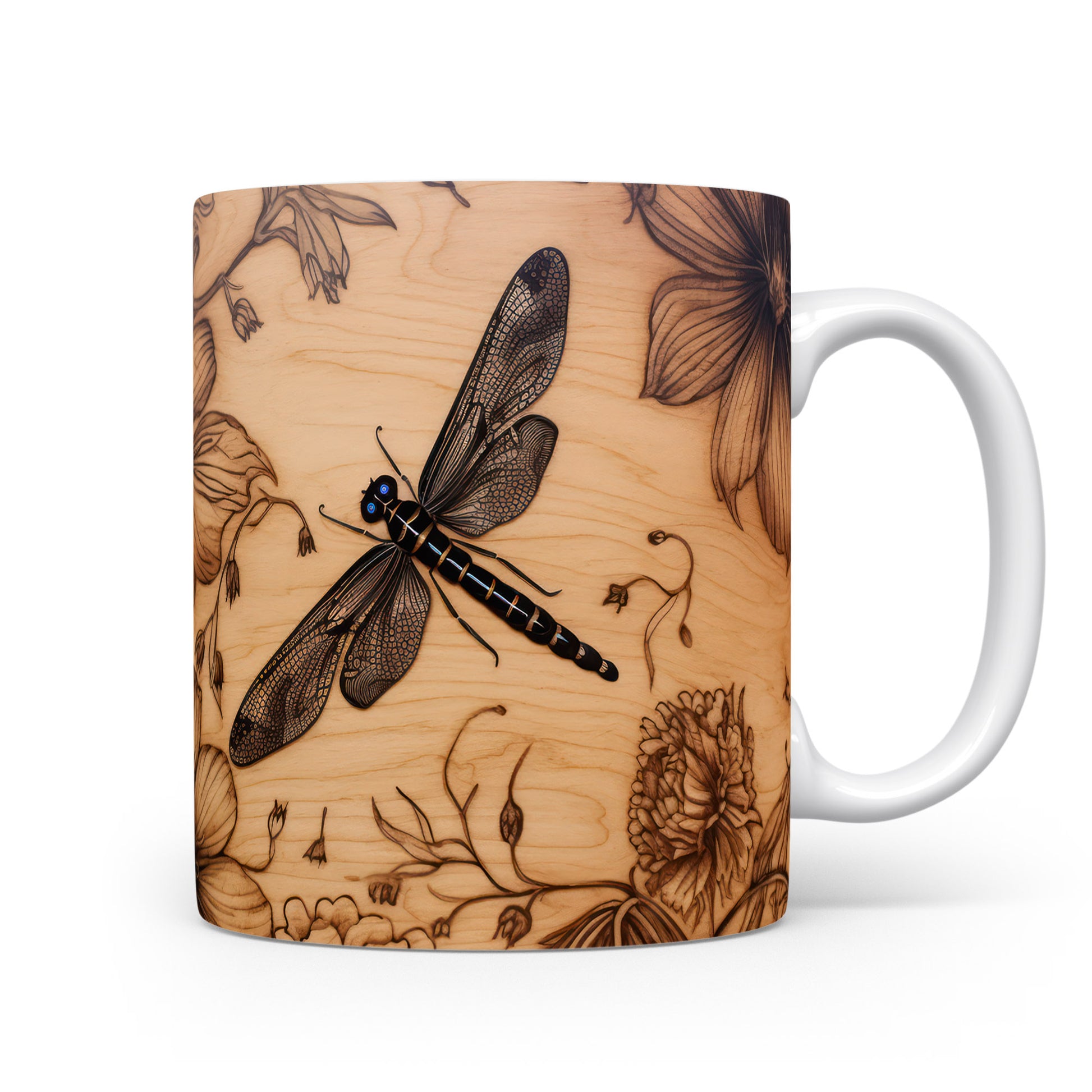 Hrnek s elegantní vážkou a květinovými motivy v přírodním stylu