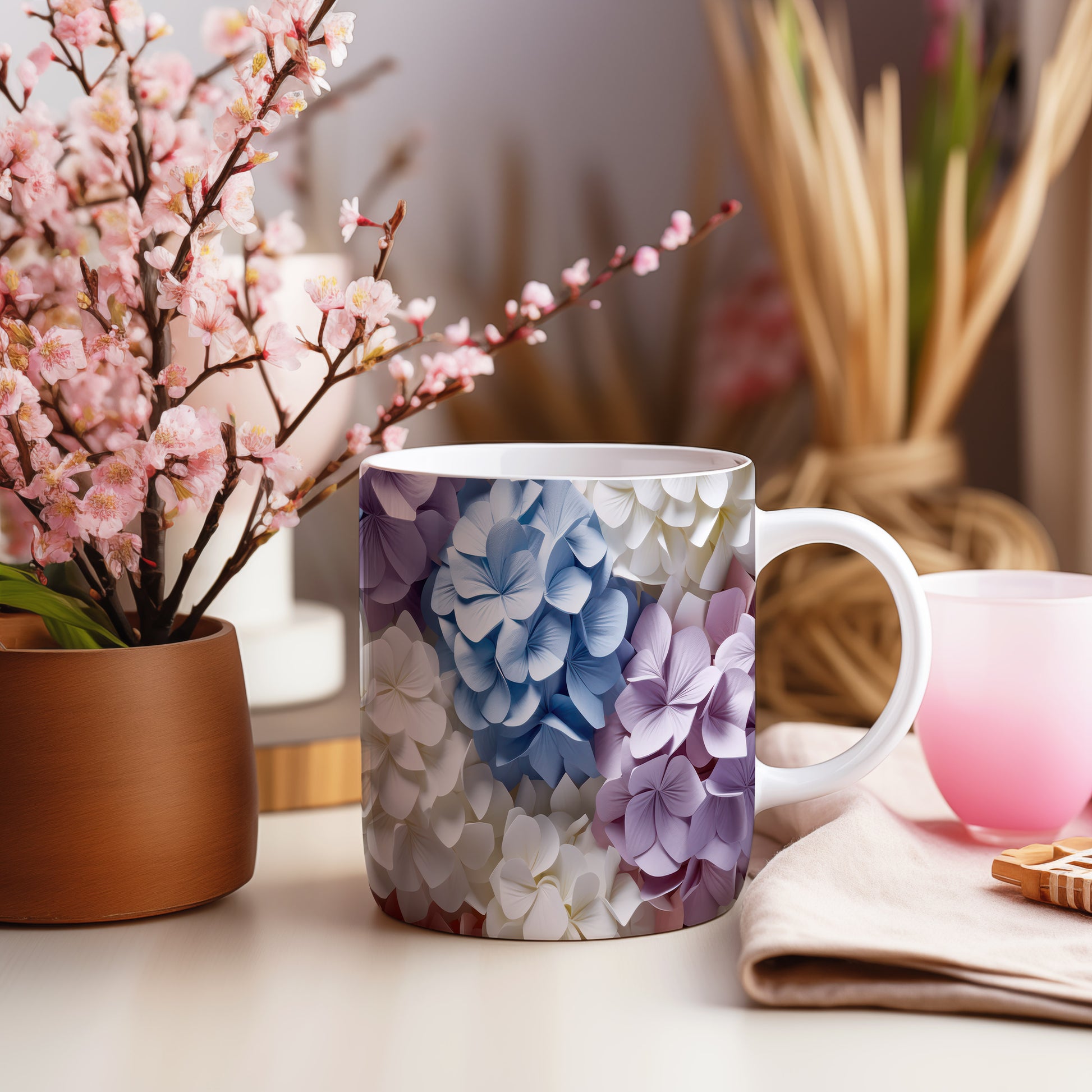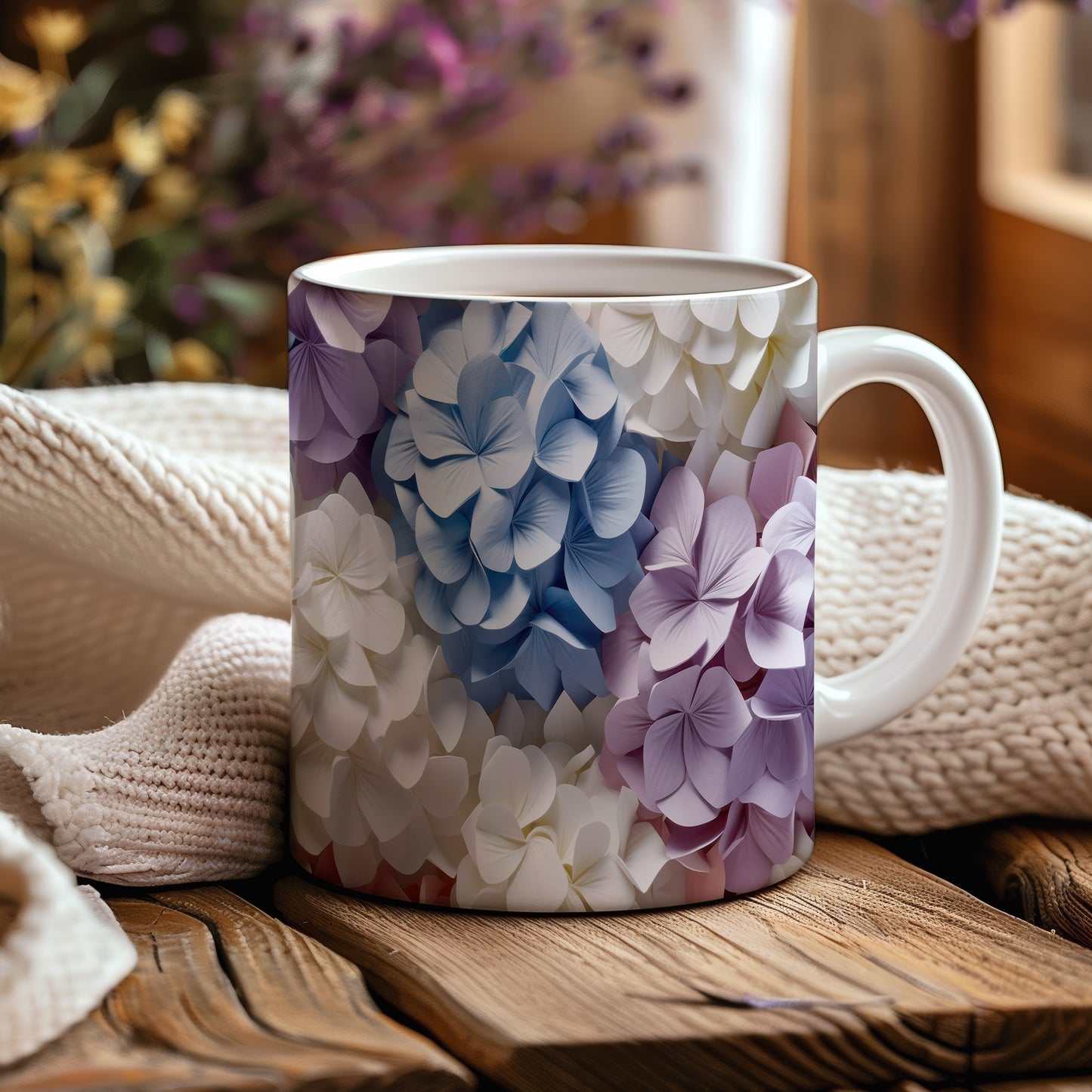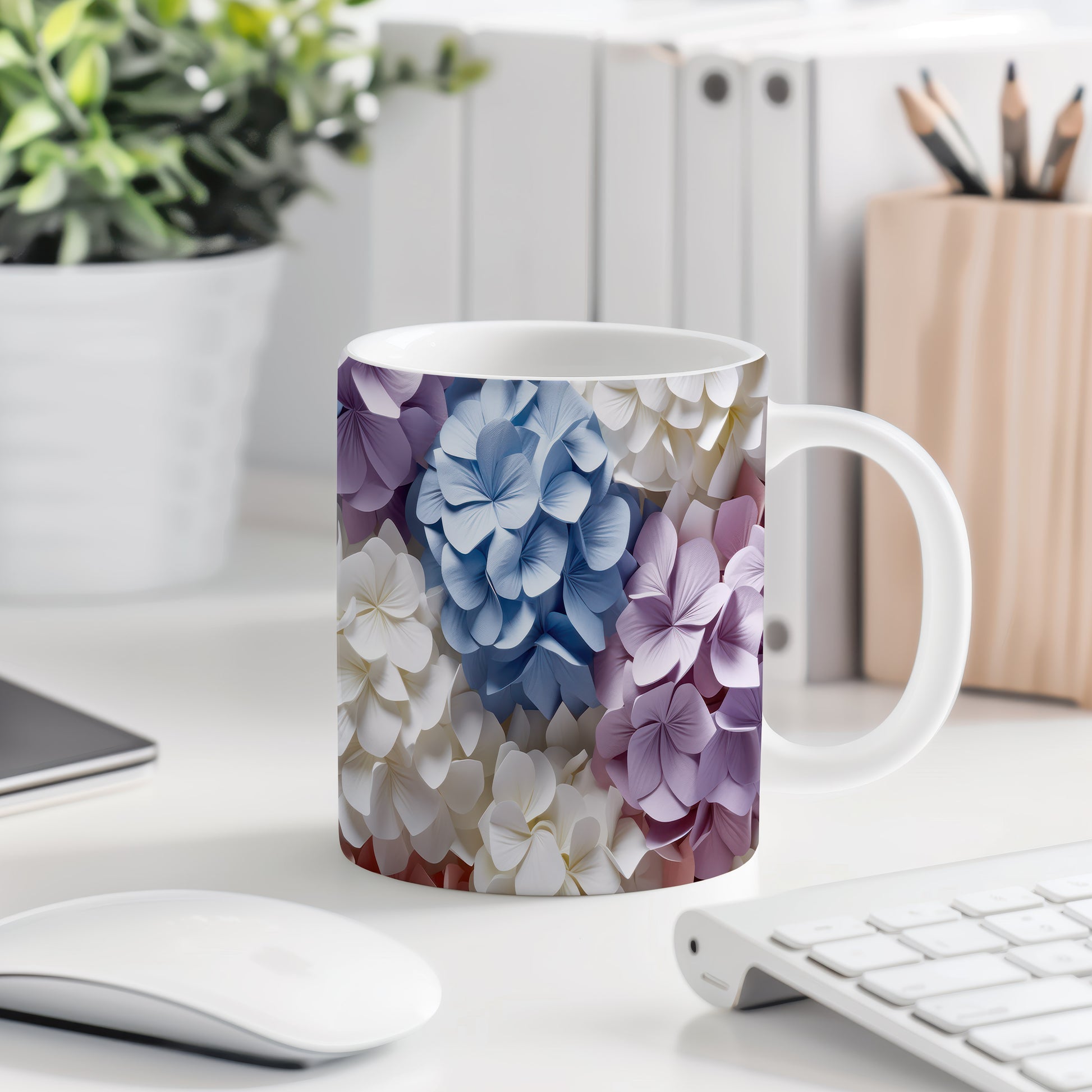 Elegantní hrnek s květinovým designem v modrých, fialových a bílých odstínech. Tento stylový kousek je ideální pro každodenní používání a skvělým dárkem pro milovníky přírody. Materiál: keramika. Objem: 330 ml. Vhodné do myčky i mikrovlnky. Díky svému designu přináší radost a oživí každé posezení.