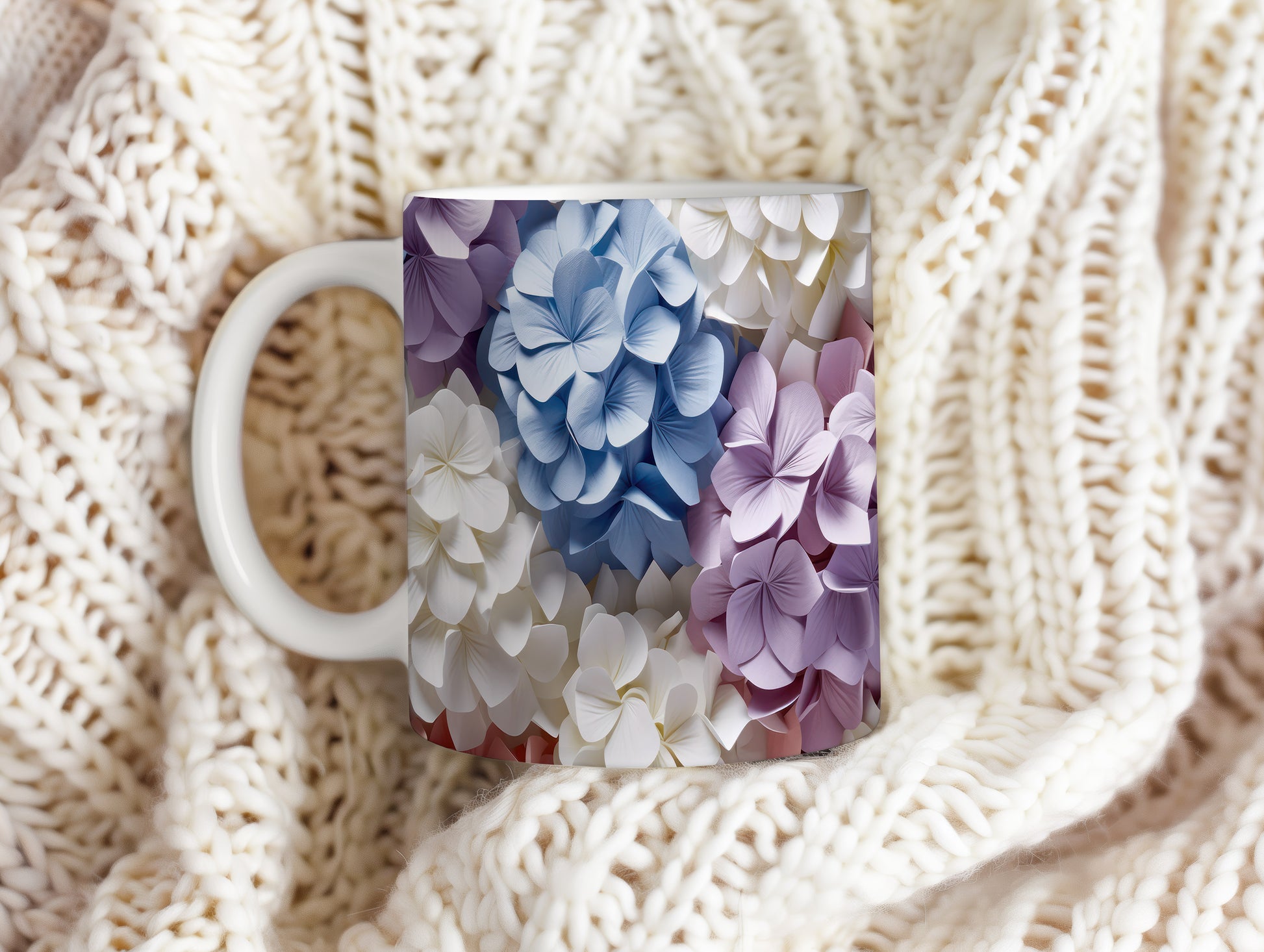 Hrnek s elegantním květinovým designem v modrých a fialových tónech