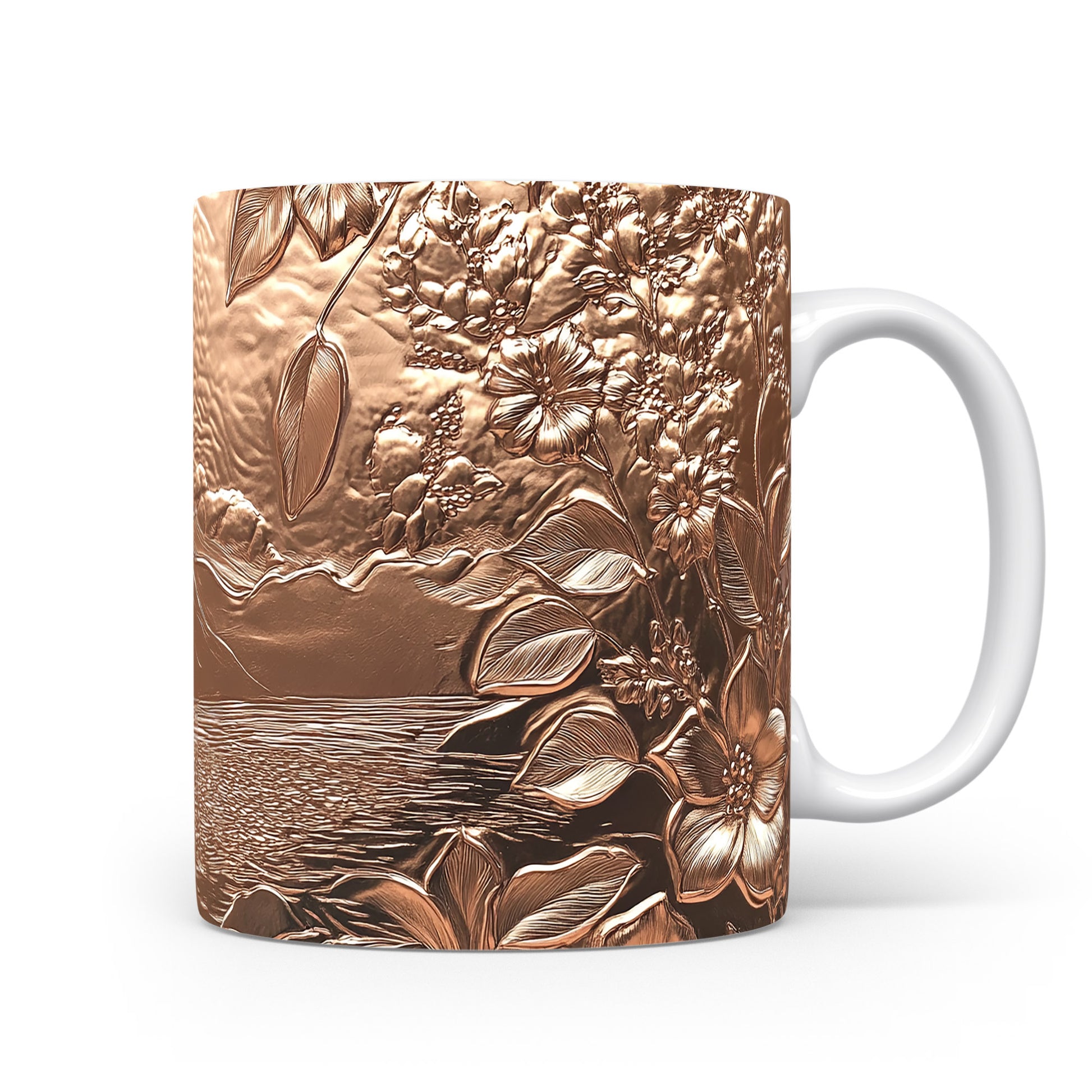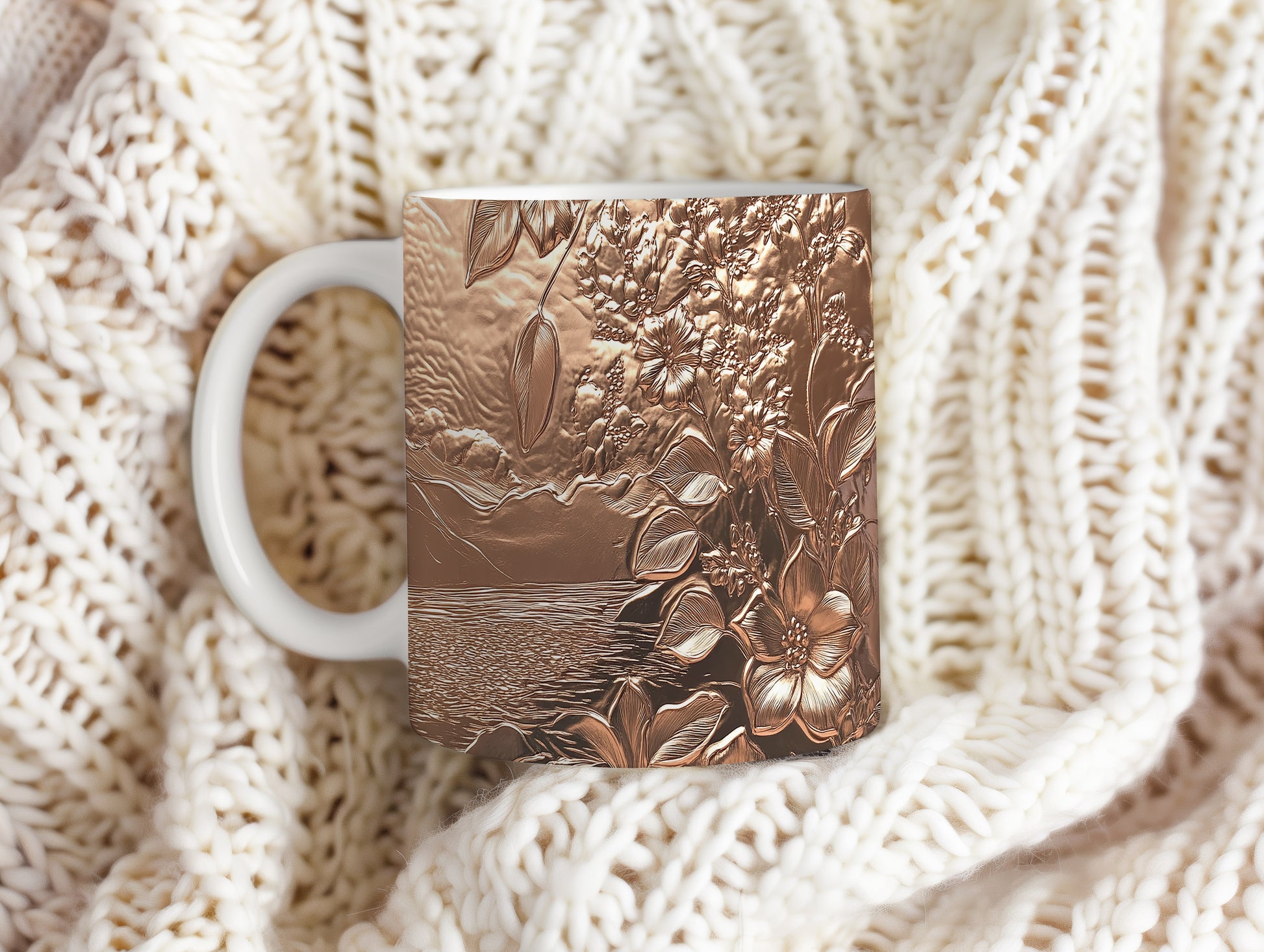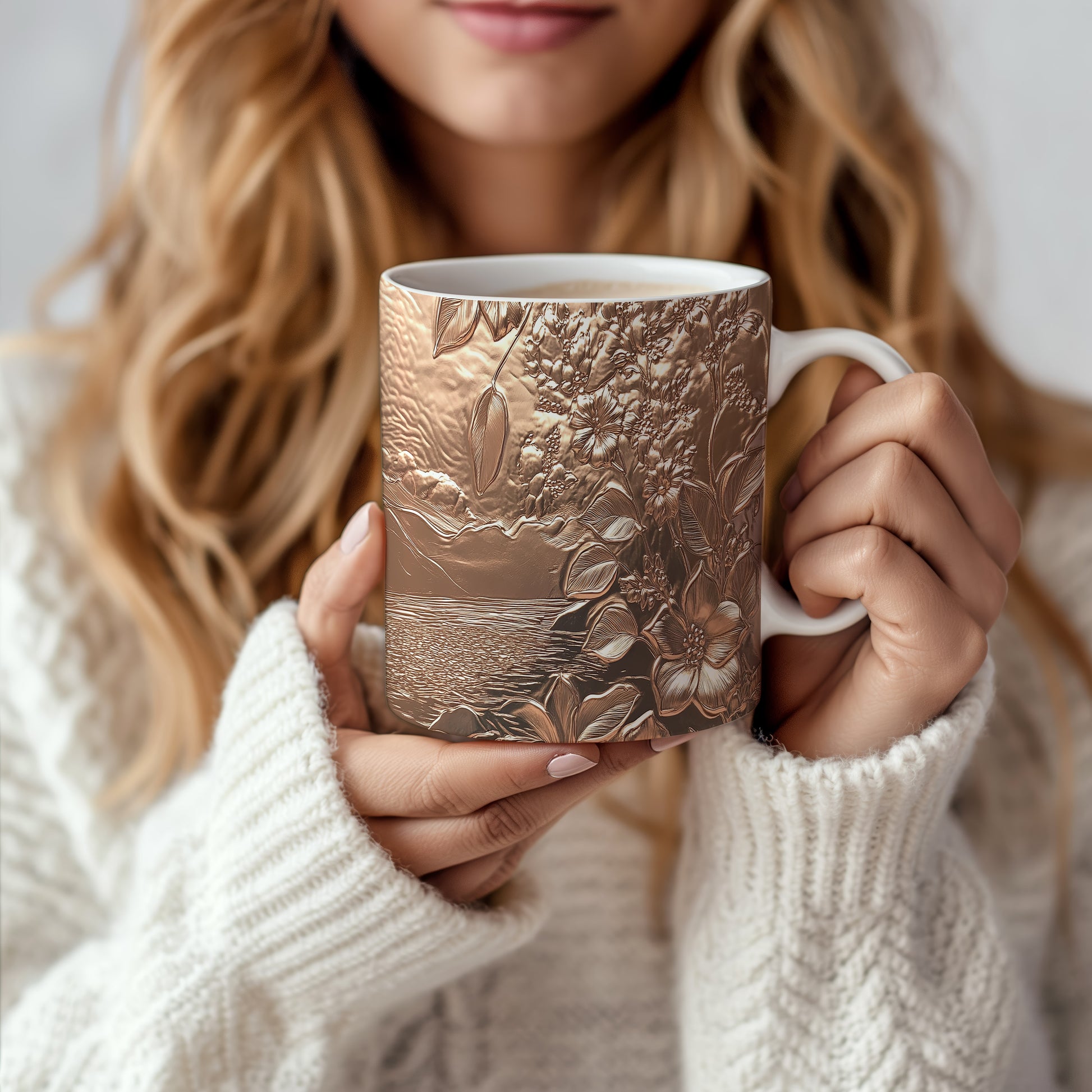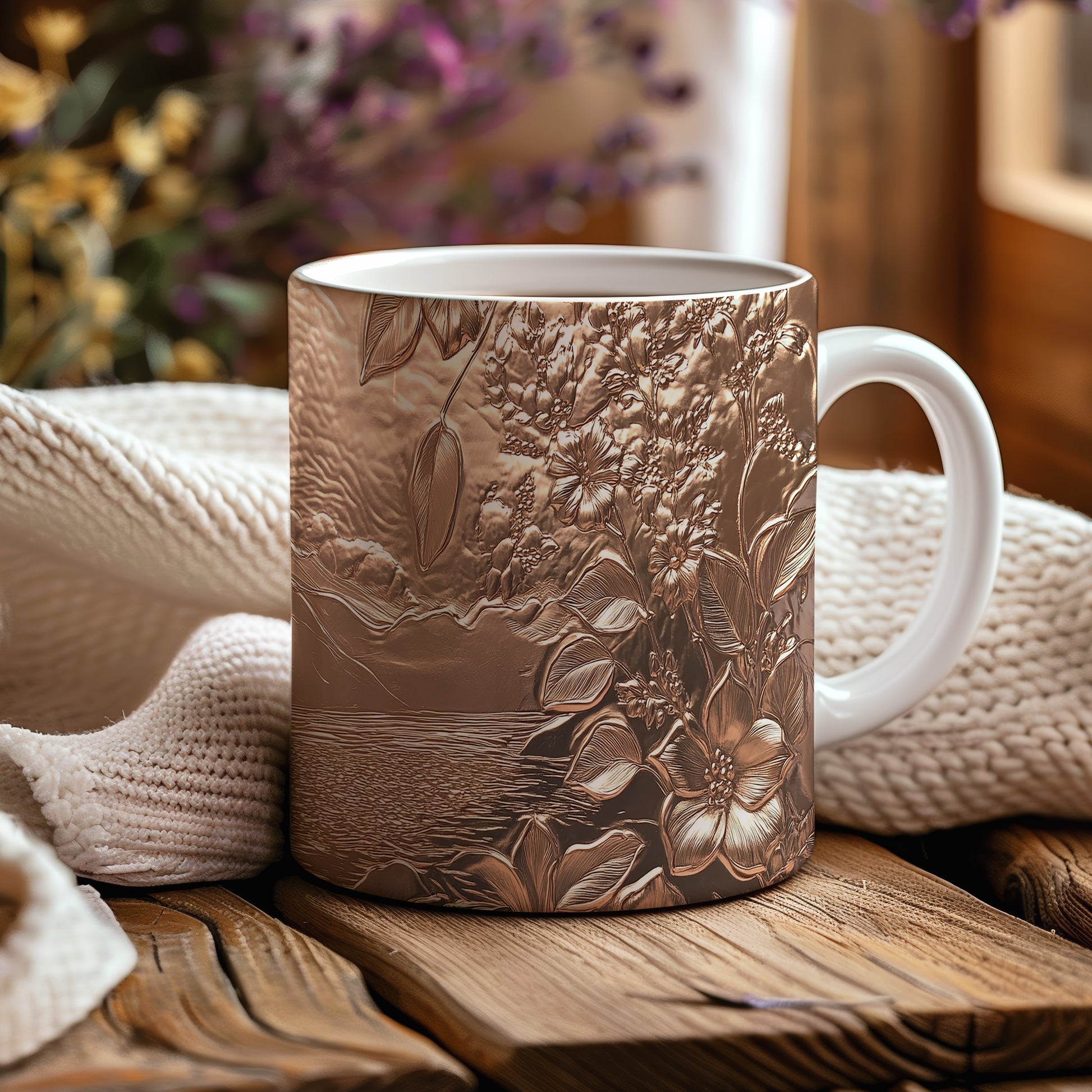 Hrnek s elegantním květinovým motivem v hnědých tónech