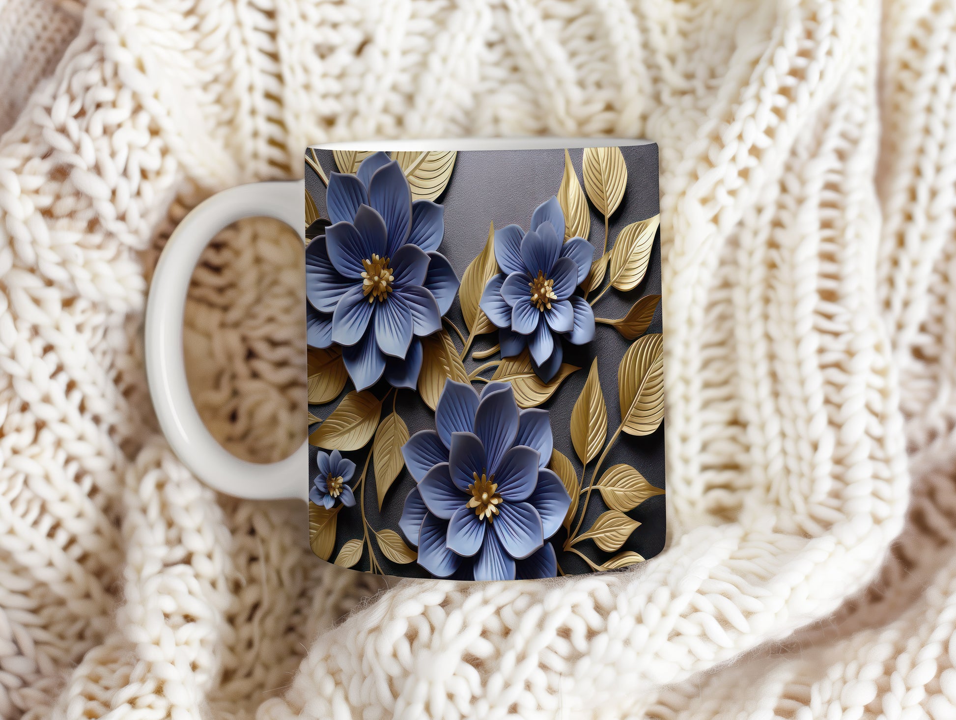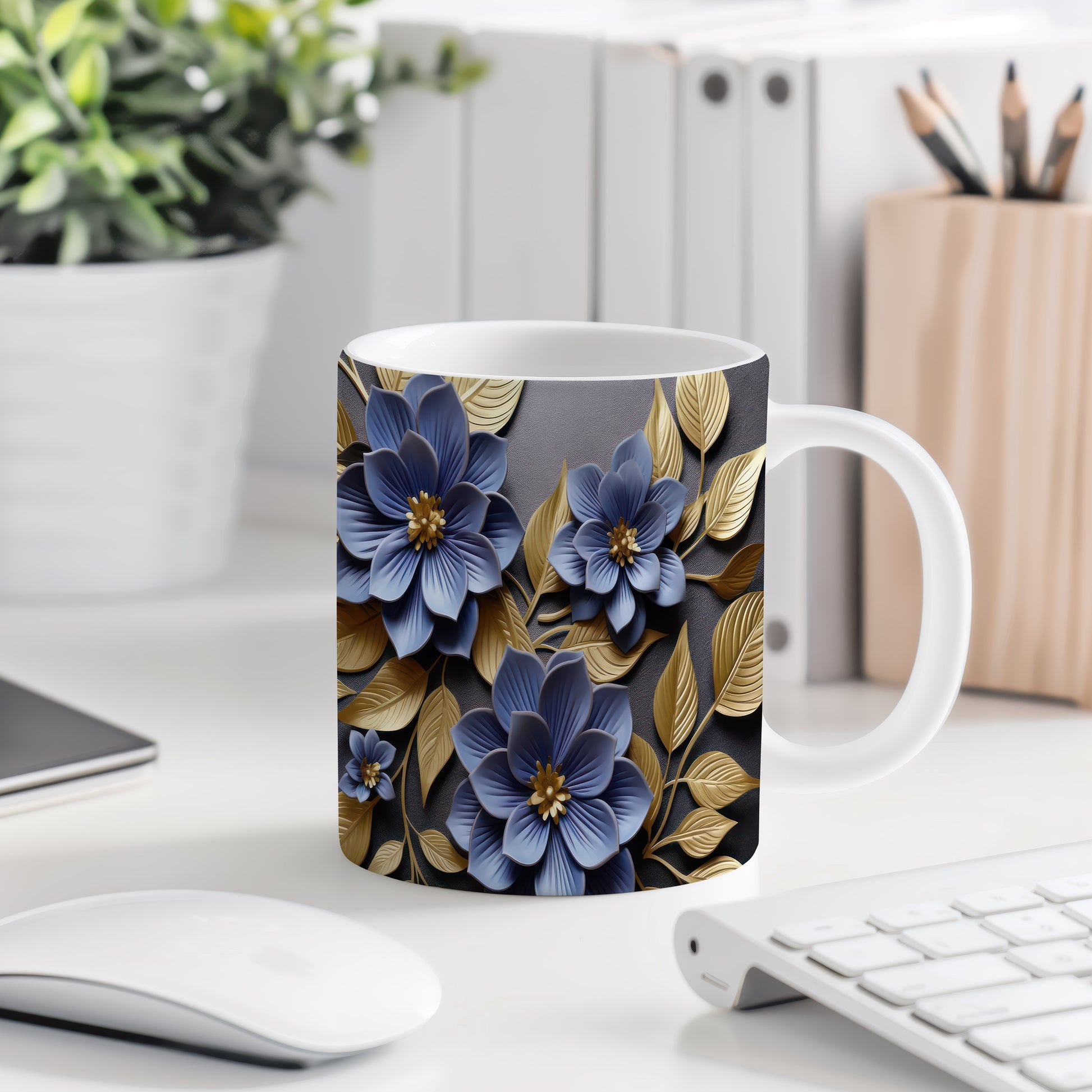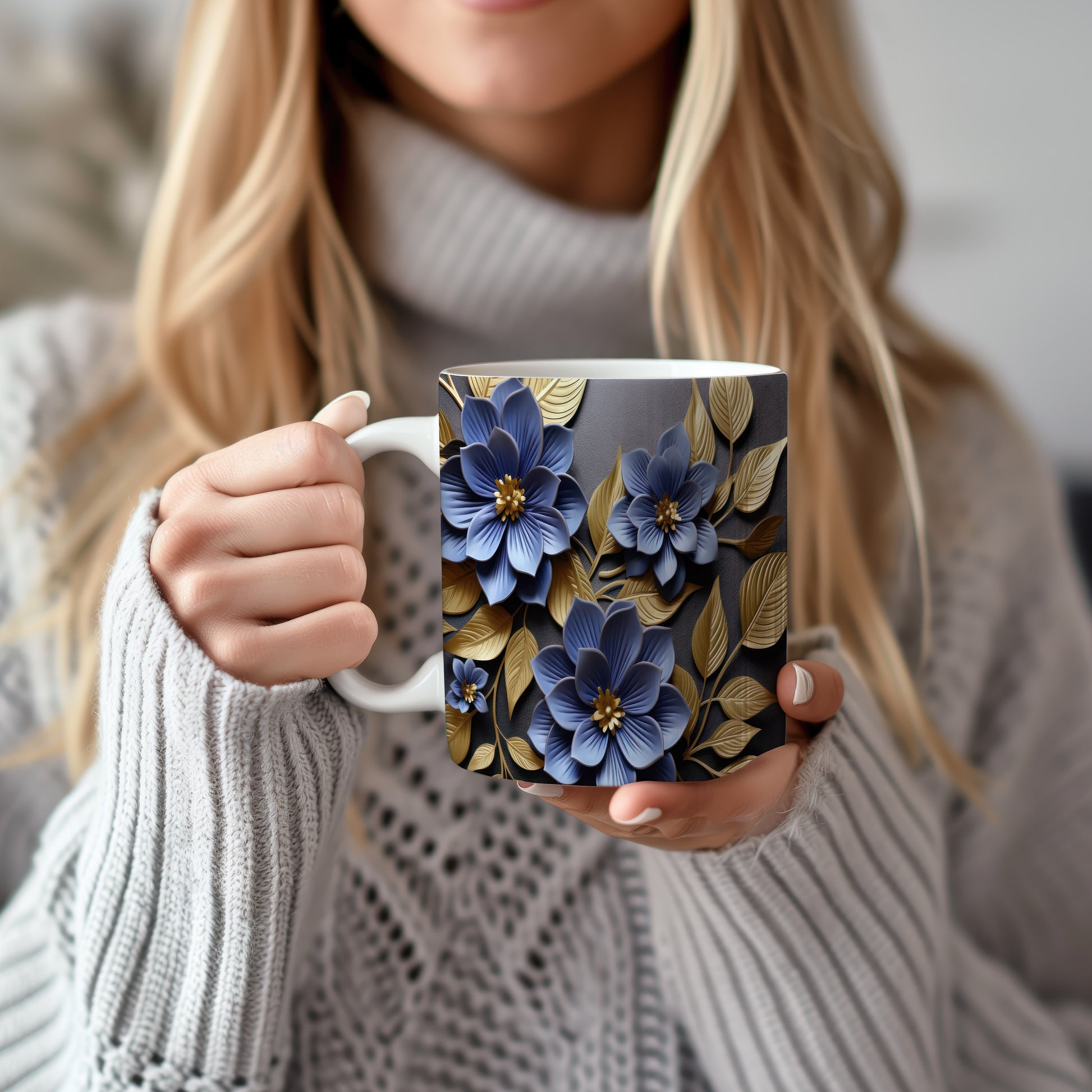 Hrnek s elegantním květinovým motivem v modro – zlatých tónech