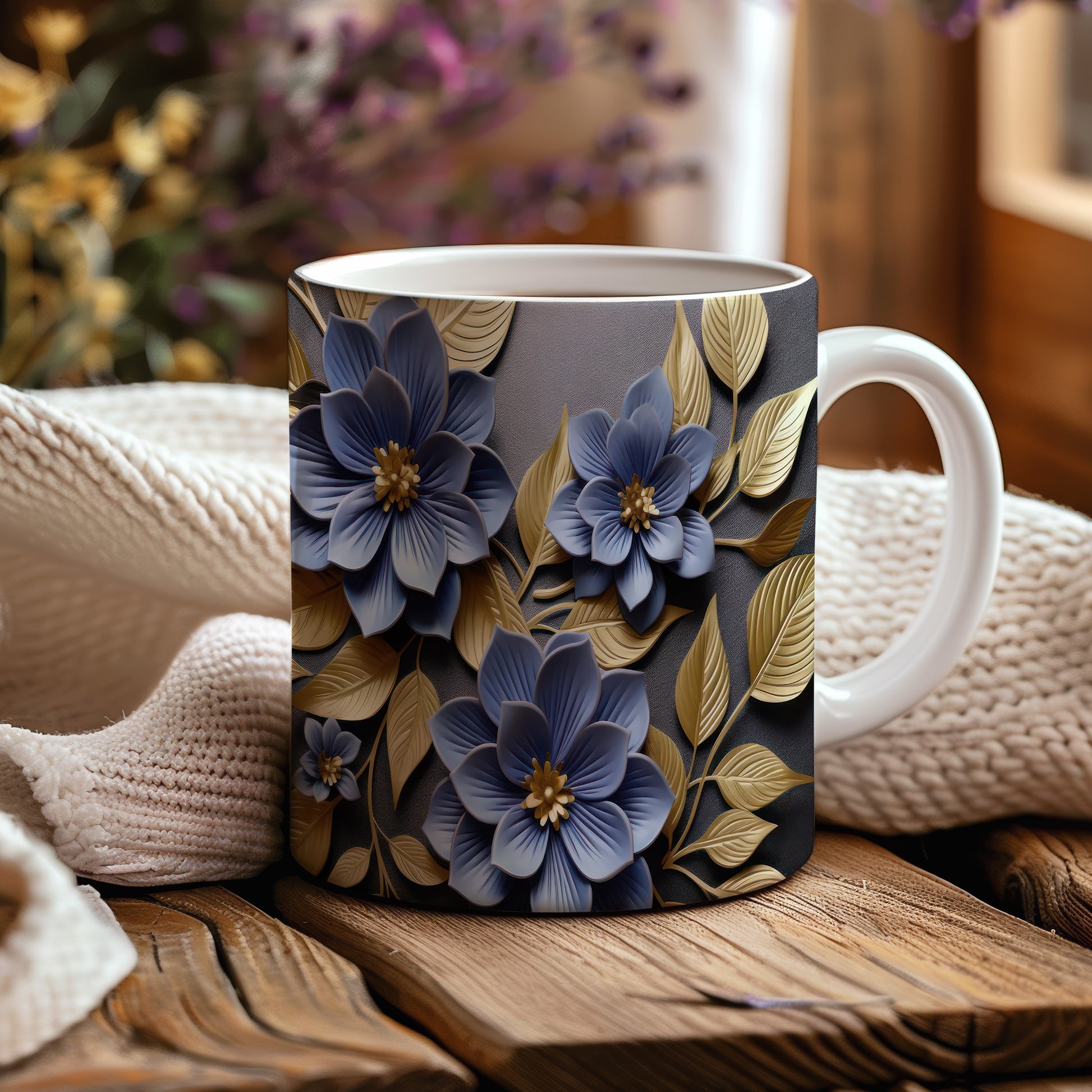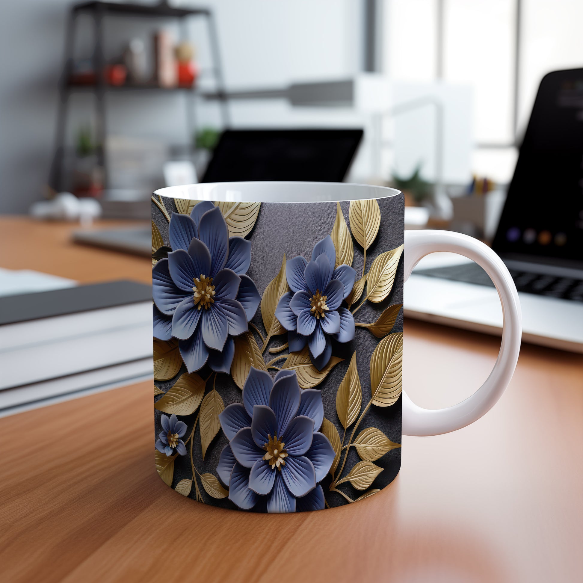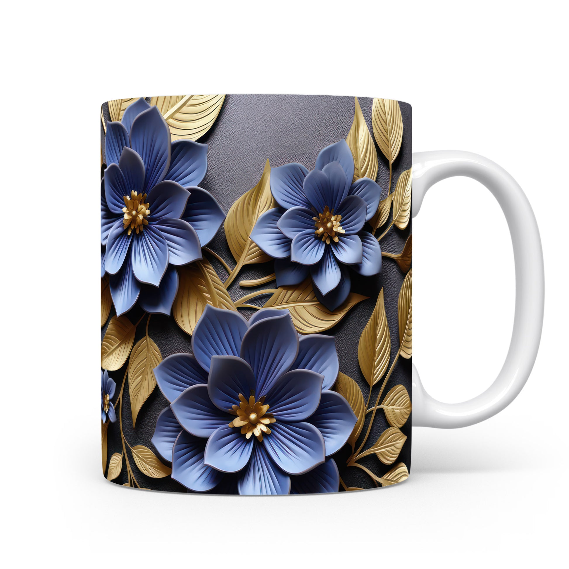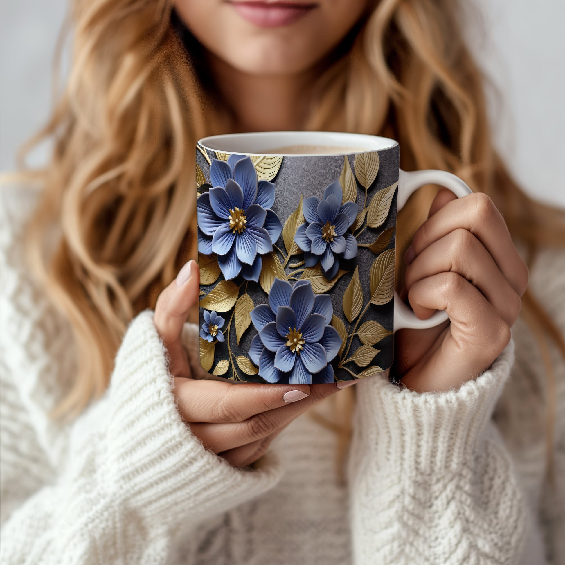 Hrnek s elegantním květinovým motivem v modro – zlatých tónech