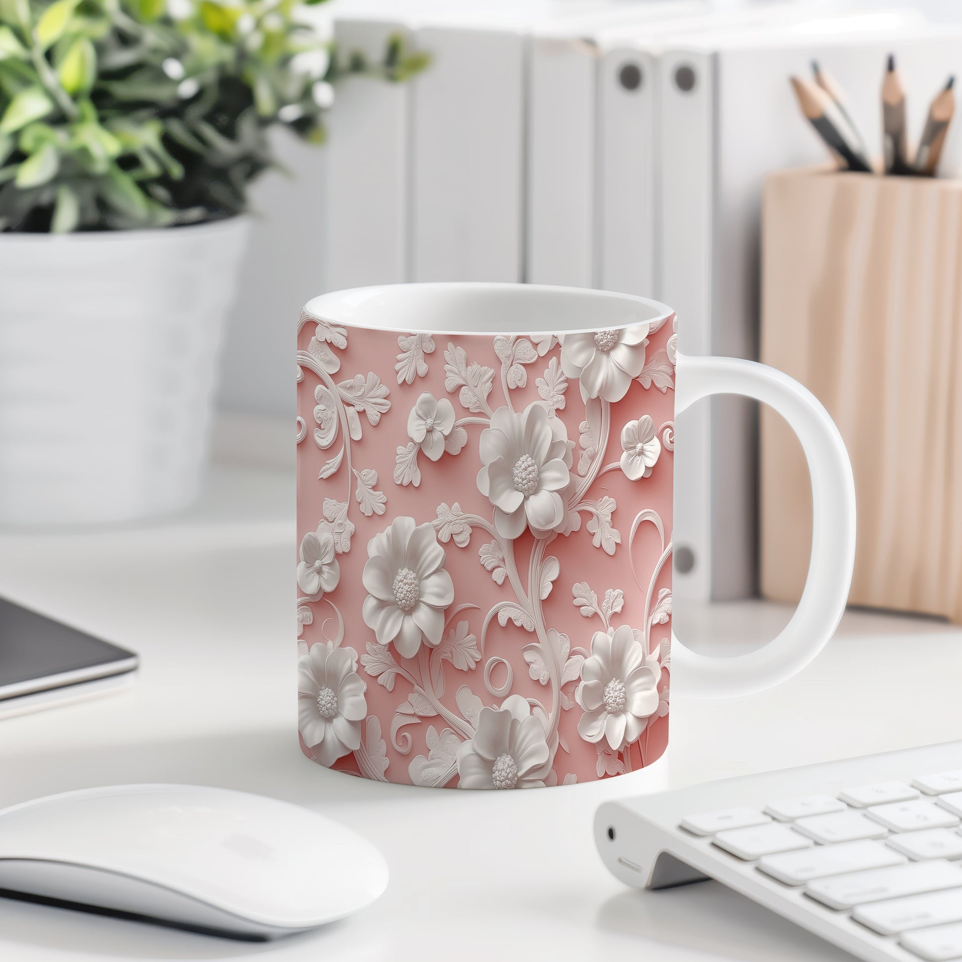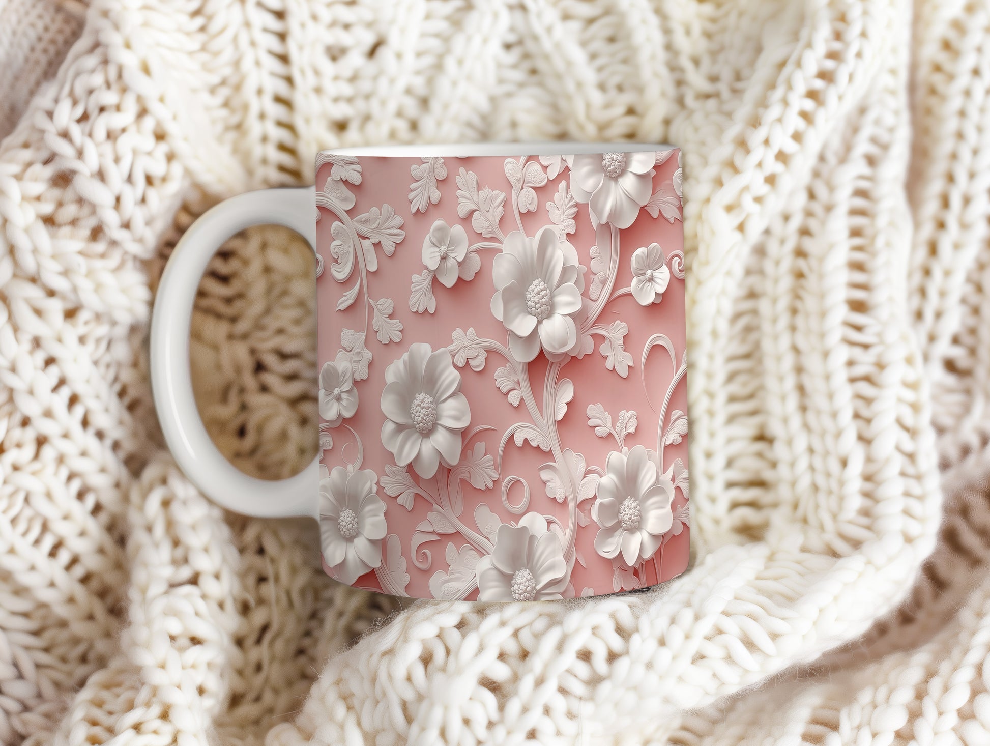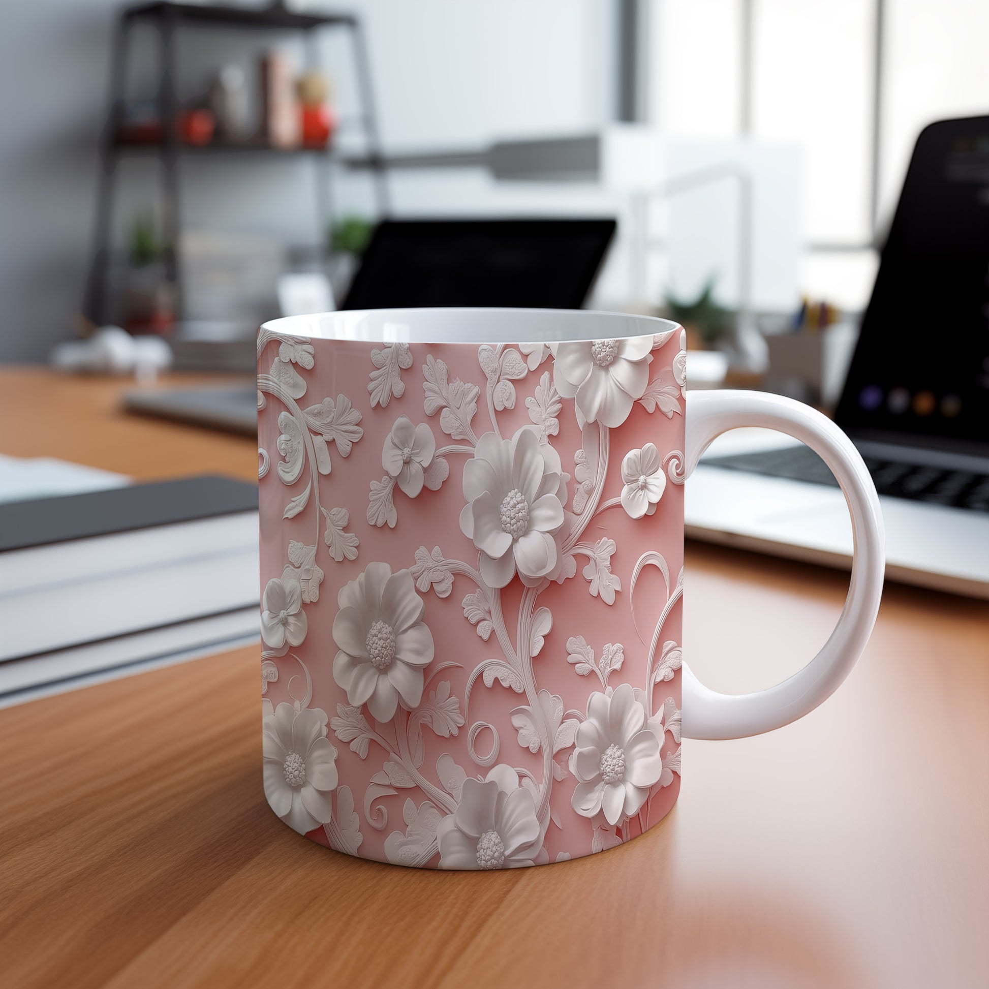 Hrnek s elegantním květinovým vzorem na růžovém pozadí
