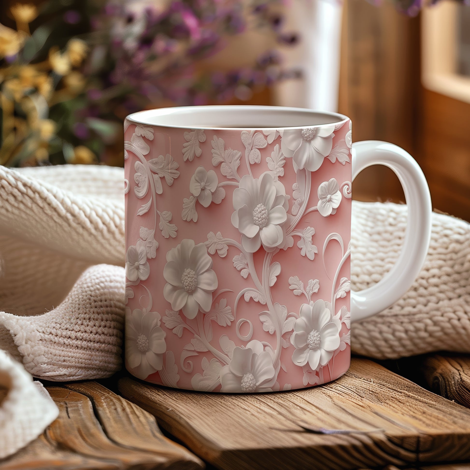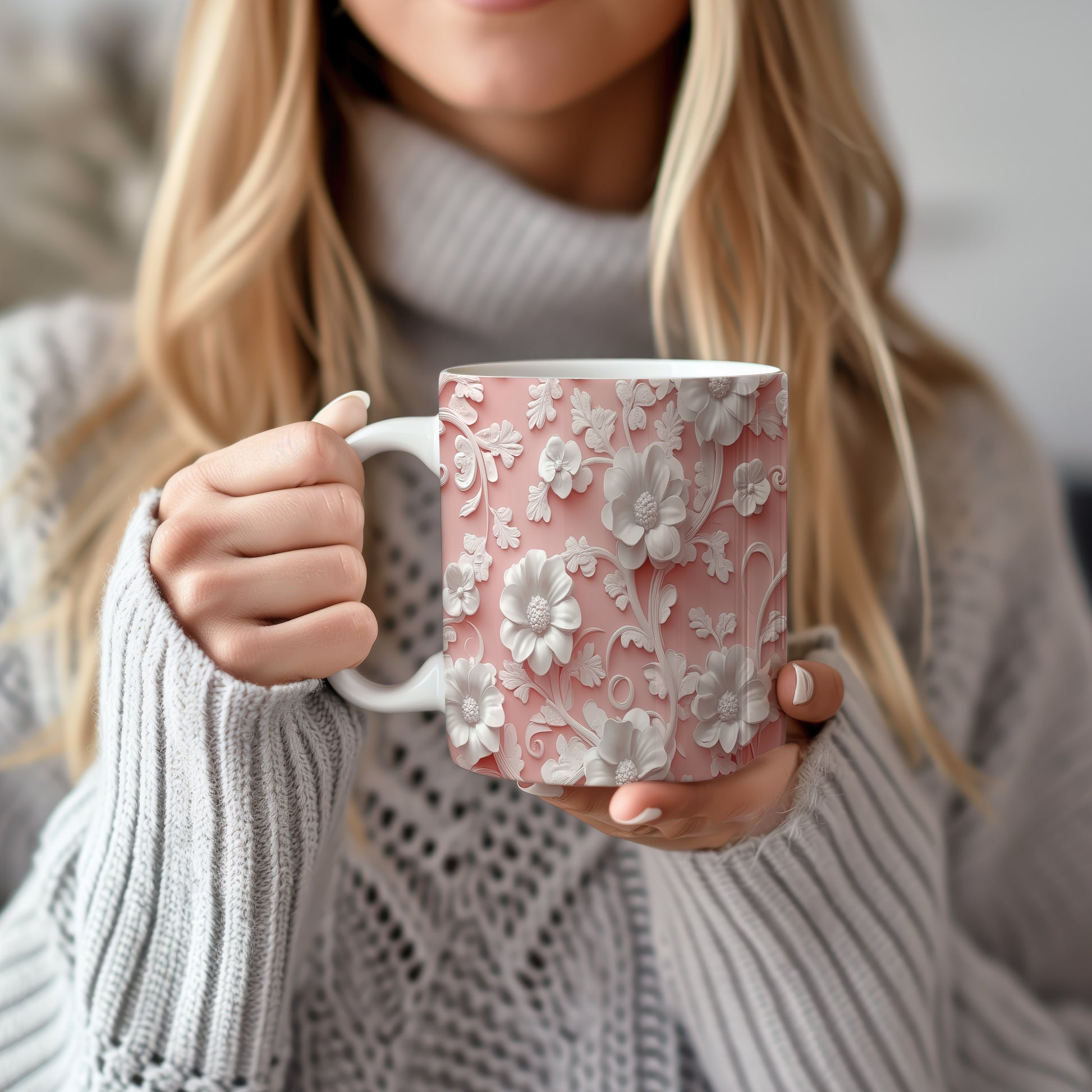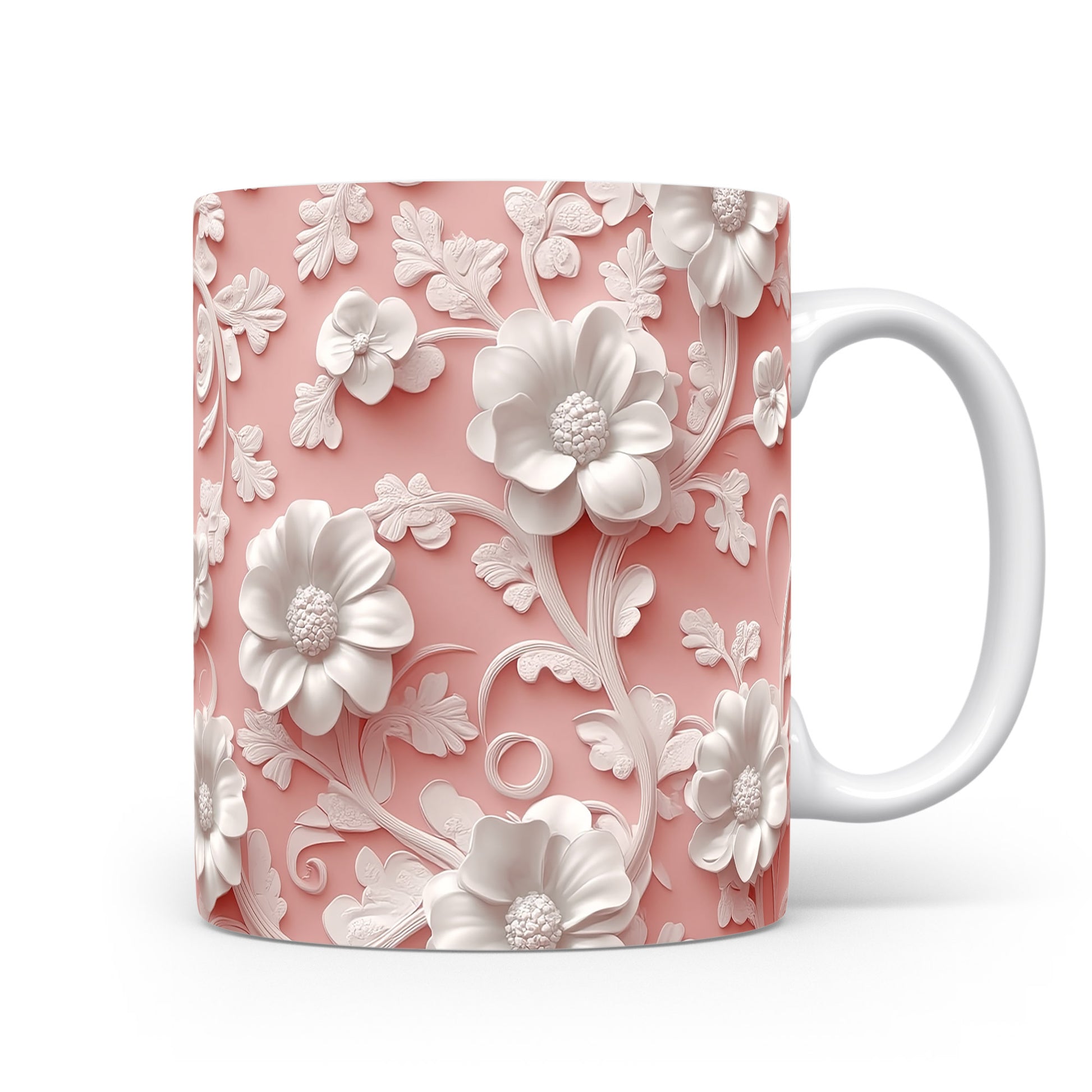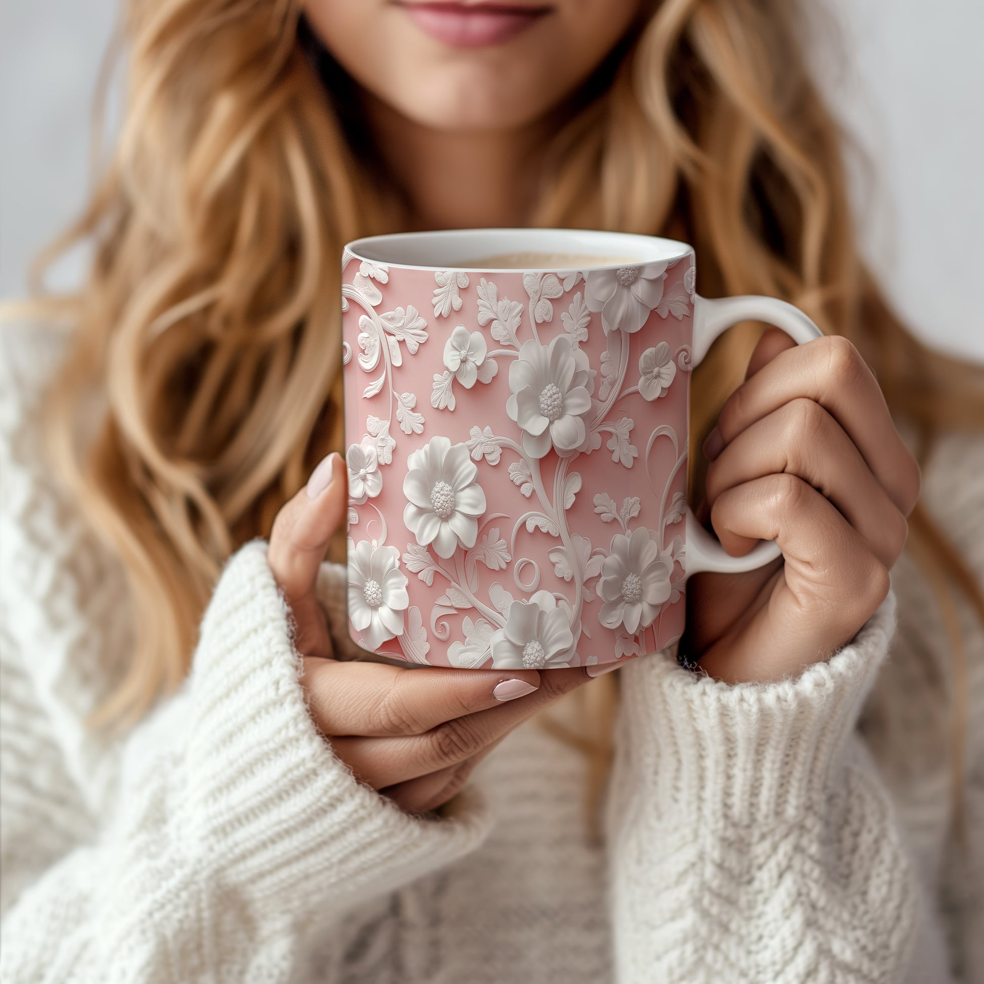 Hrnek s elegantním květinovým vzorem na růžovém pozadí