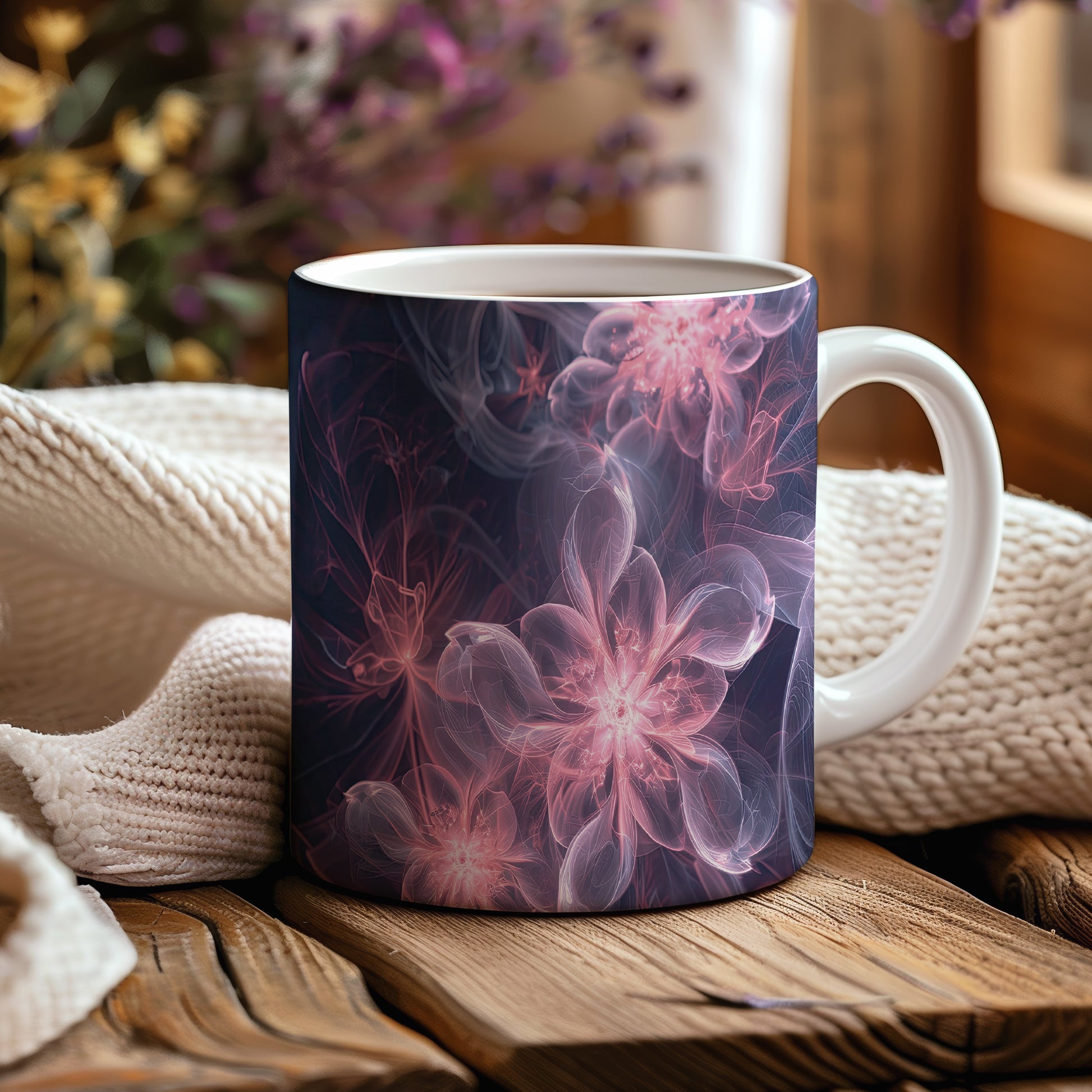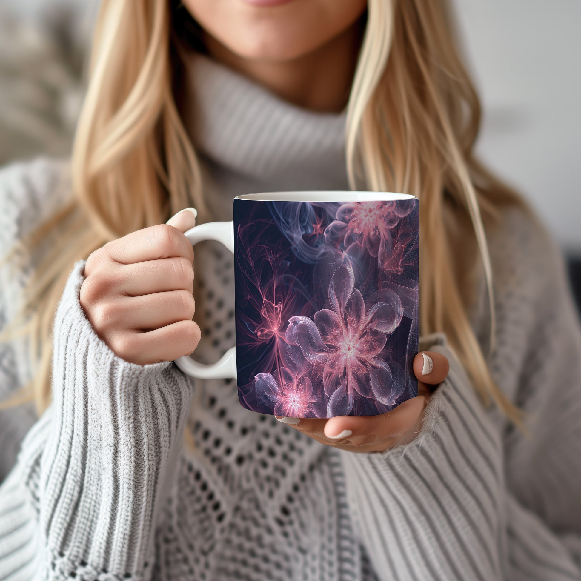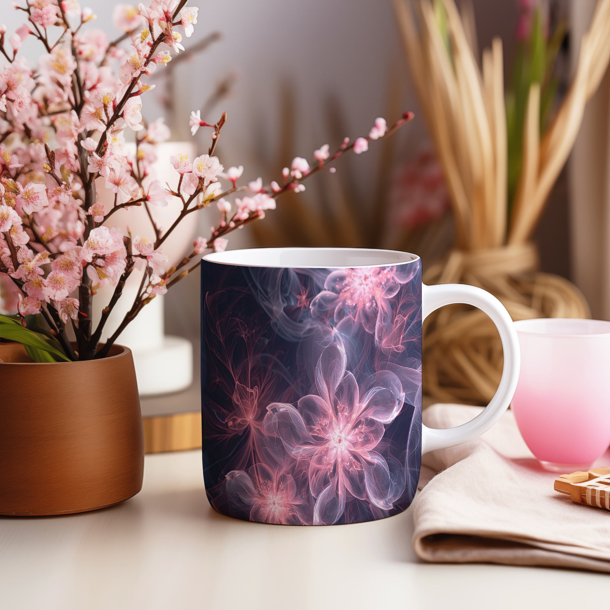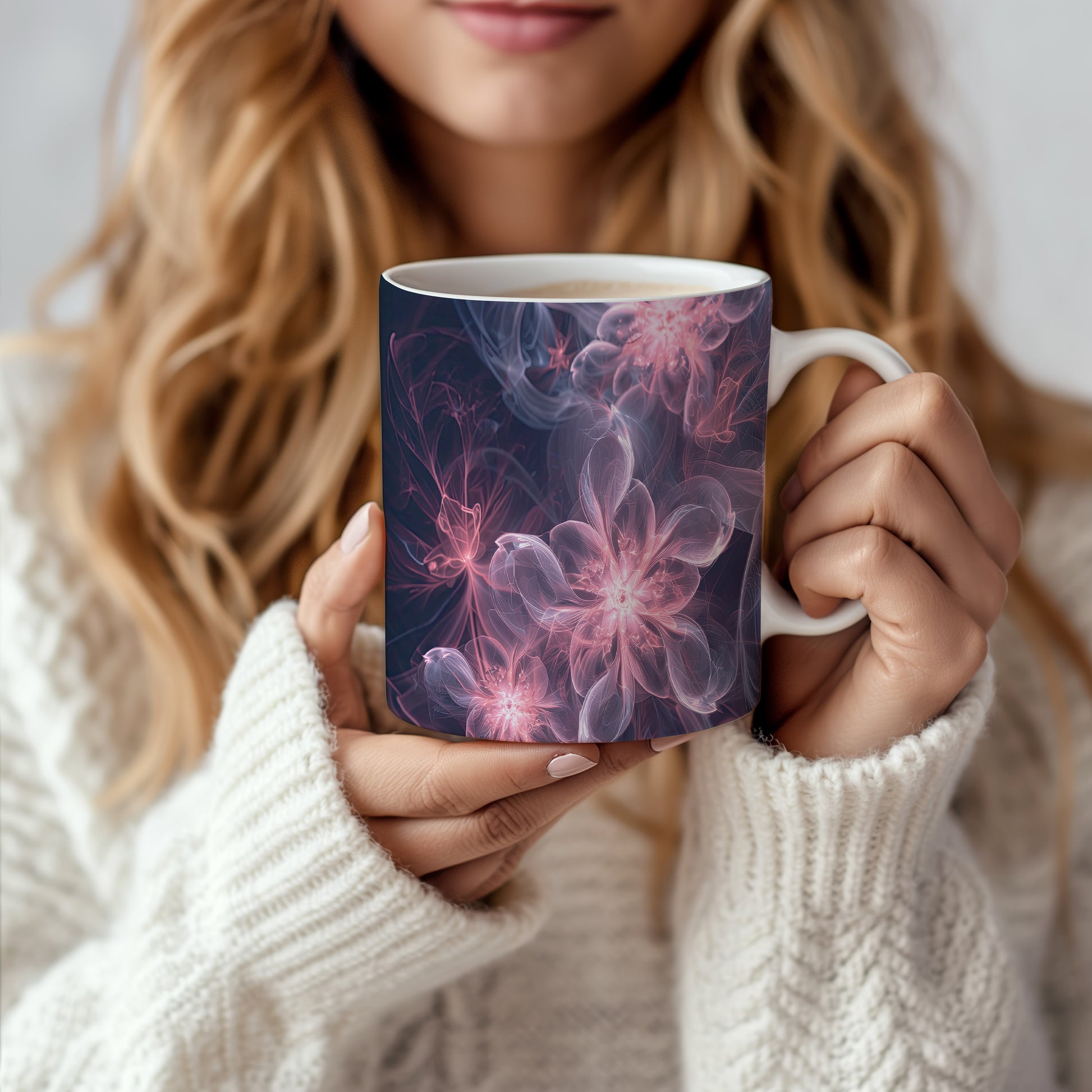 Hrnek s elegantním květinovým vzorem v růžových a fialových tónech
