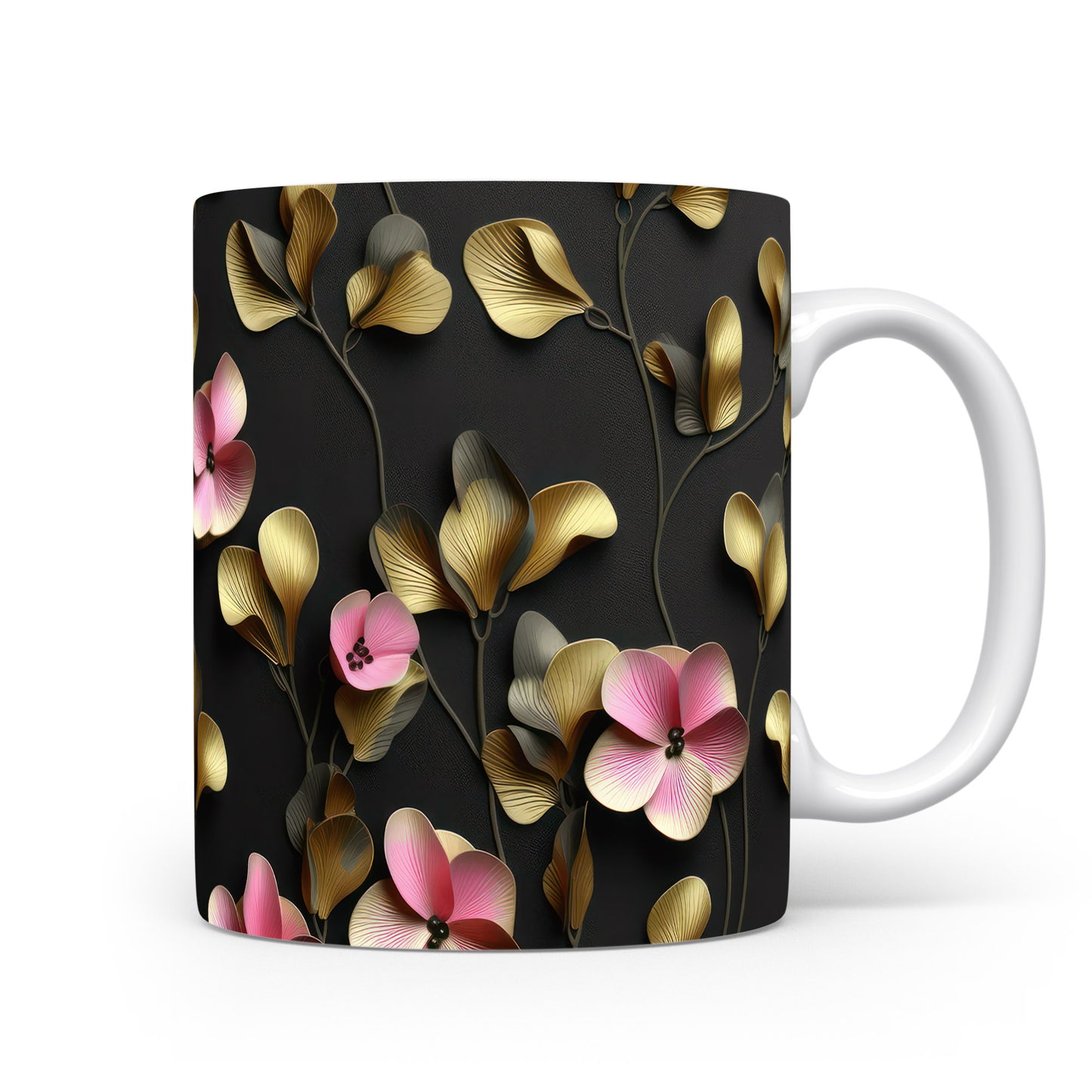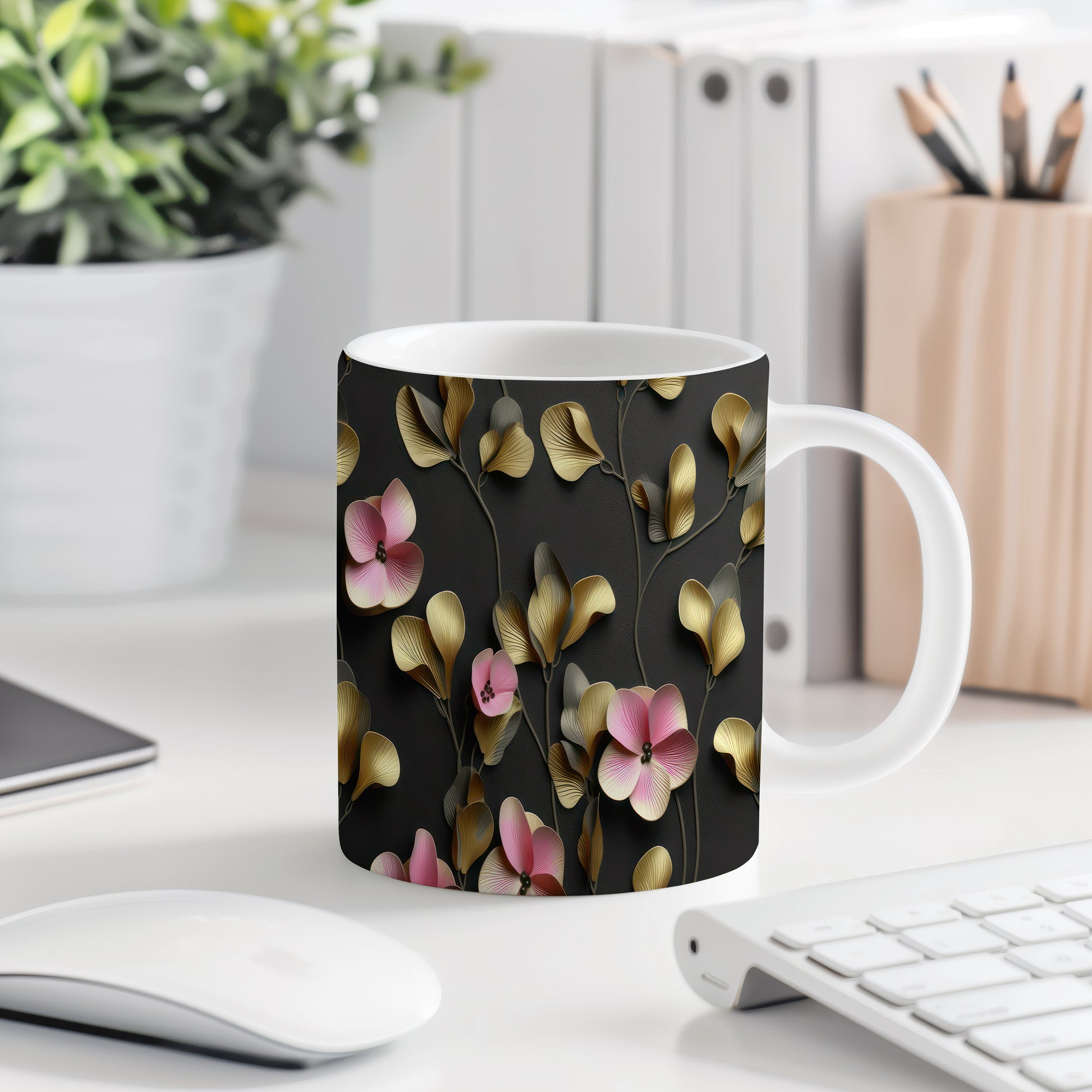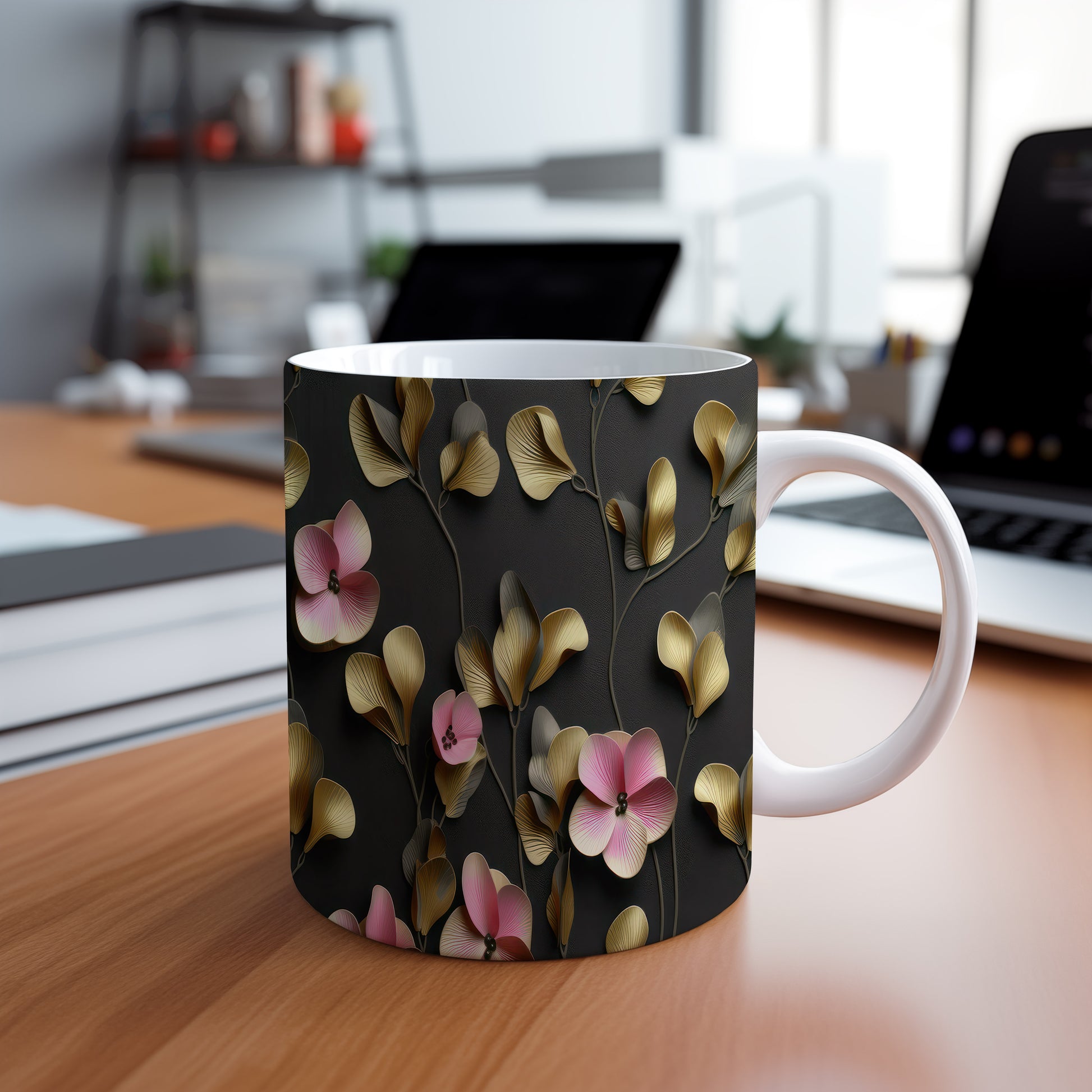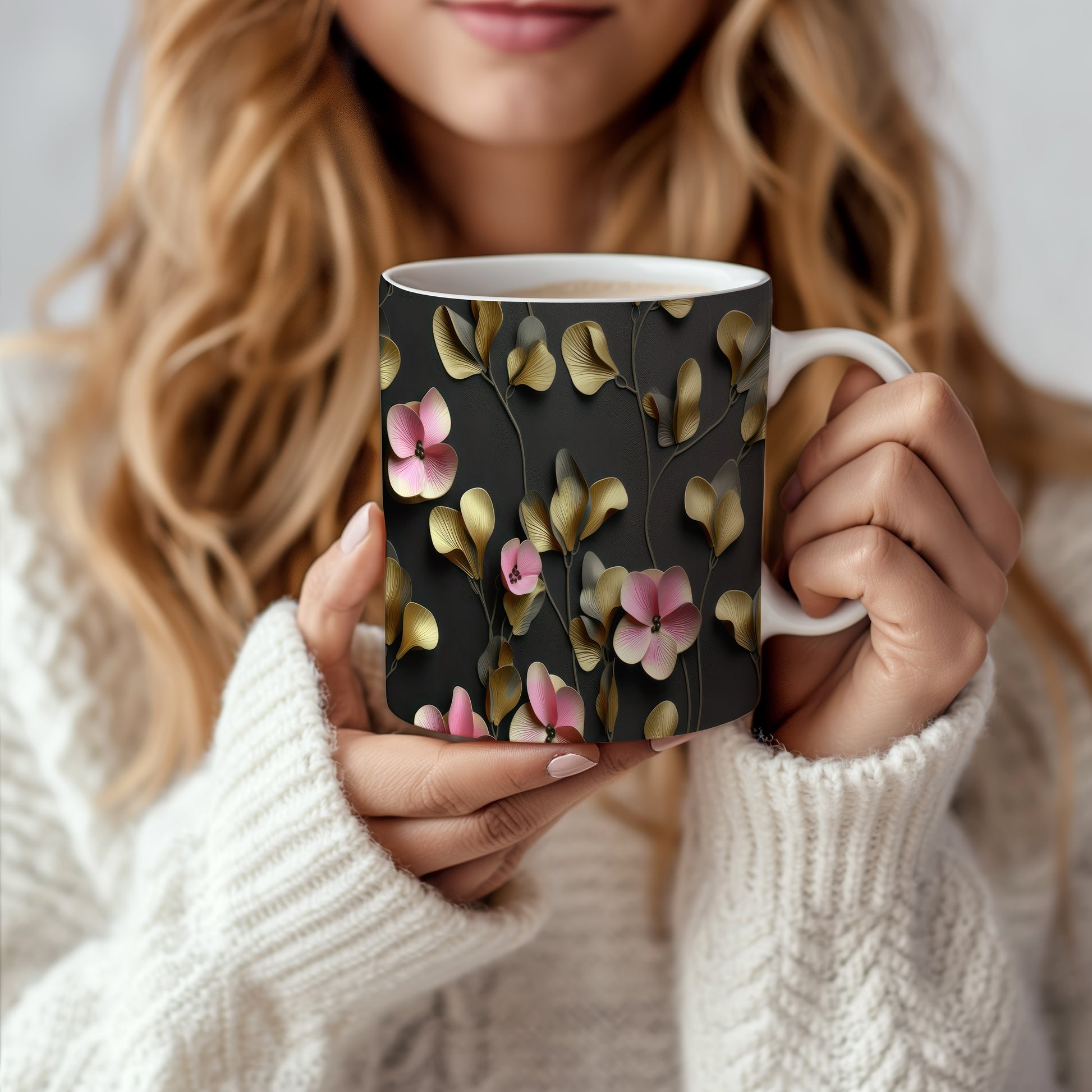 Tento keramický hrnek s jemným květinovým vzorem v růžových a zlatých tónech je skvělým doplňkem pro každého milovníka elegance. Je ideální jako dárek pro přátele nebo rodinu, kteří ocení stylové nádobí. Materiál: keramika. Objem: 330 ml. Vhodné do myčky i mikrovlnky. Díky svému designu přináší do každodenního pití kávy nebo čaje nádech luxusu.