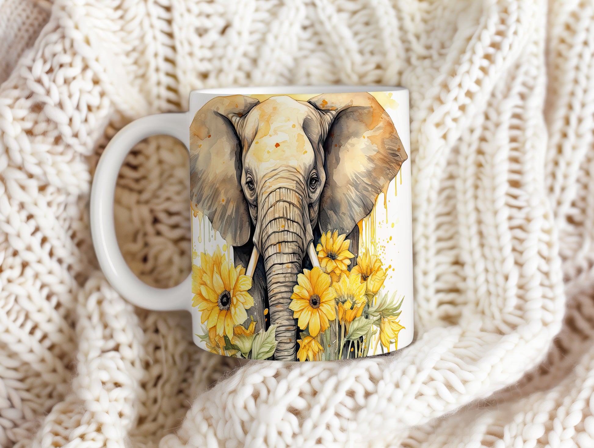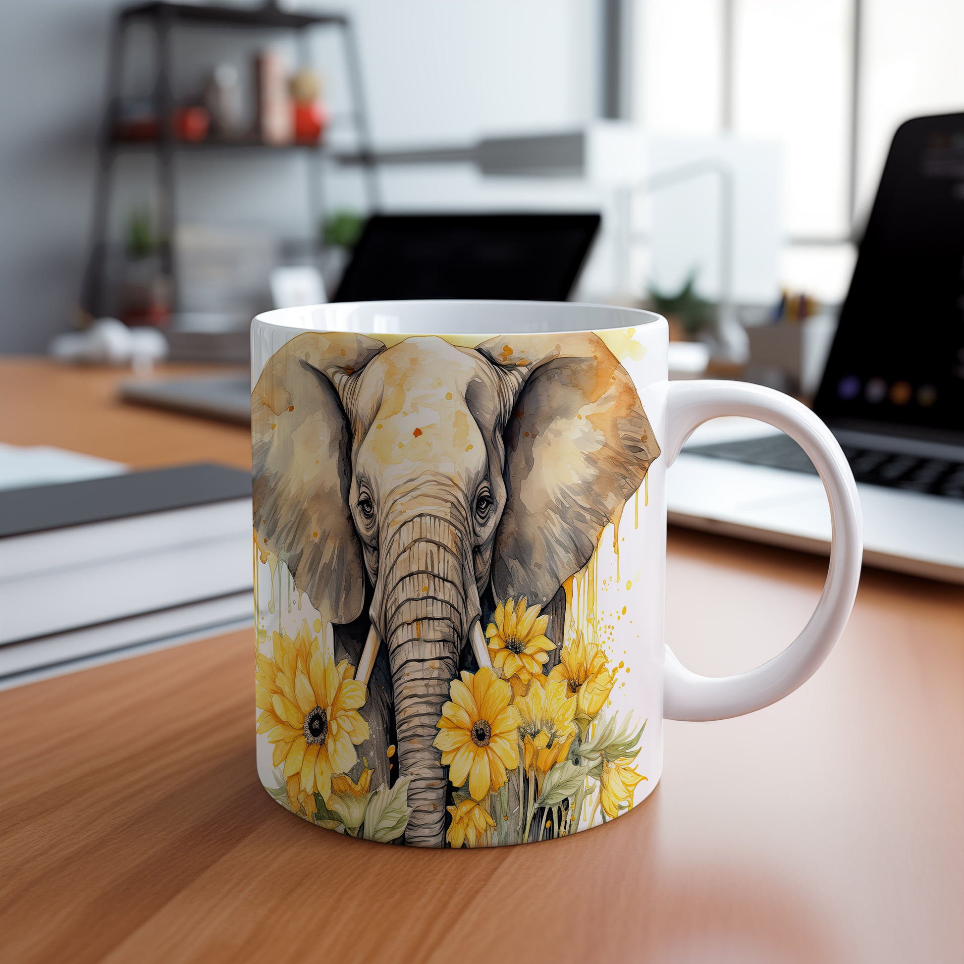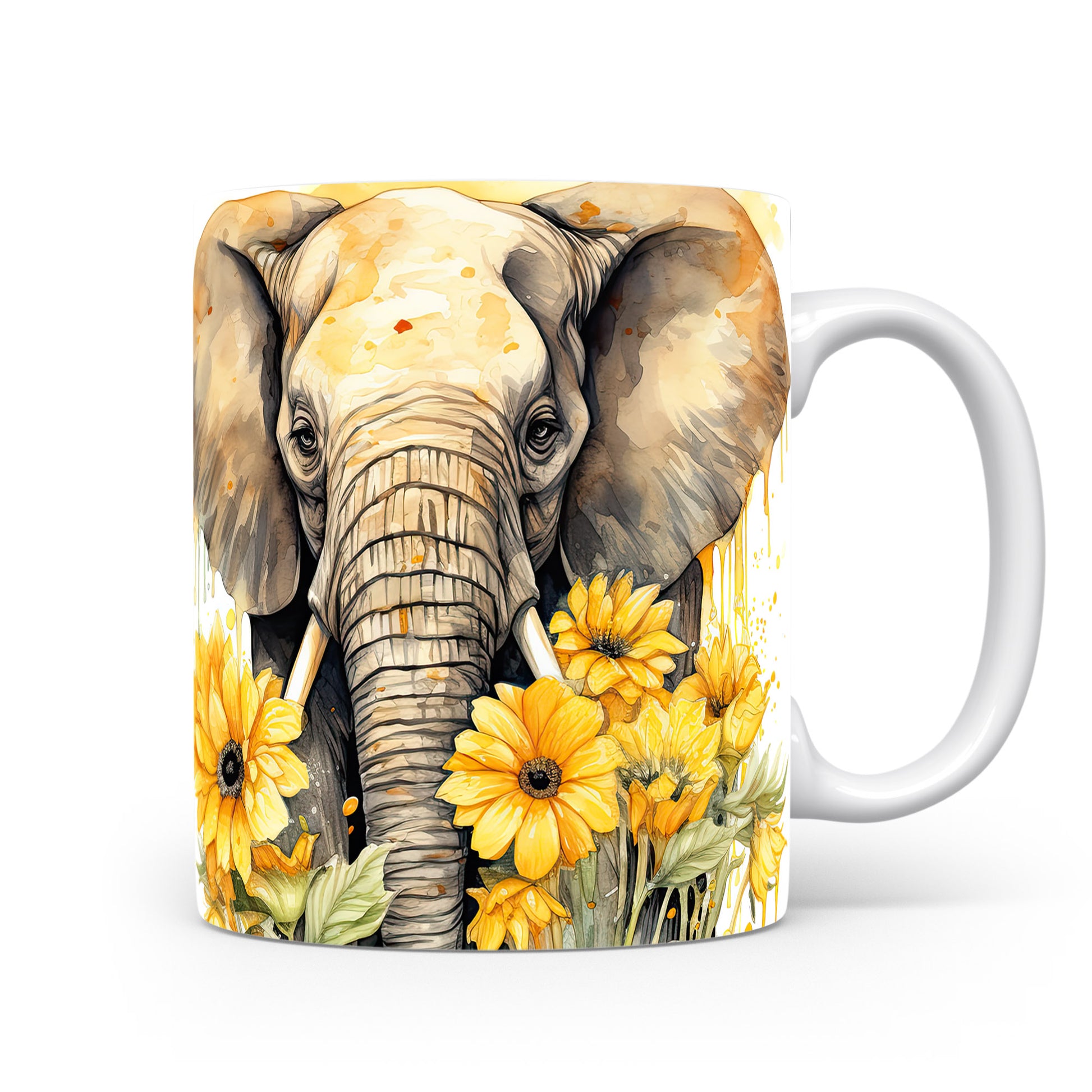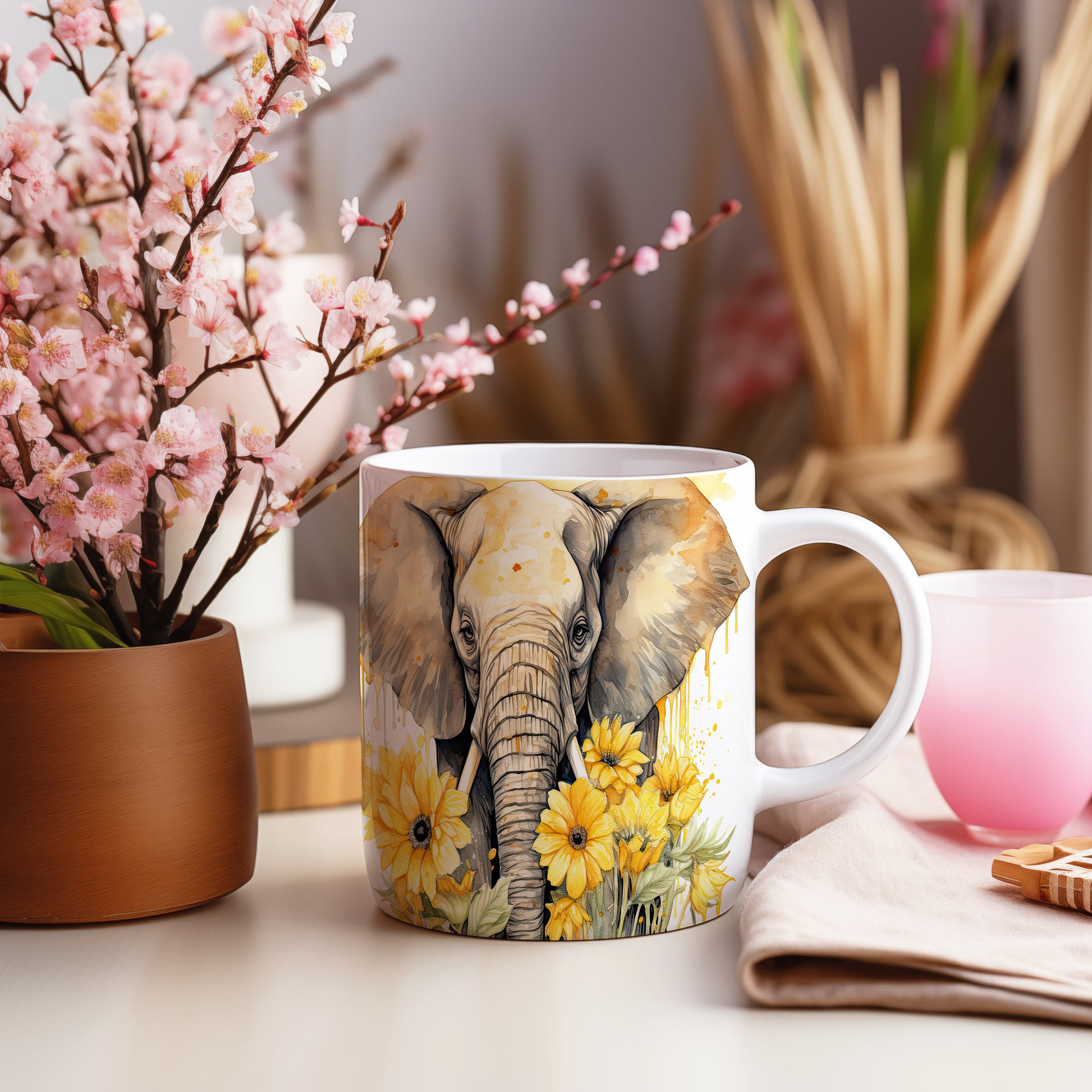 Hrnek s elegantním slonem a slunečnicemi