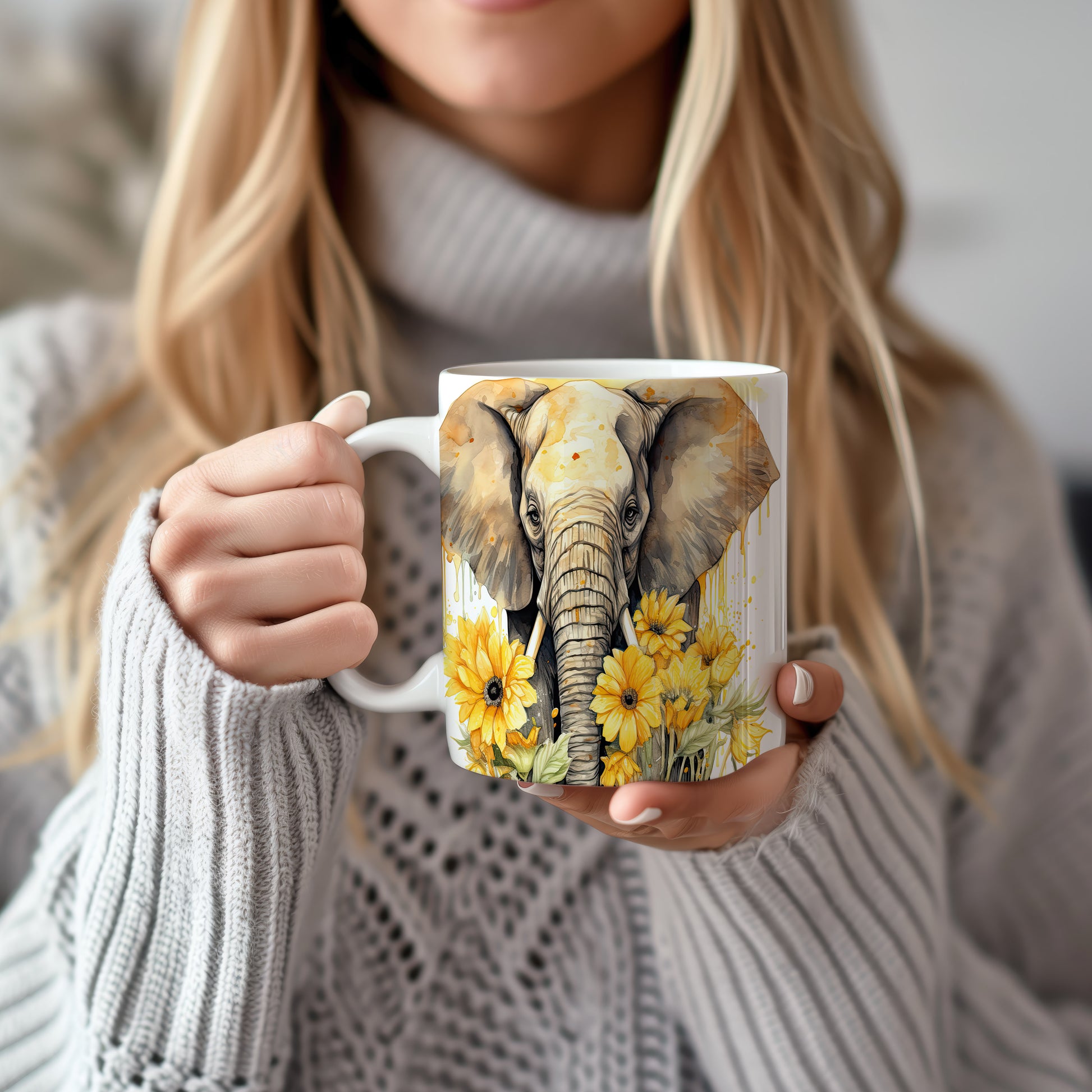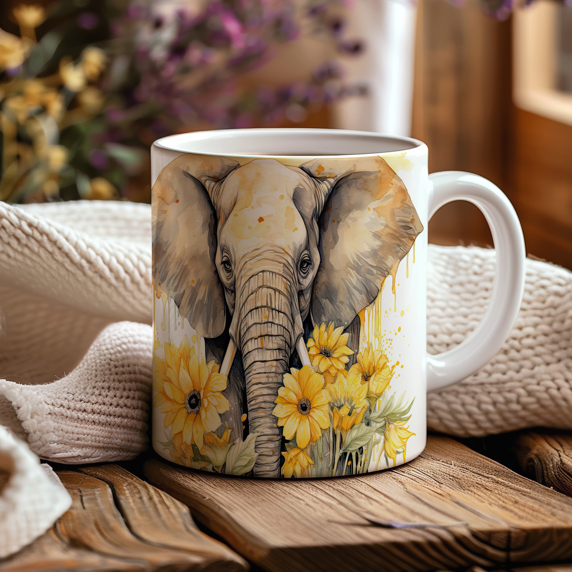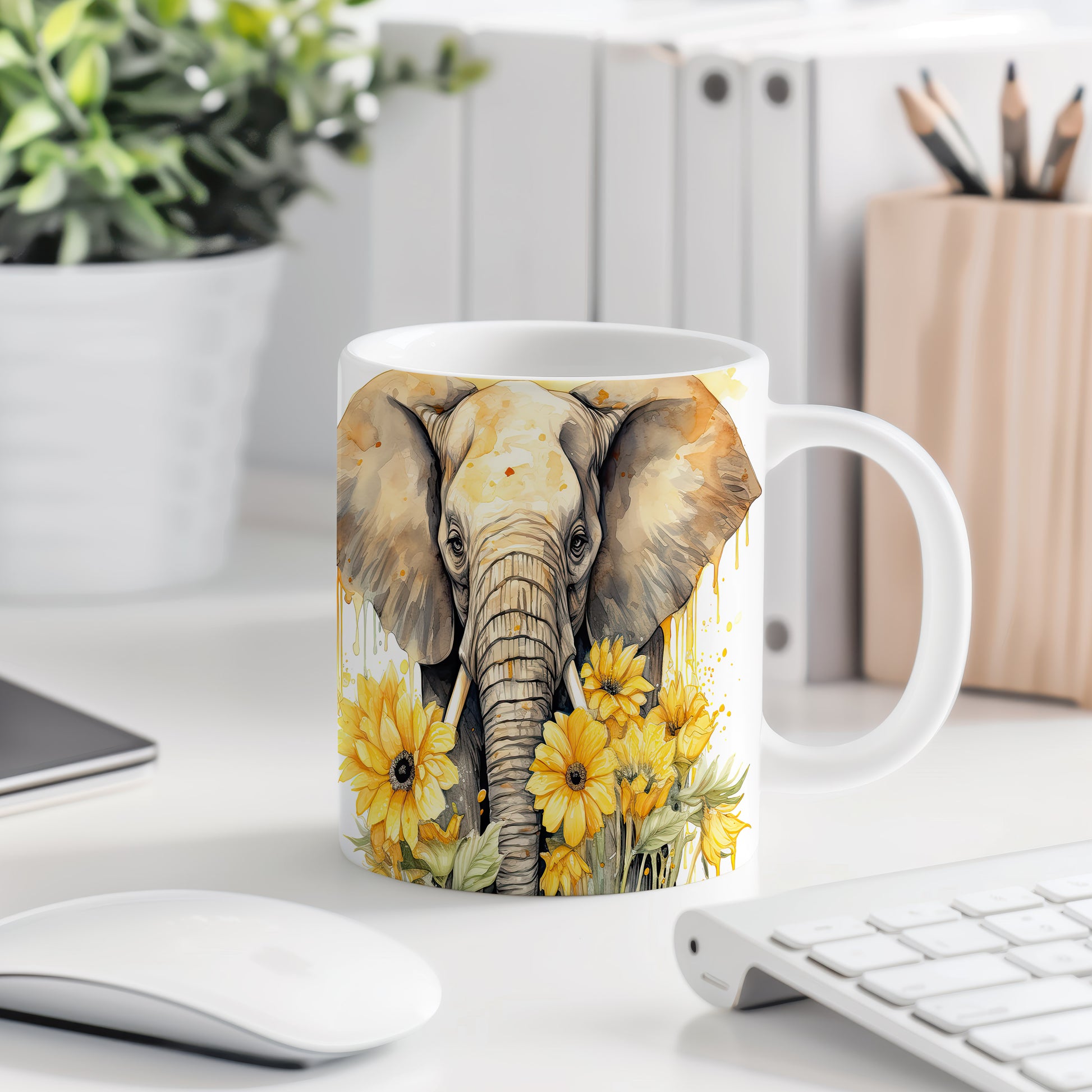 Tento keramický hrnek zobrazuje elegantního slona obklopeného slunečnicemi. Je ideální pro milovníky zvířat a přírody, skvělý tip na dárek pro přátele nebo rodinu. Materiál: keramika. Objem: 330 ml. Vhodné do myčky i mikrovlnky. Používáním tohoto hrnku si užijete každý doušek vašeho oblíbeného nápoje.
