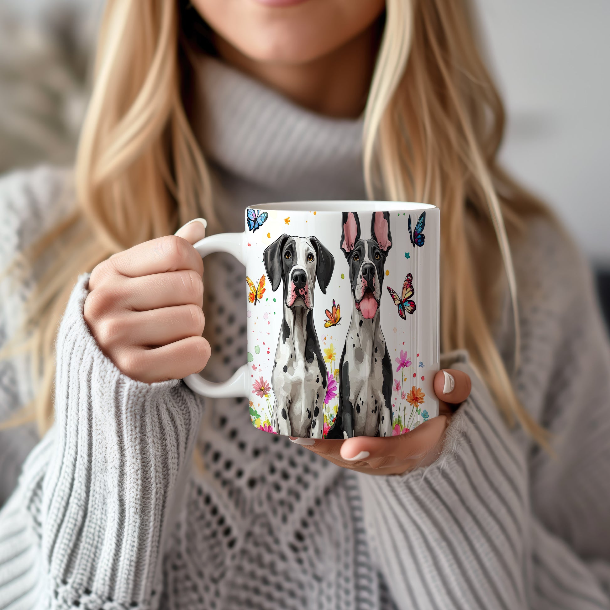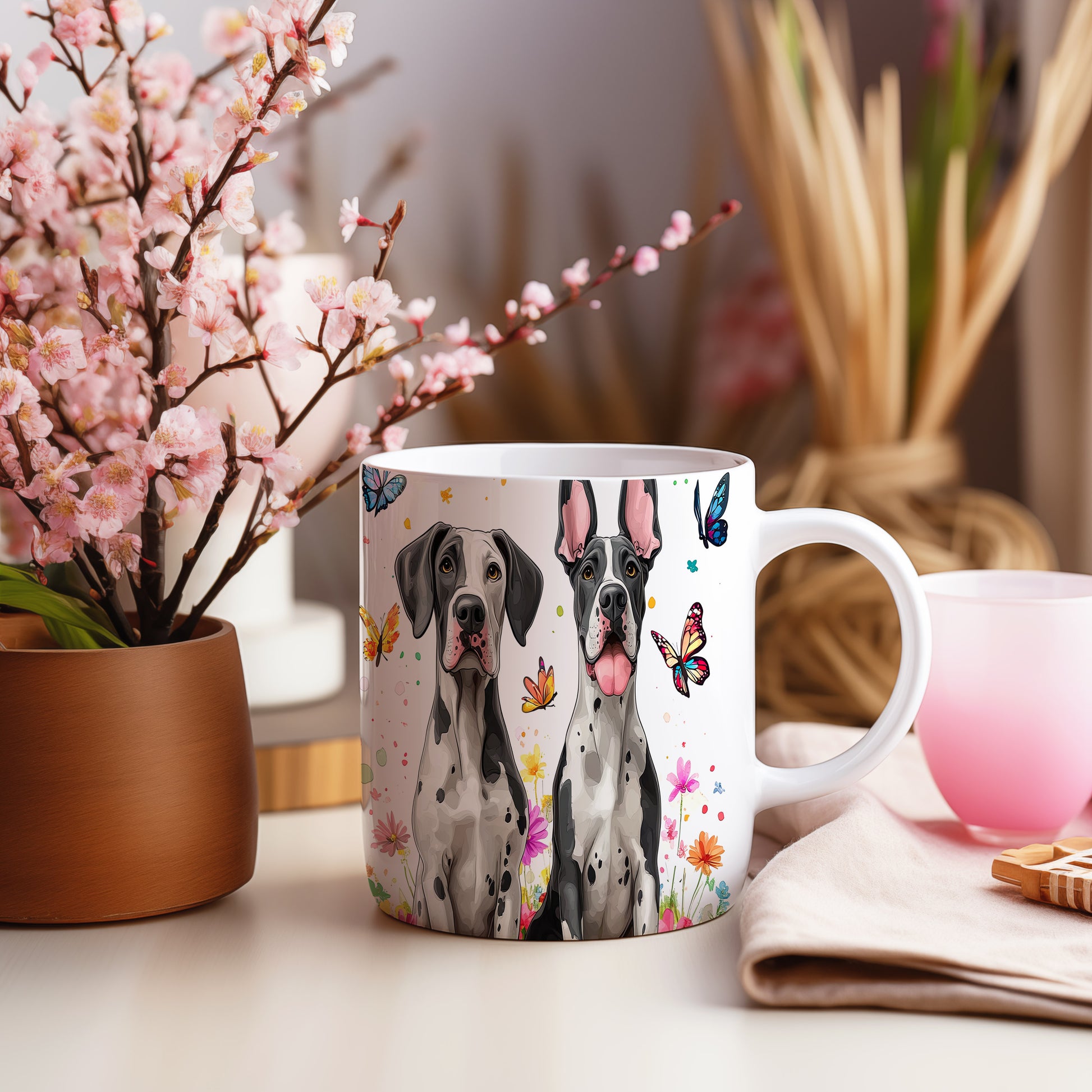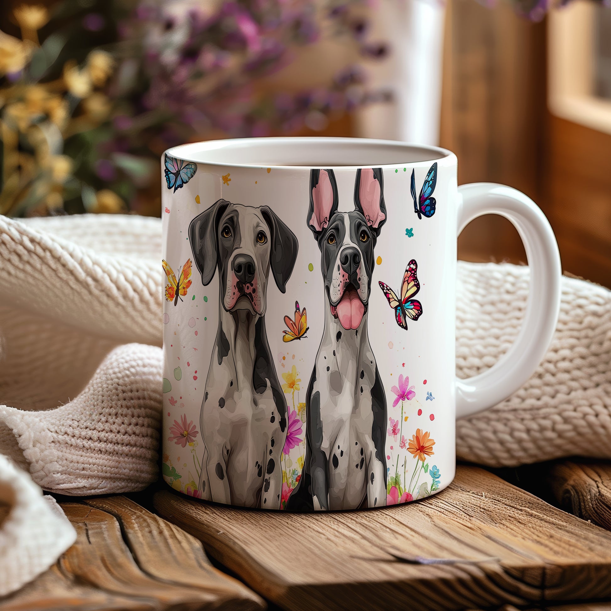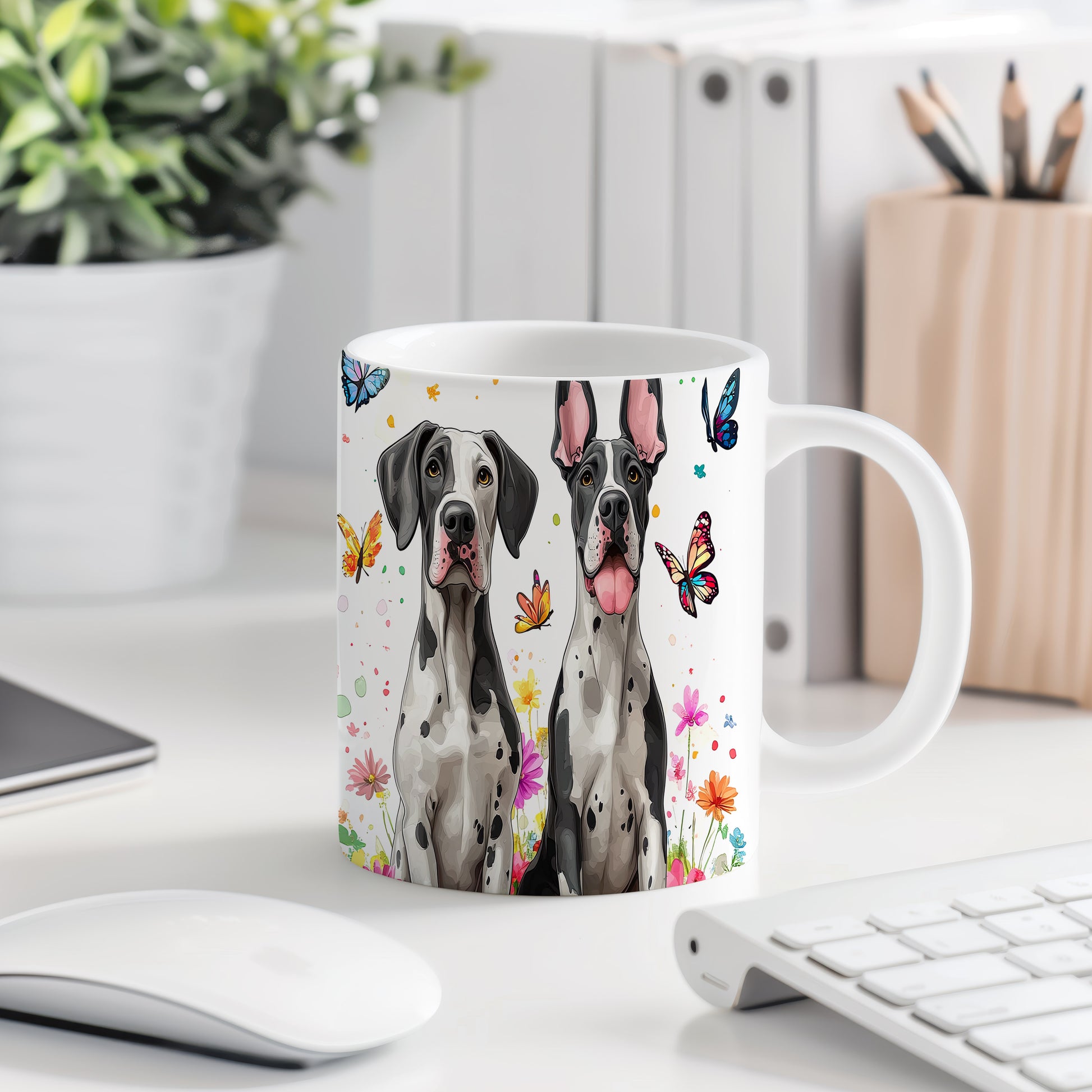 Tento hrnek zobrazuje elegantní dogy obklopené barevnými květinami a motýly. Je ideální pro milovníky psů a přírody, skvělý tip na dárek pro přátele nebo rodinu. Materiál: keramika. Objem: 330 ml. Vhodné do myčky i mikrovlnky. Díky svému designu přináší do každodenního pití radost a styl.